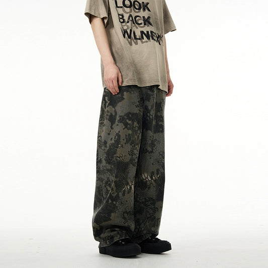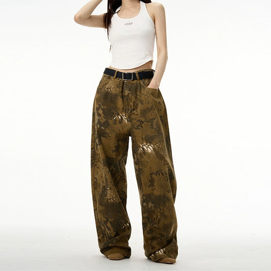 Camouflage Mix Damage Wide Leg Denim Jeans WN16353