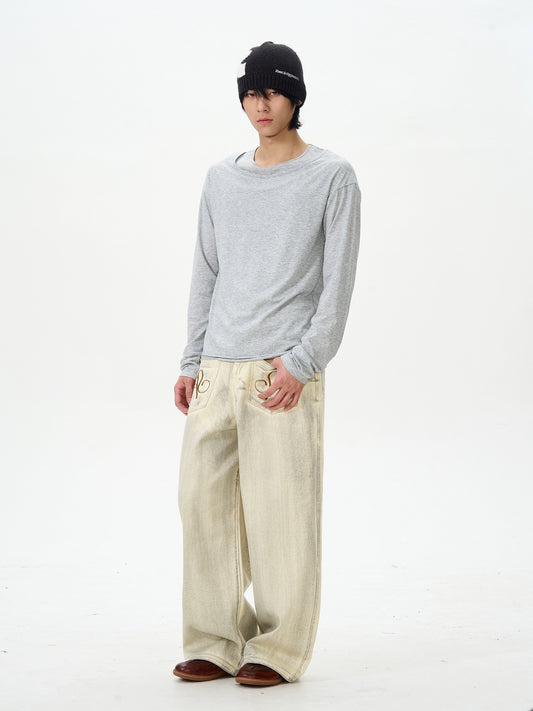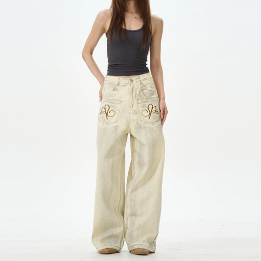 Wide-leg Patchwork Ring Damage Denim Jeans WN18280-K