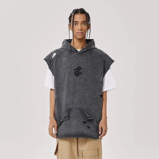 Double Layer Washed Look Hooded Sleeveless T-Shirt WN17837
