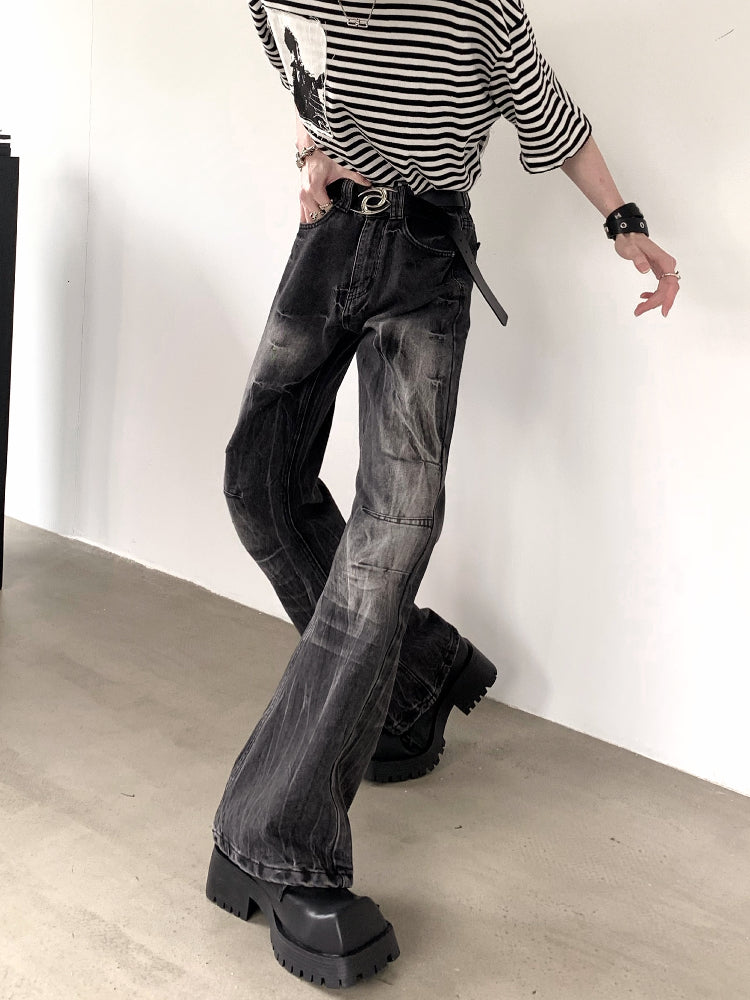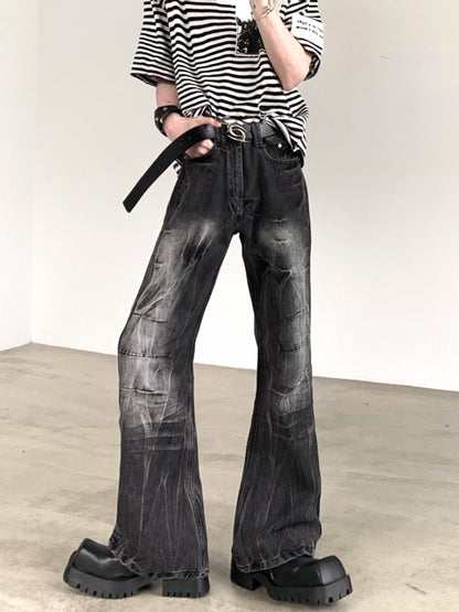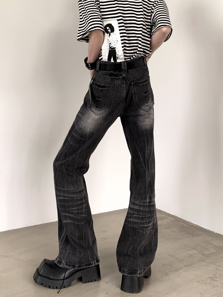 Wrinkled Lightning Pattern Washed Flare Denim Jeans WN15427