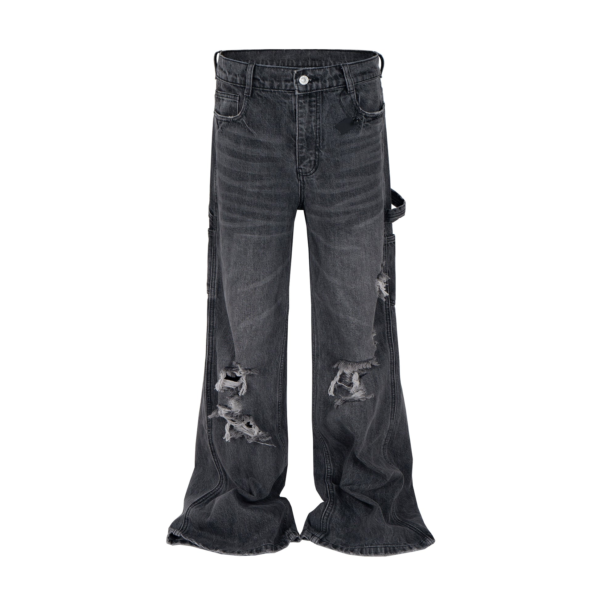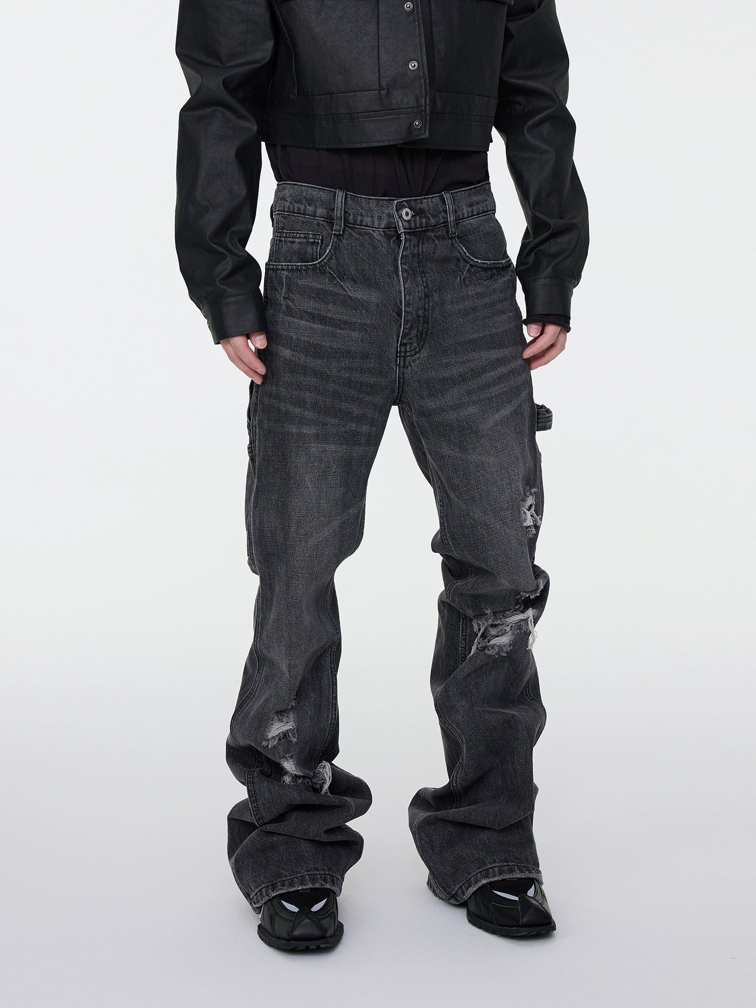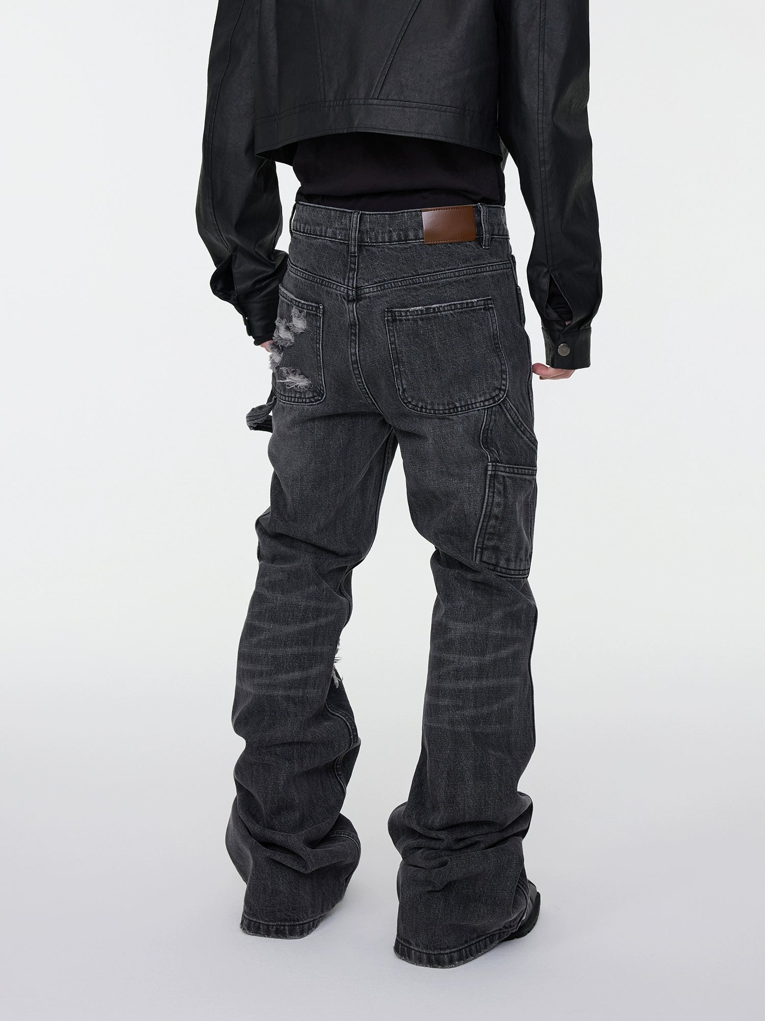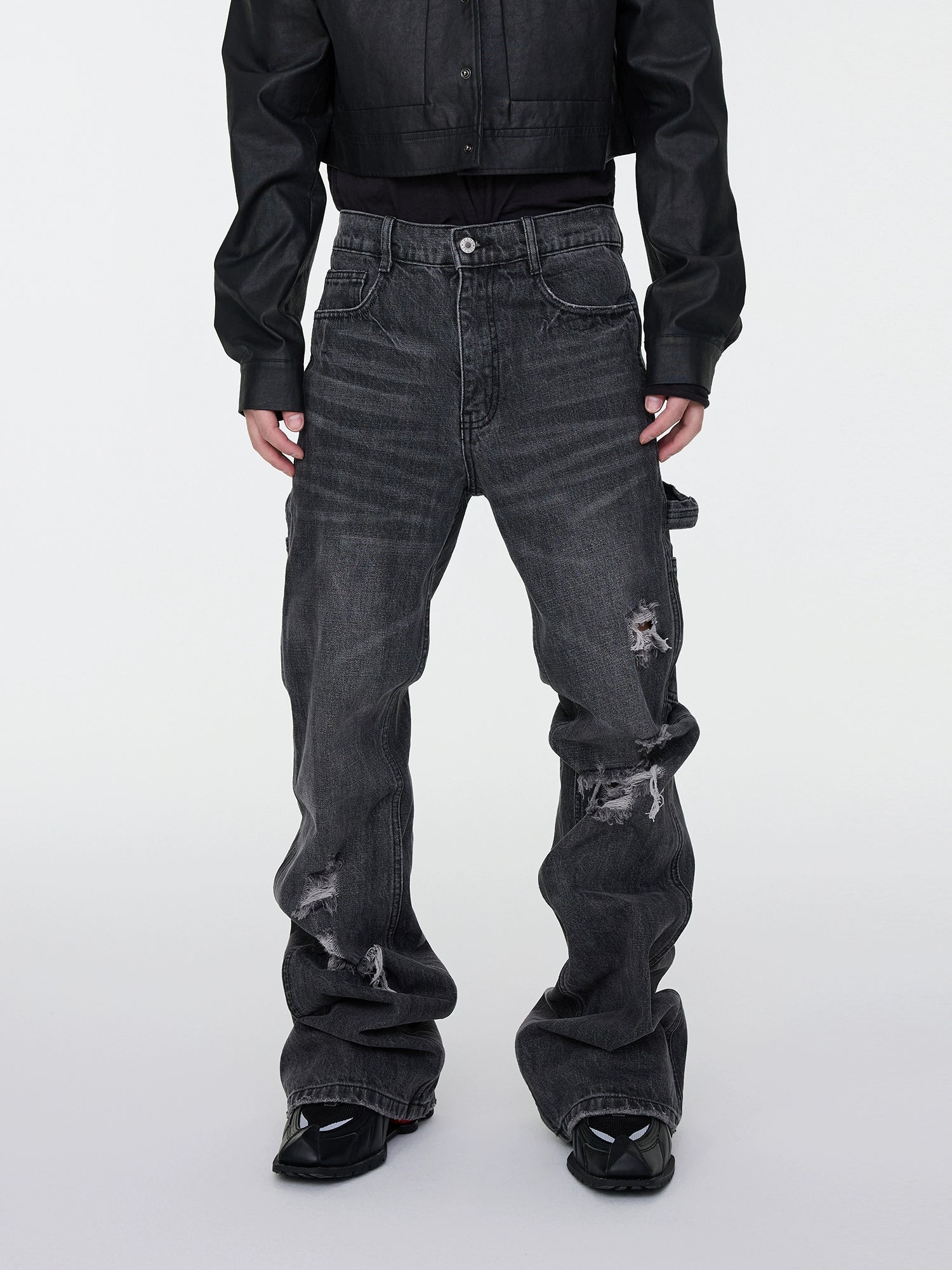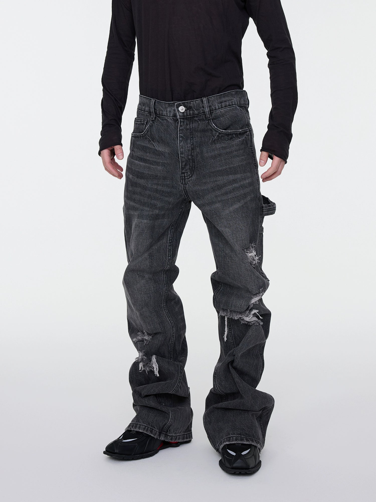 Whisker Rip Damage Stacked Flare Denim Jeans WN16949