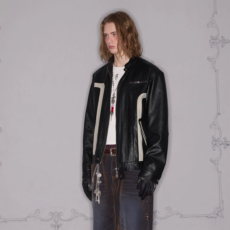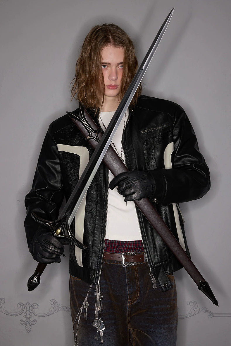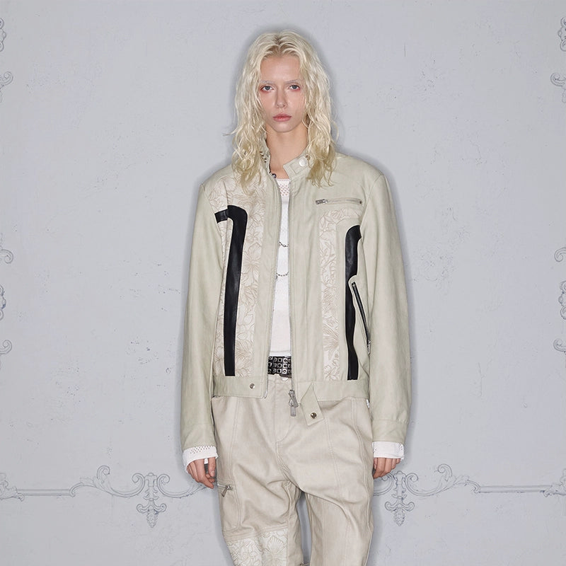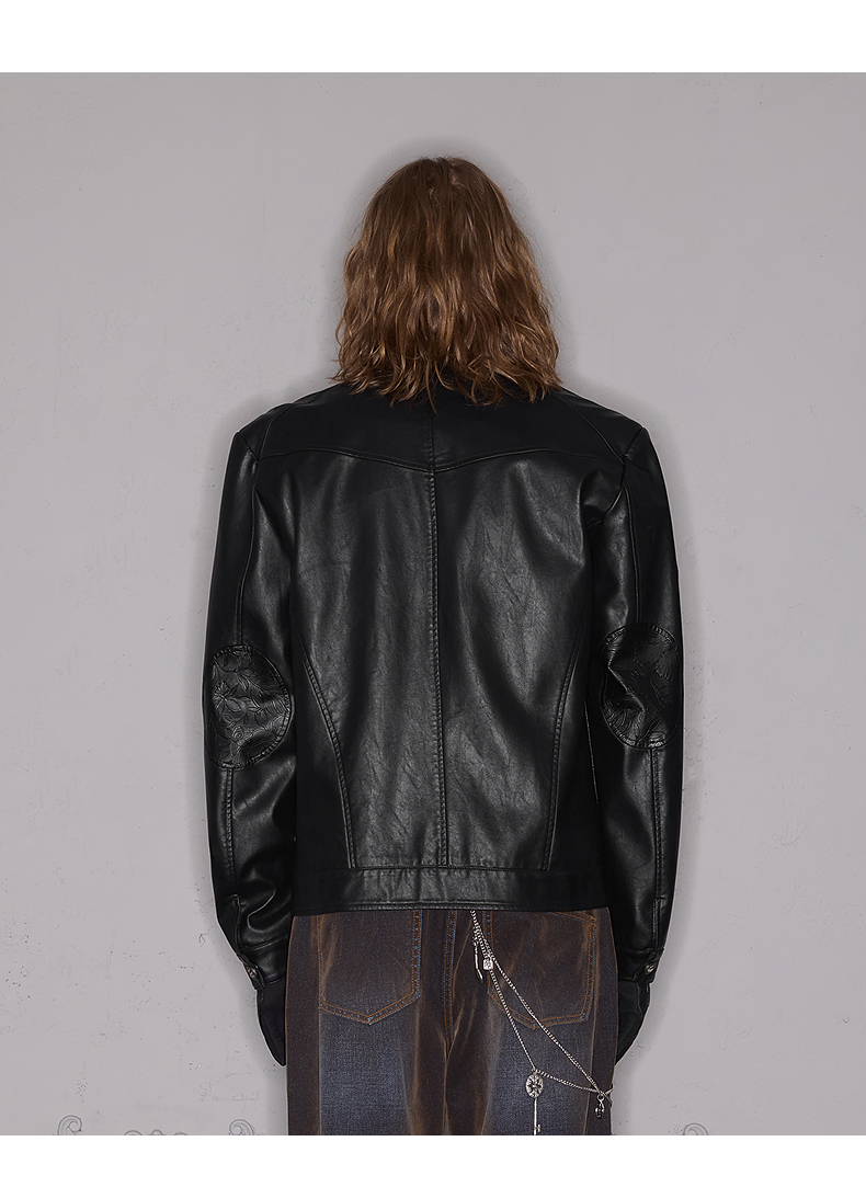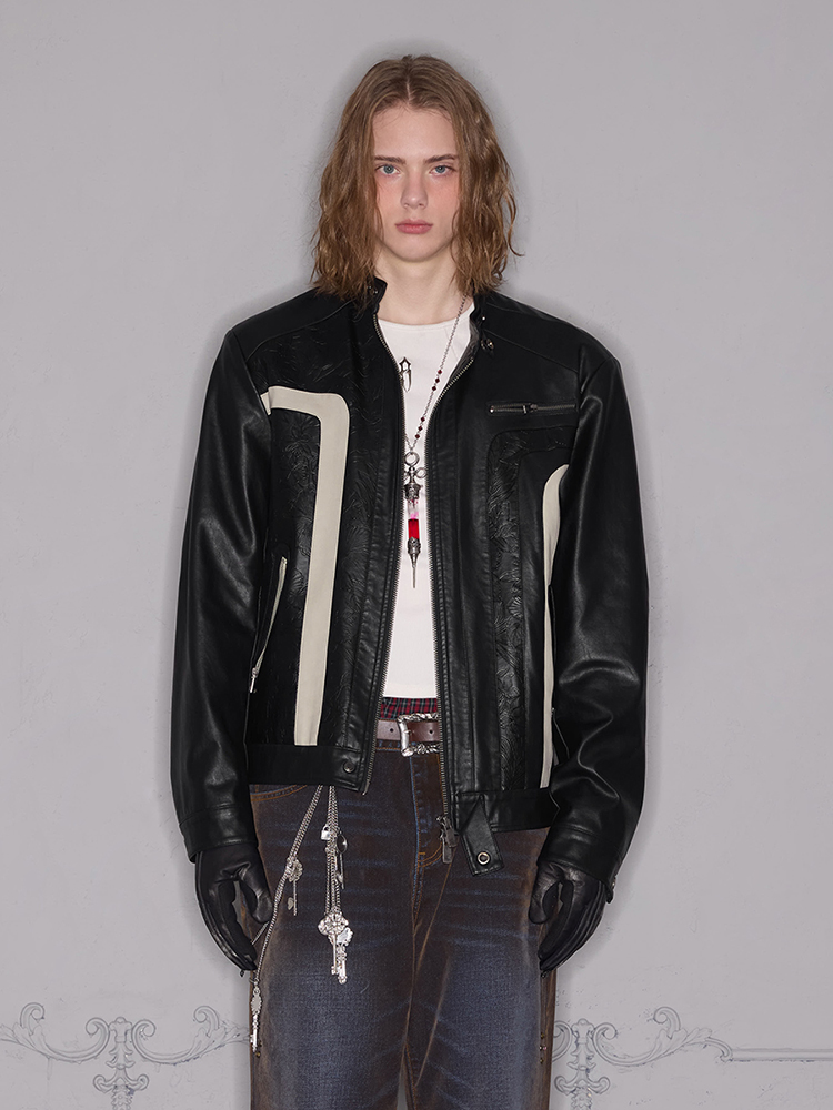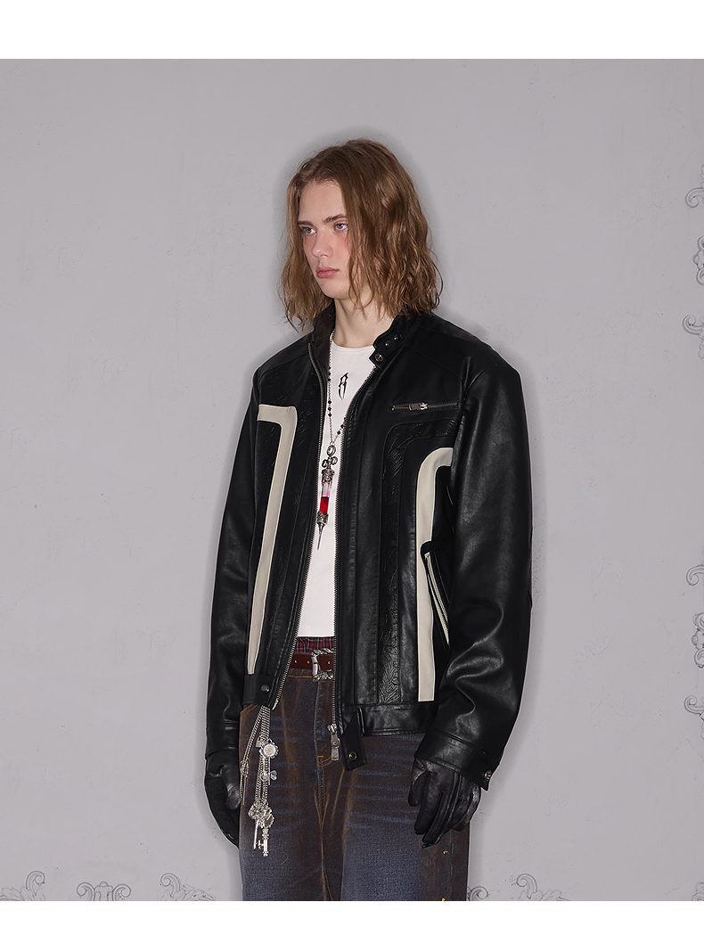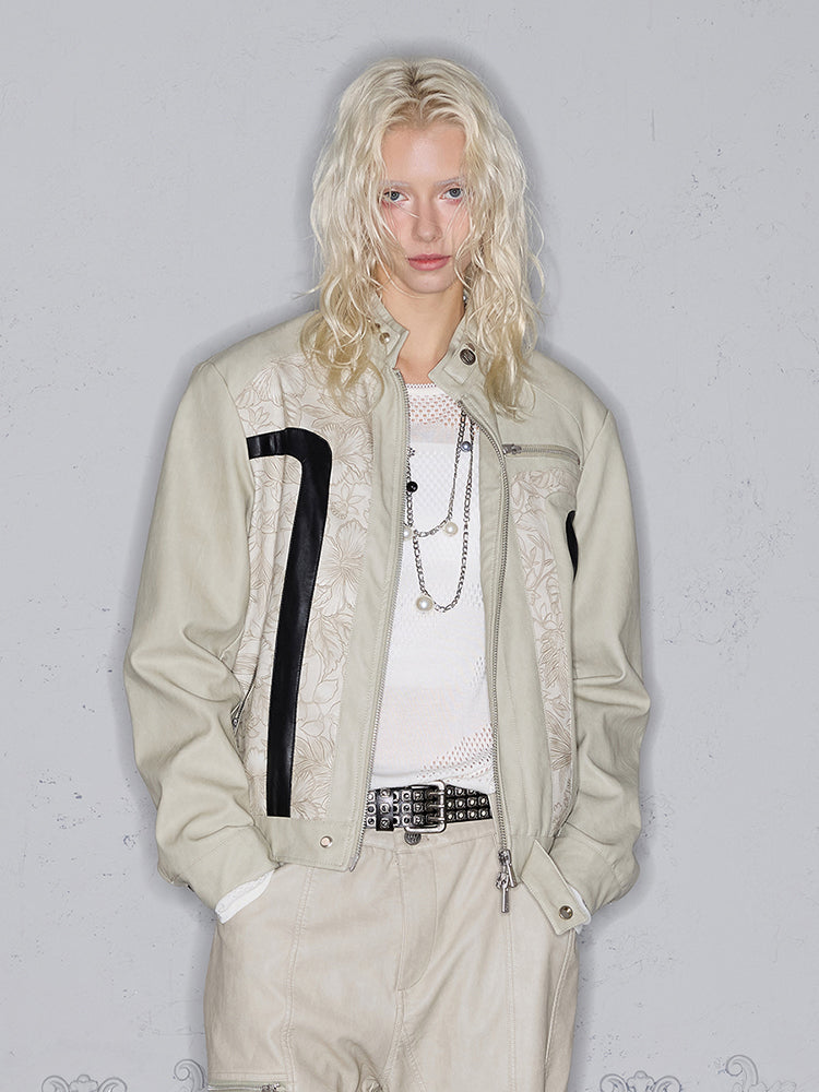 3D Patchwork Print Panel PU Leather Zipper Jacket WN17875