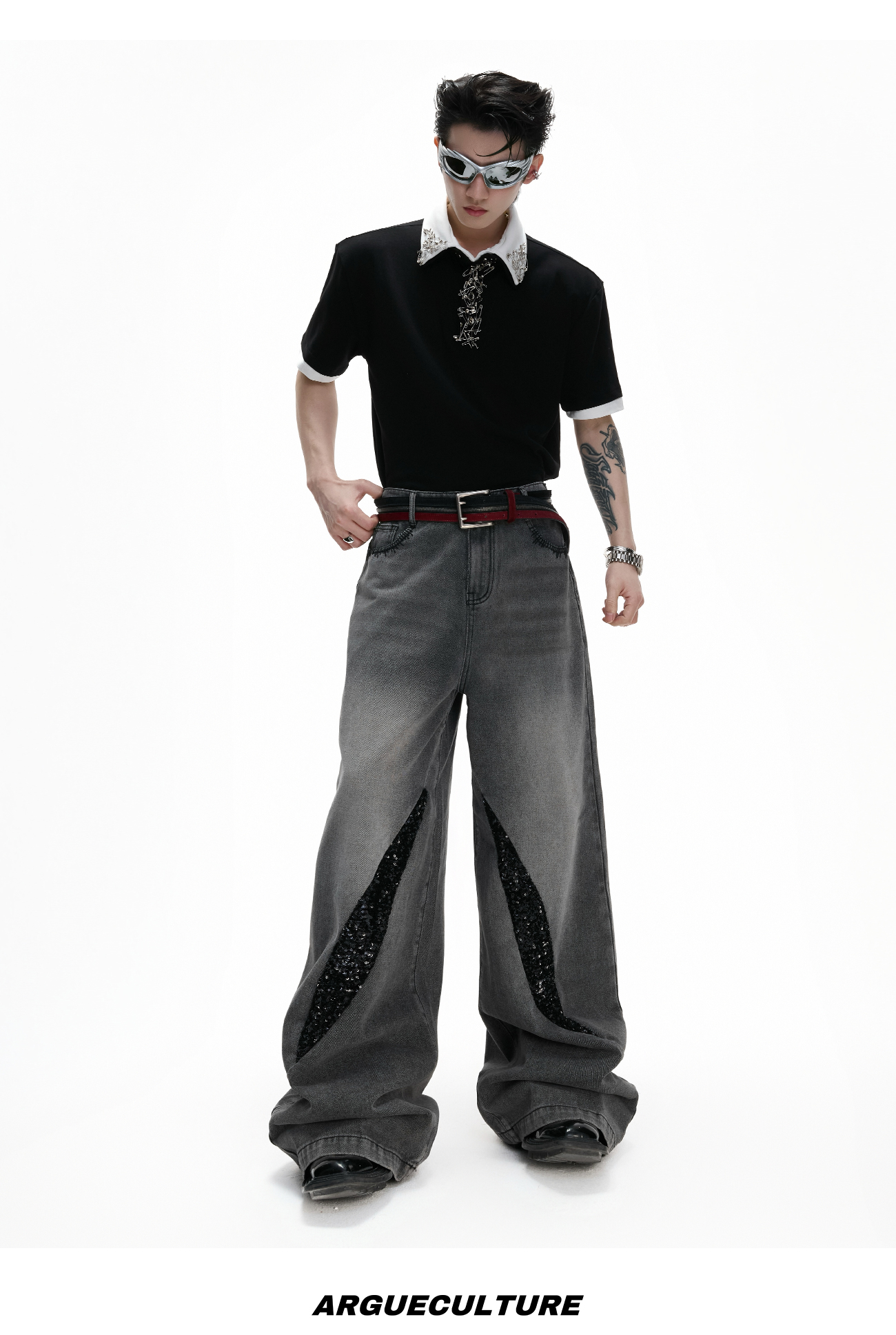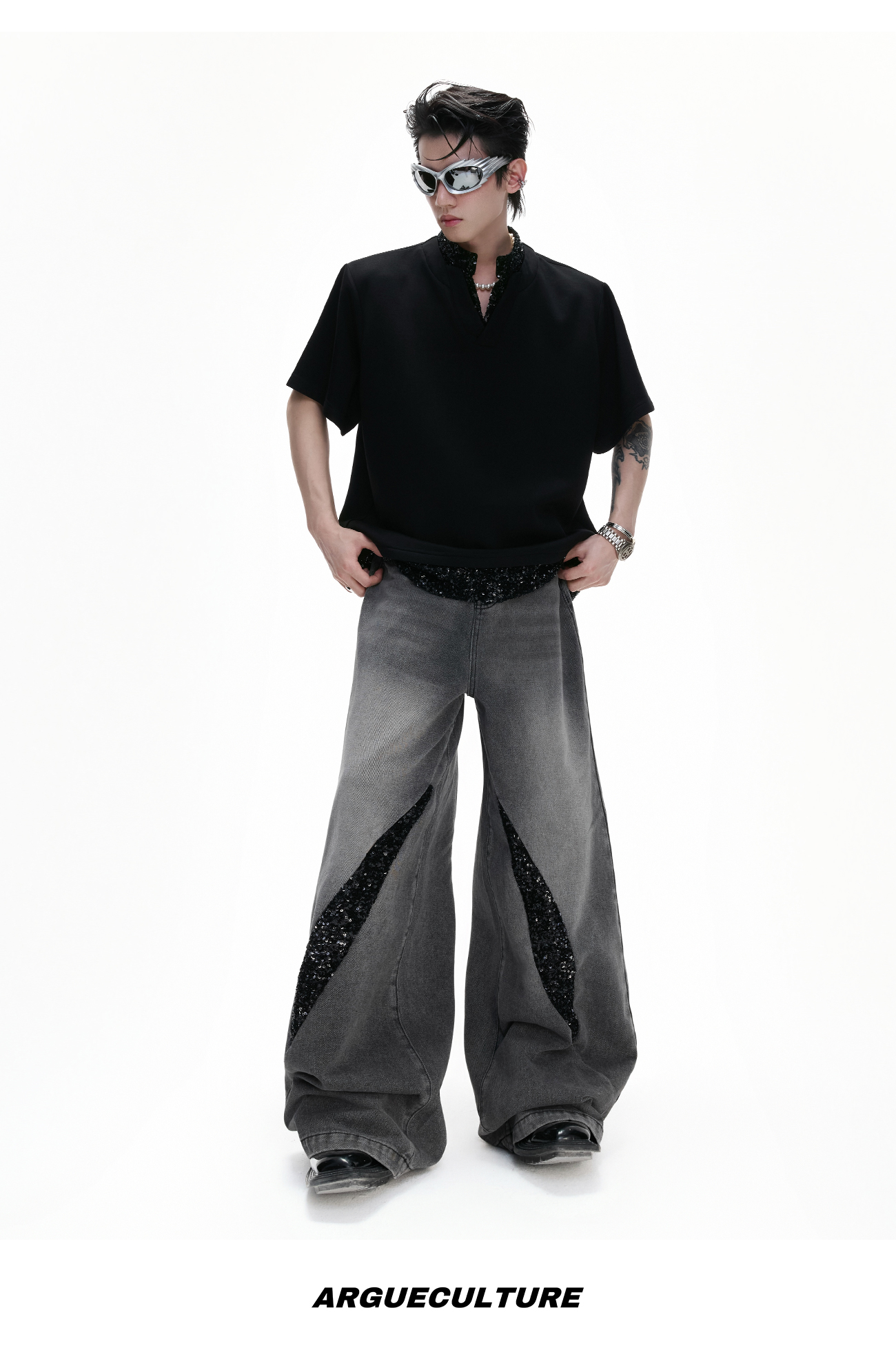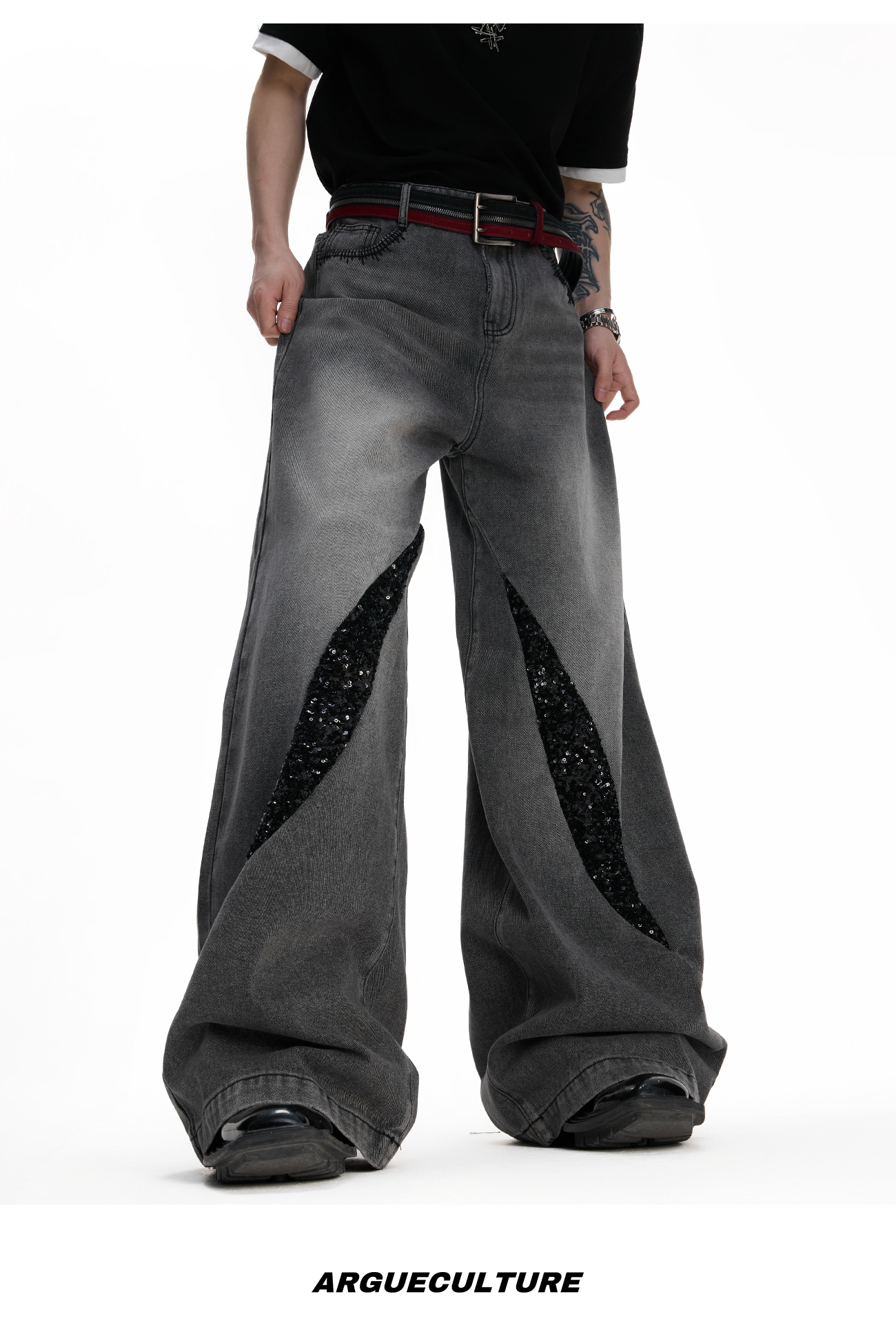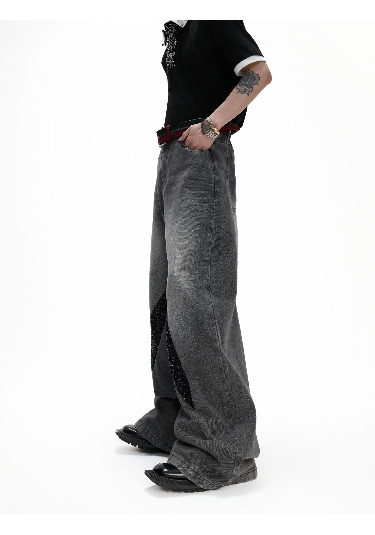 Washed Sequin Damage Straight Denim Jeans WN20670