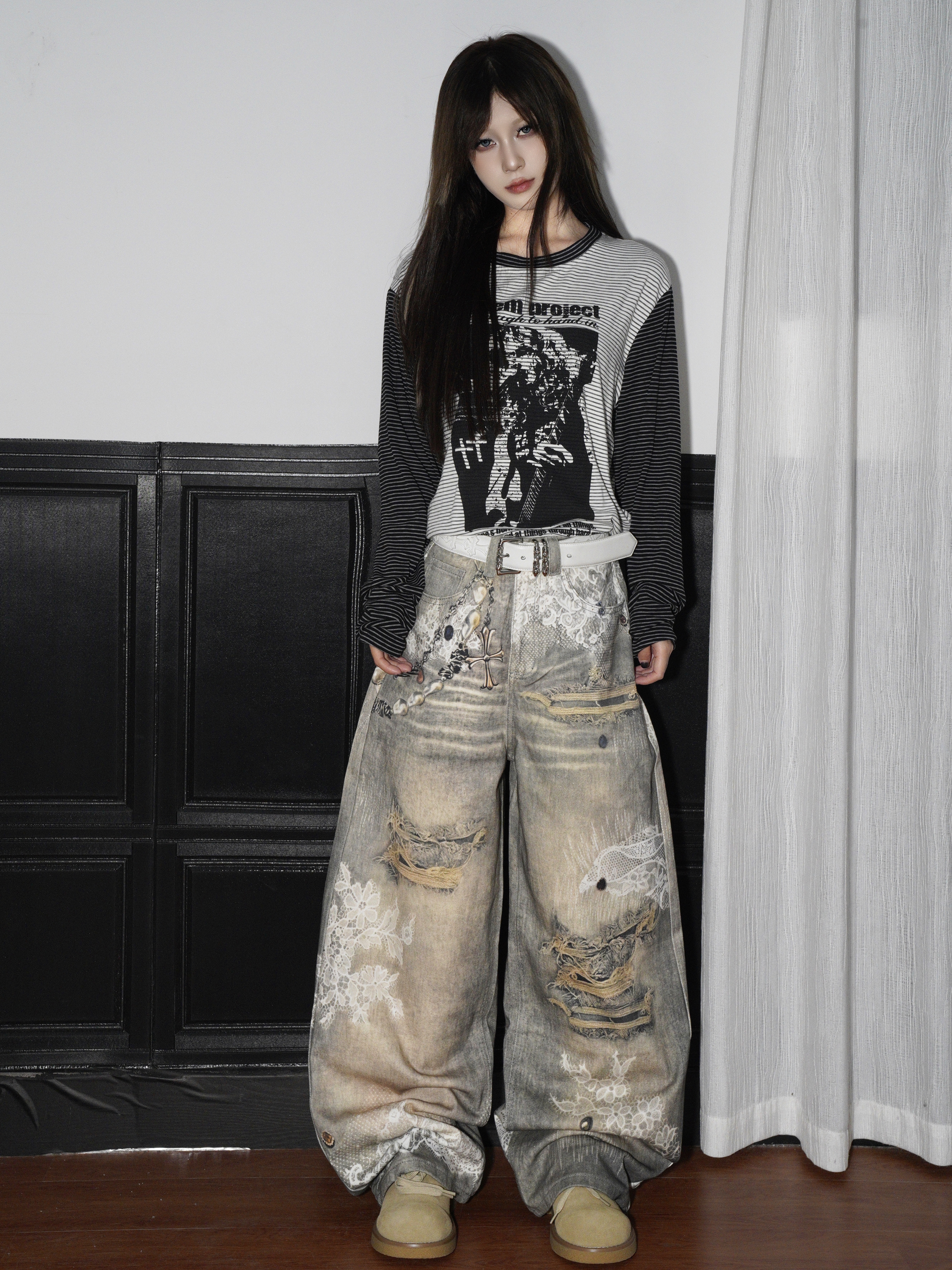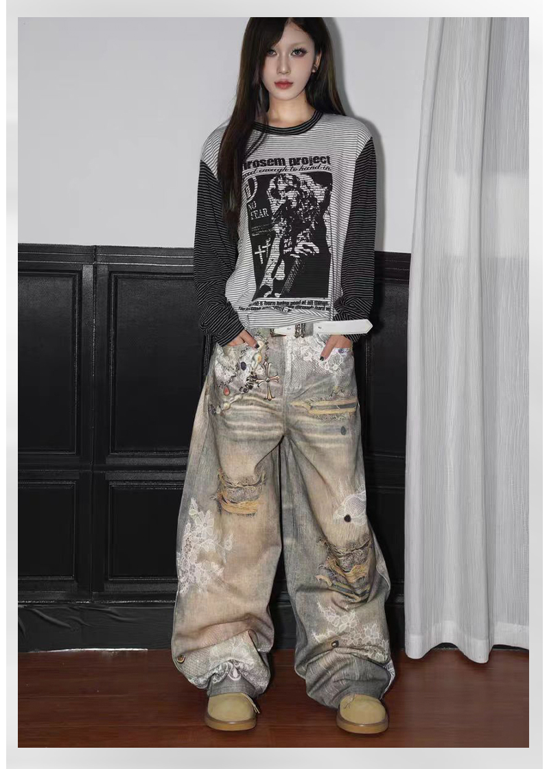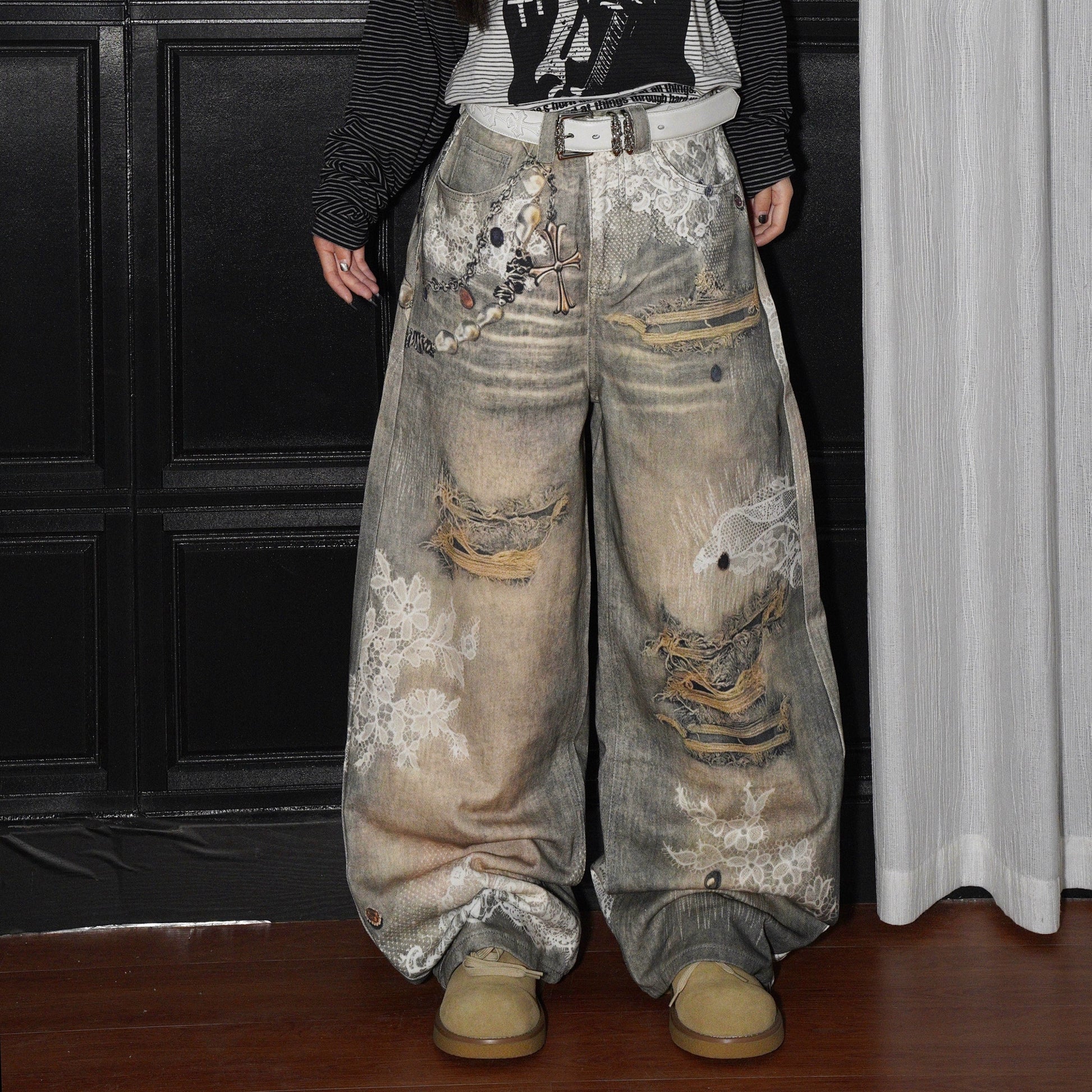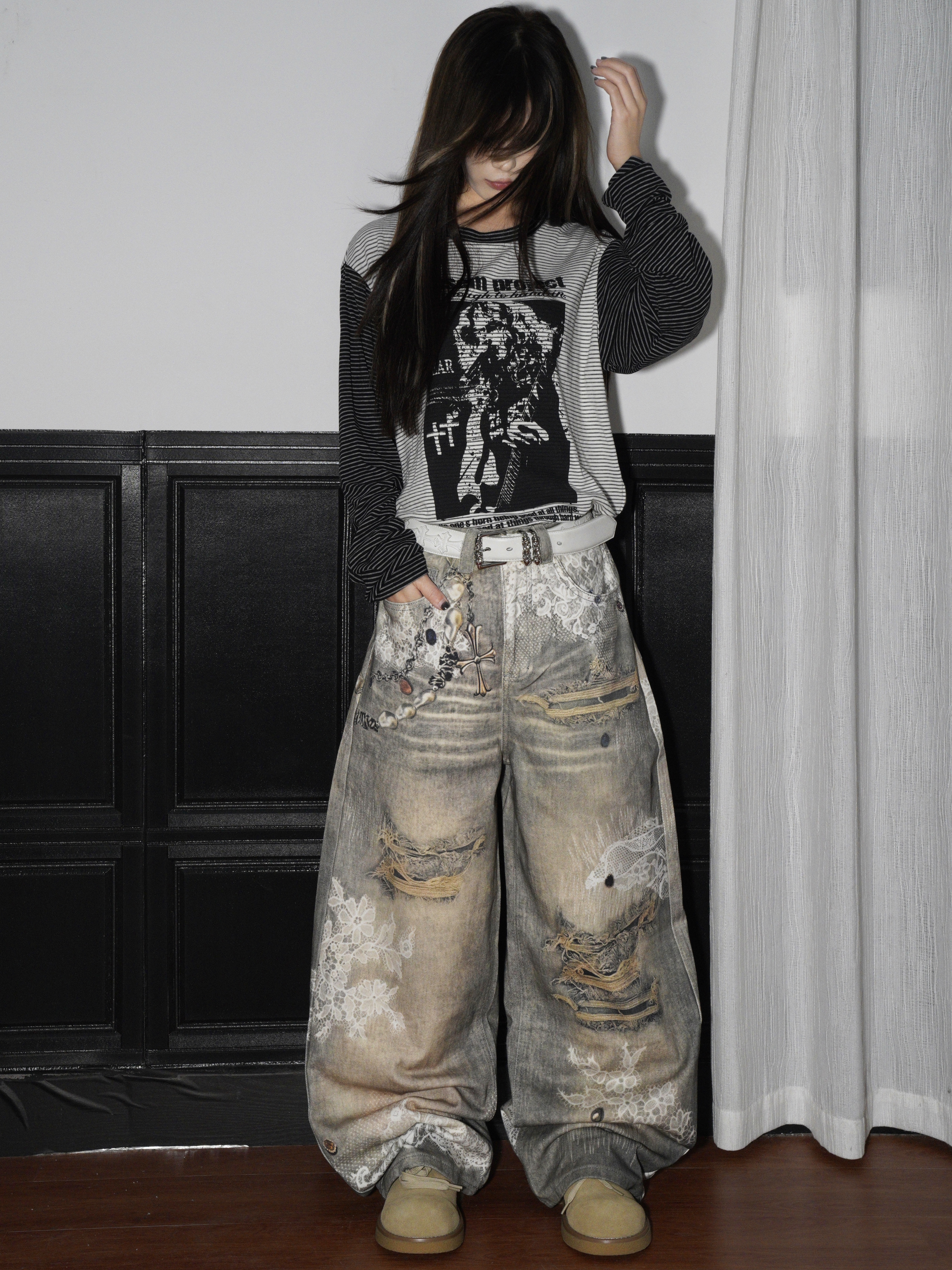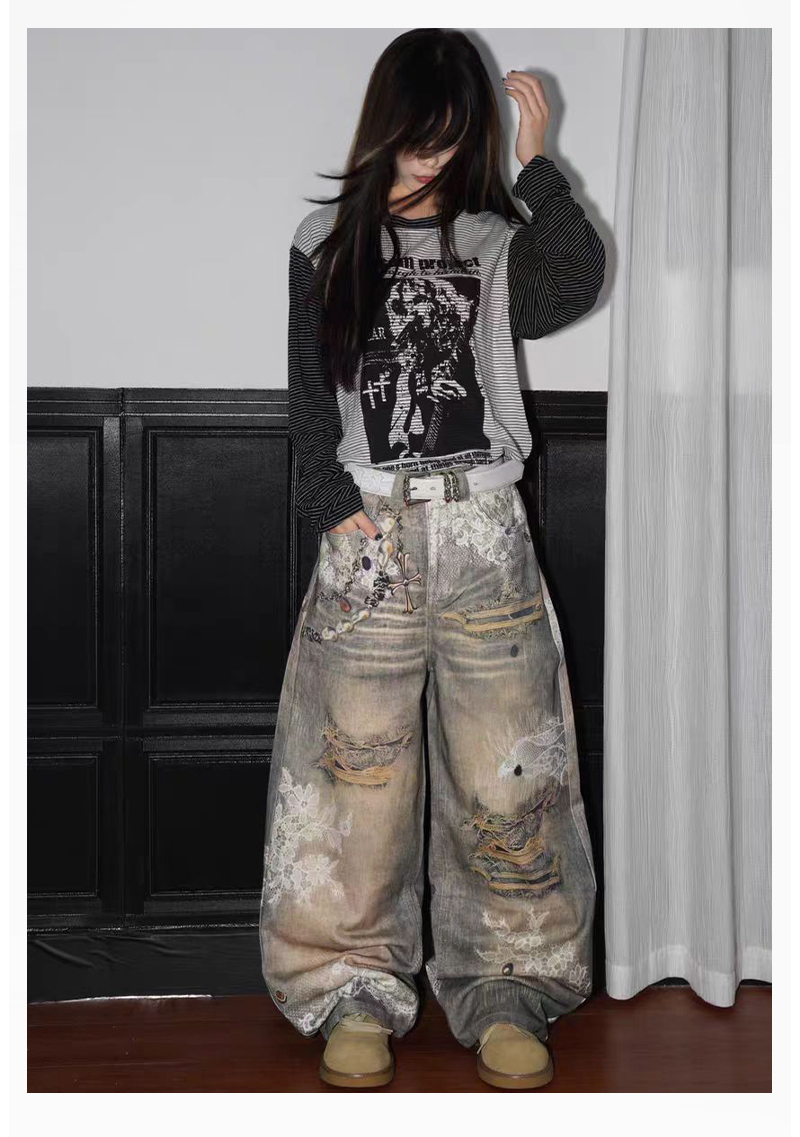 Cross Print Damage Wide Leg Denim Jeans WN22227