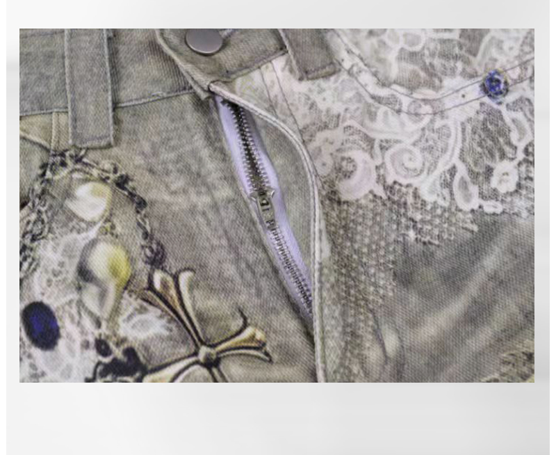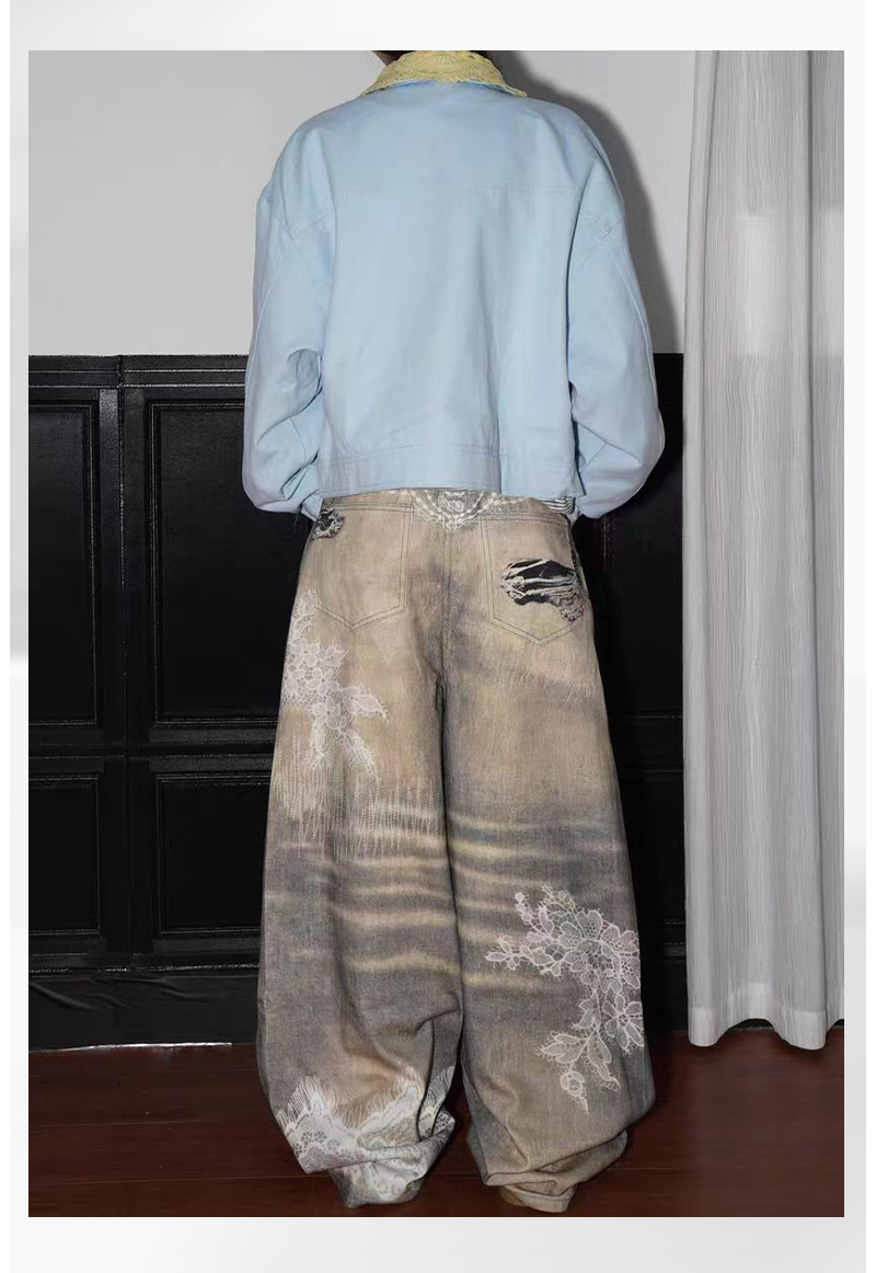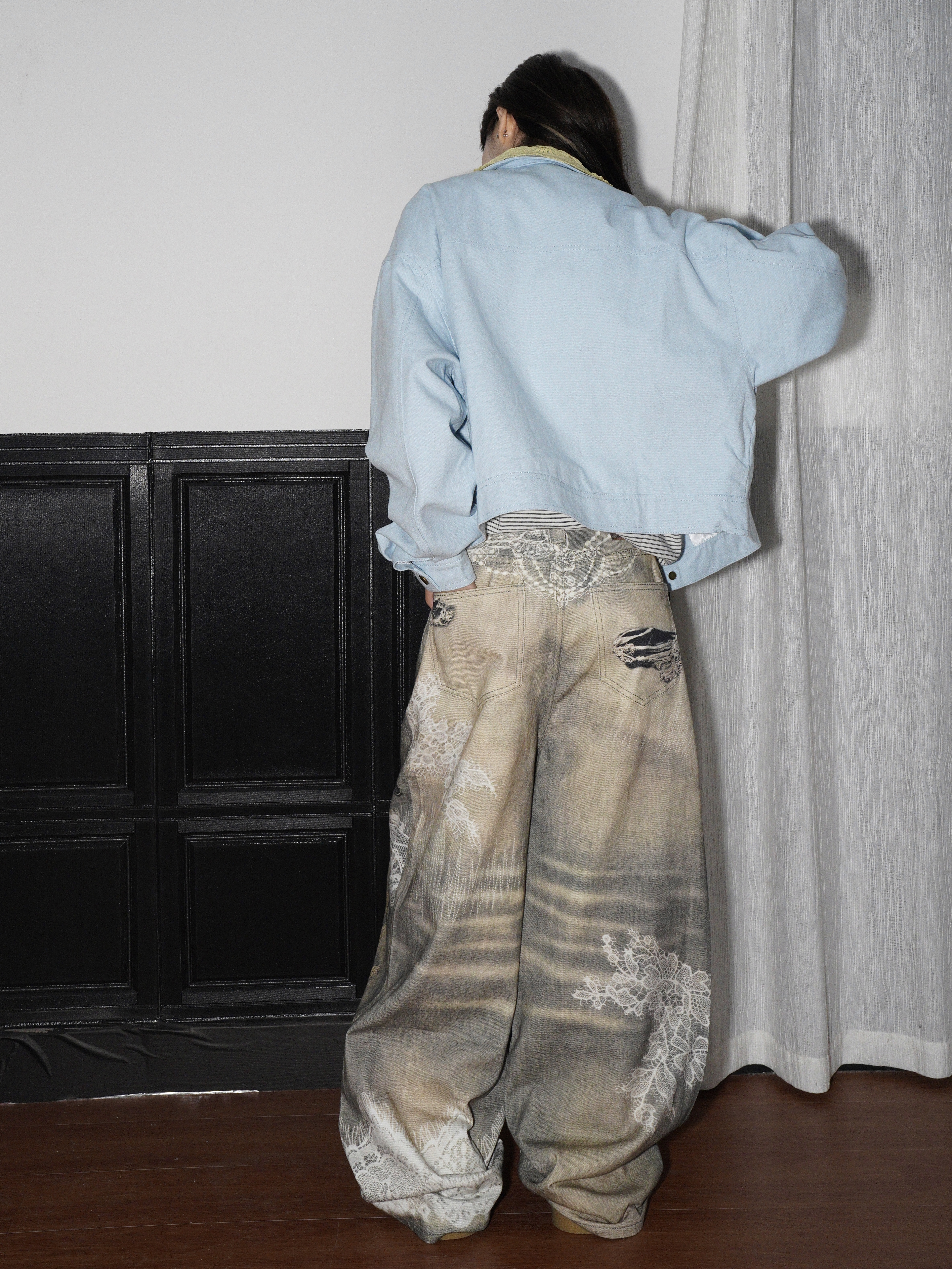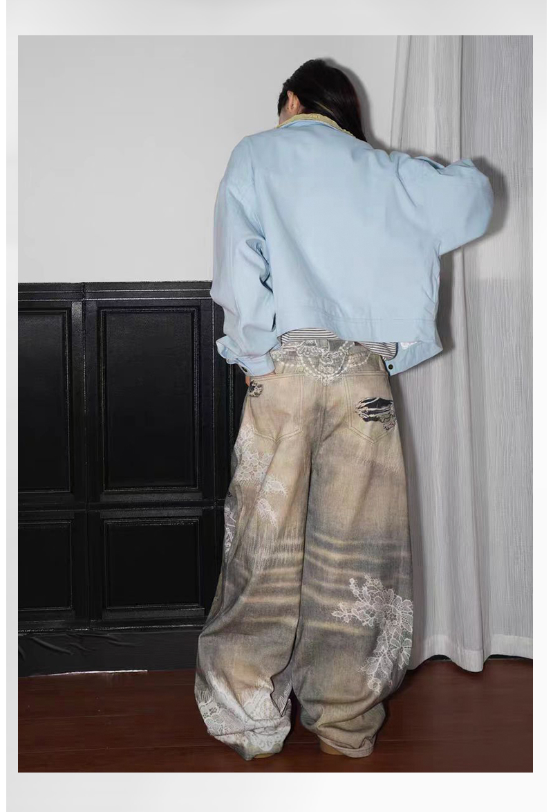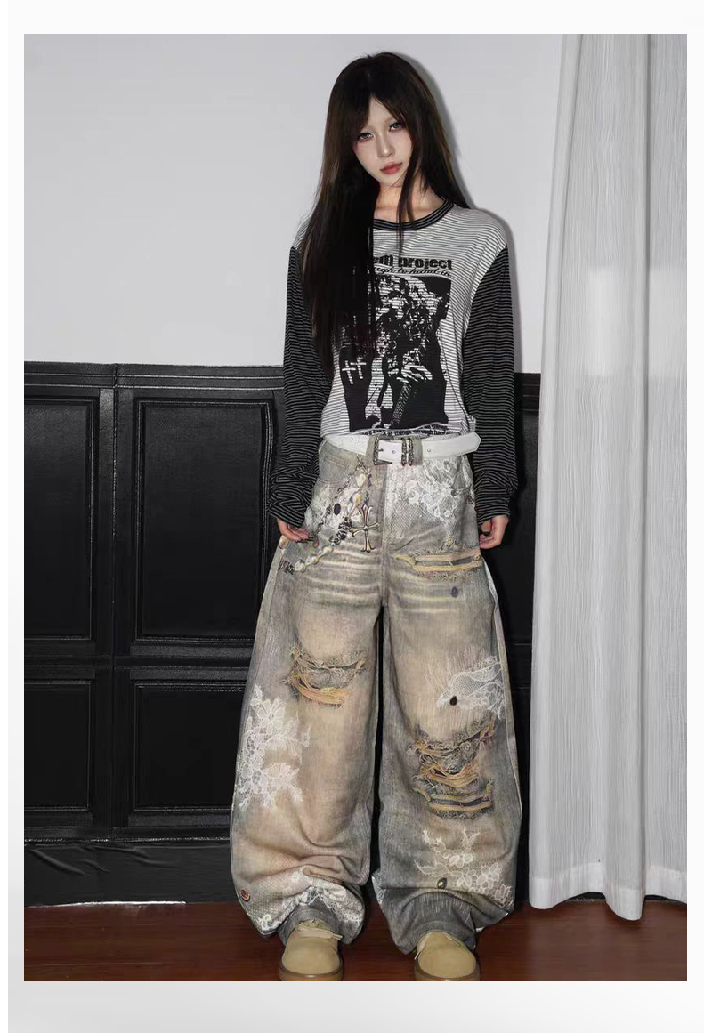 Cross Print Damage Wide Leg Denim Jeans WN22227