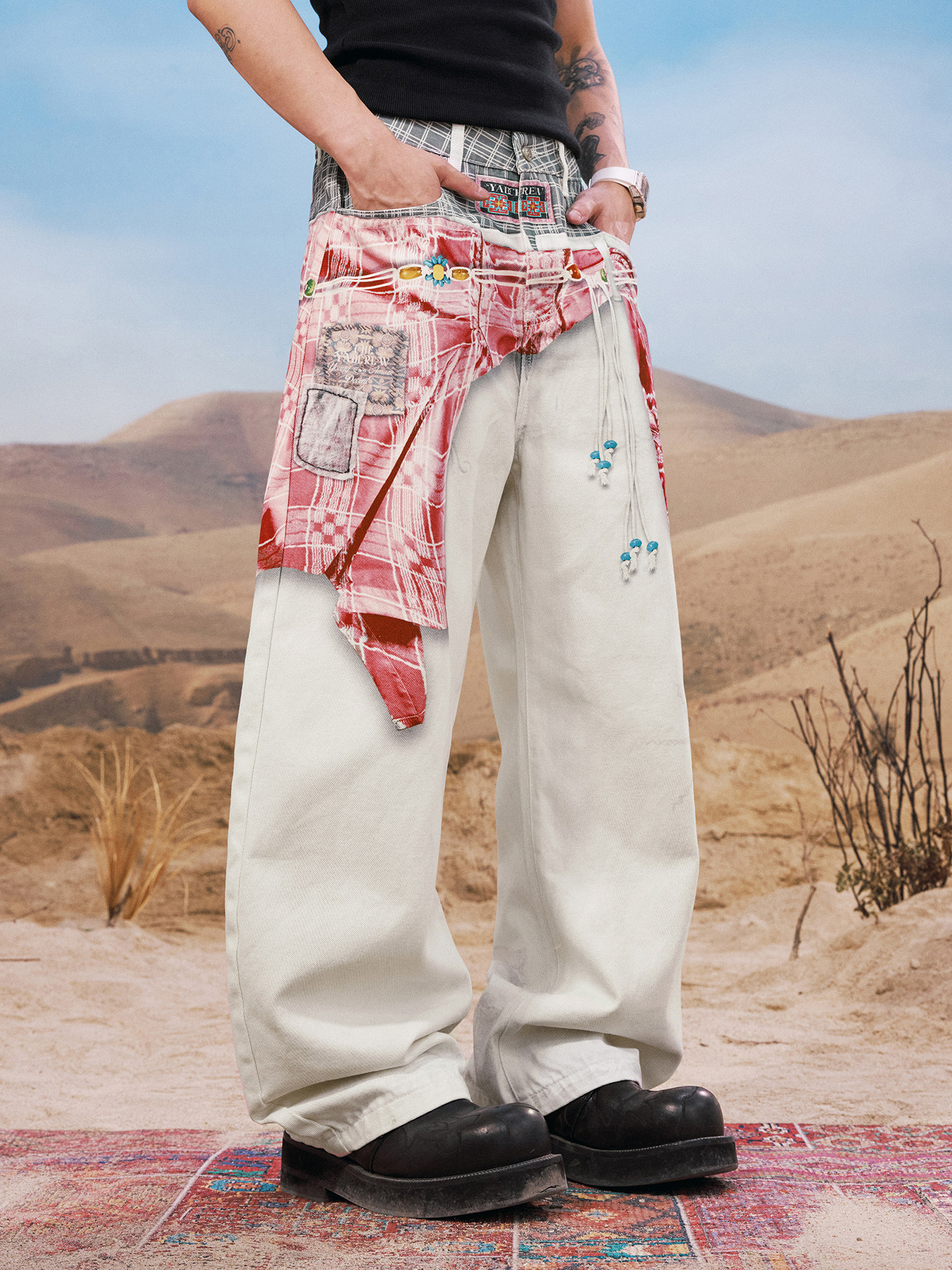 Mix Patchwork Print Wide Leg Denim Jeans WN23201