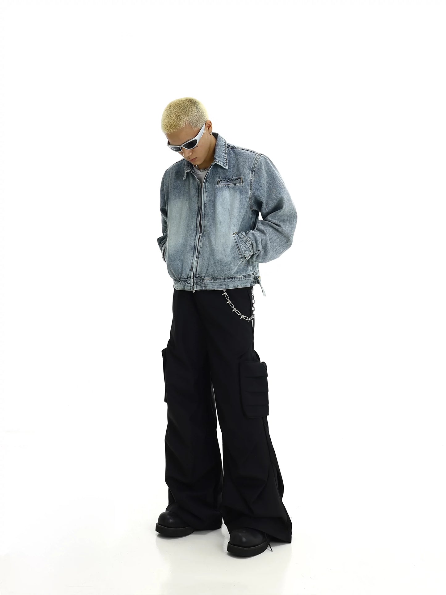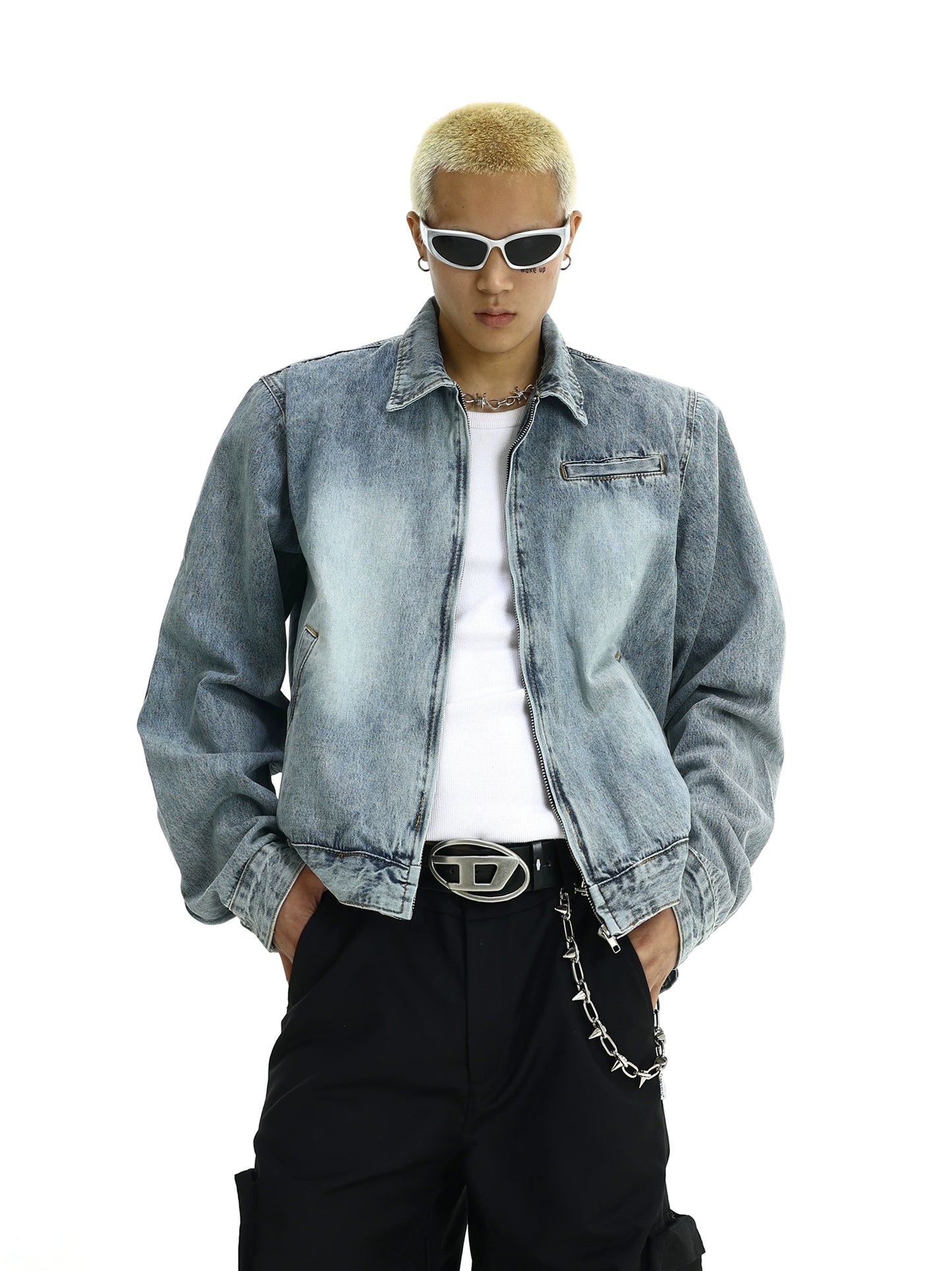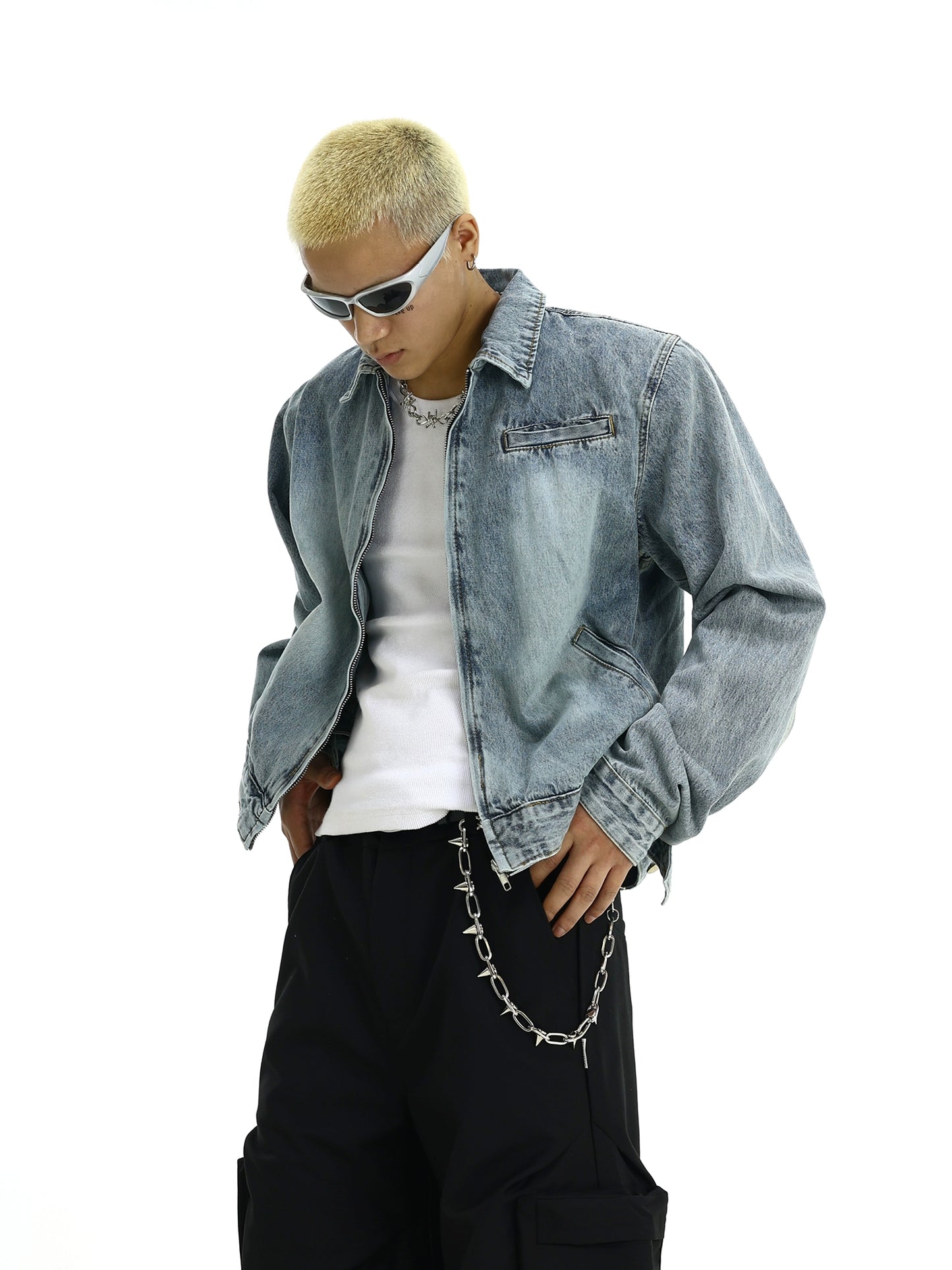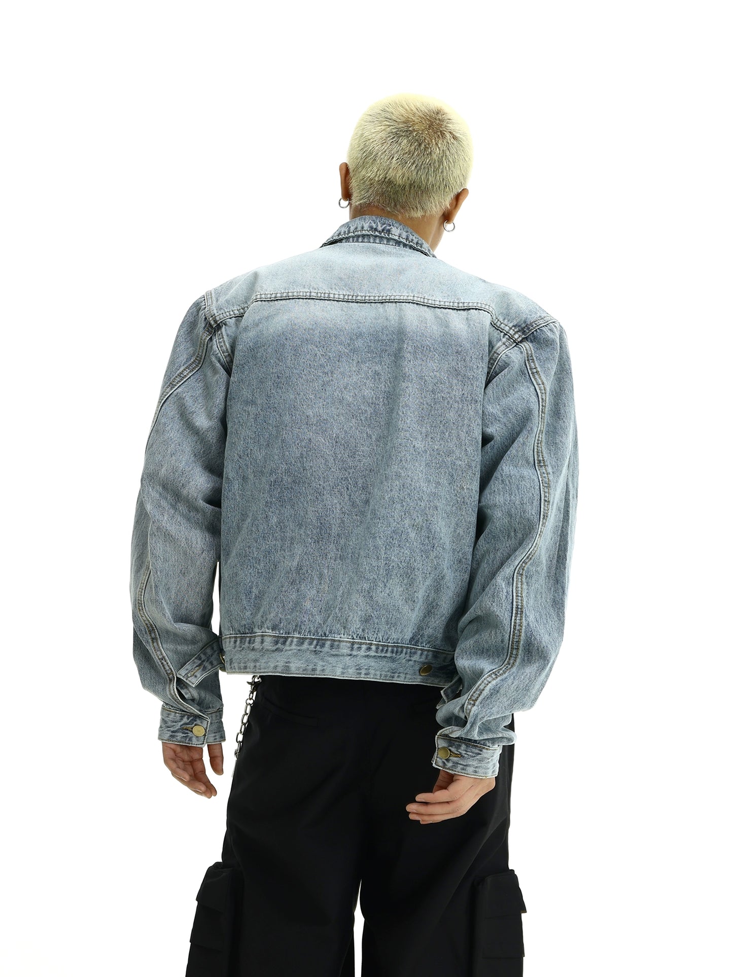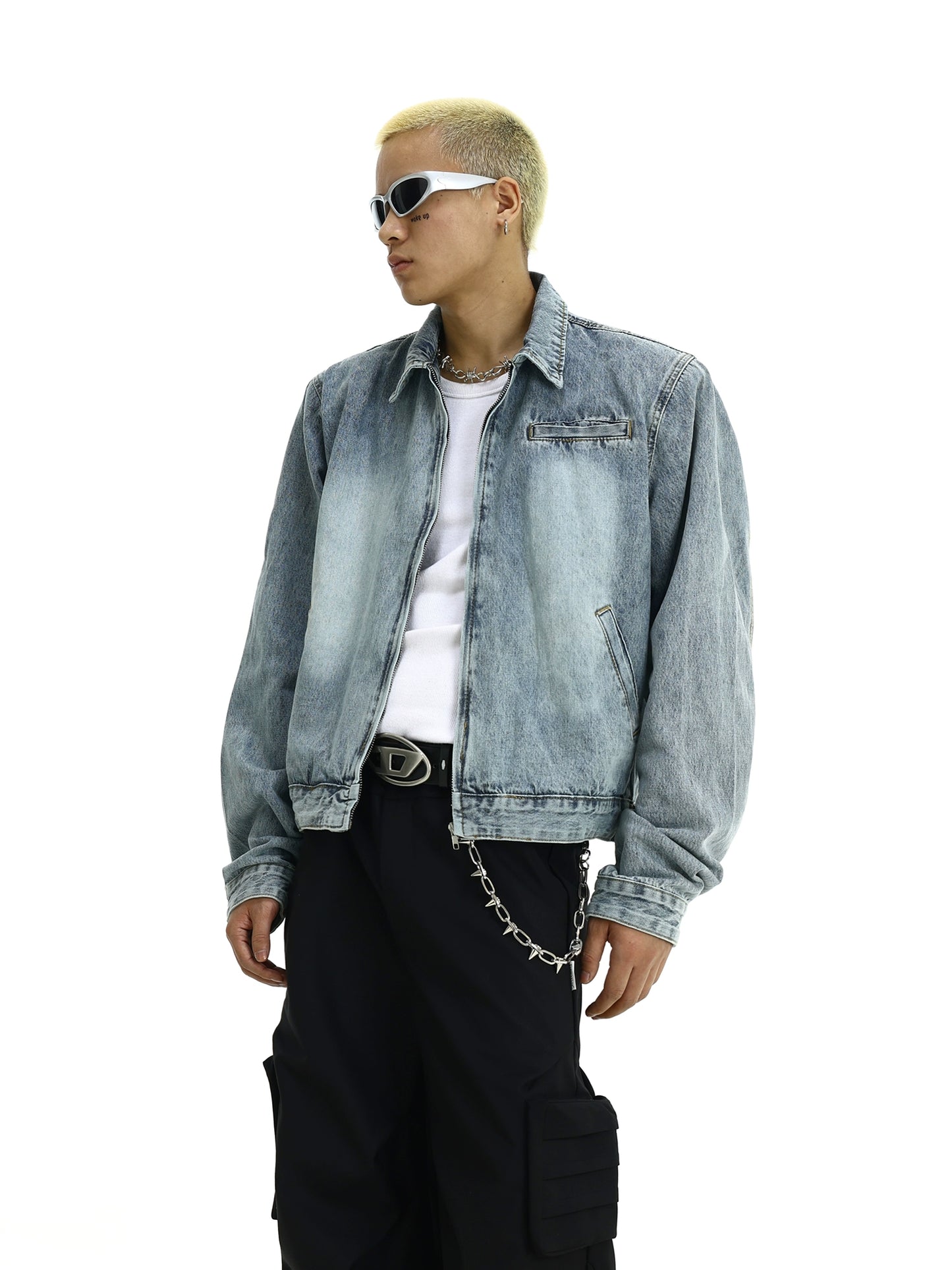 Washed Shoulder Pad Zipper Denim Jacket WN5820