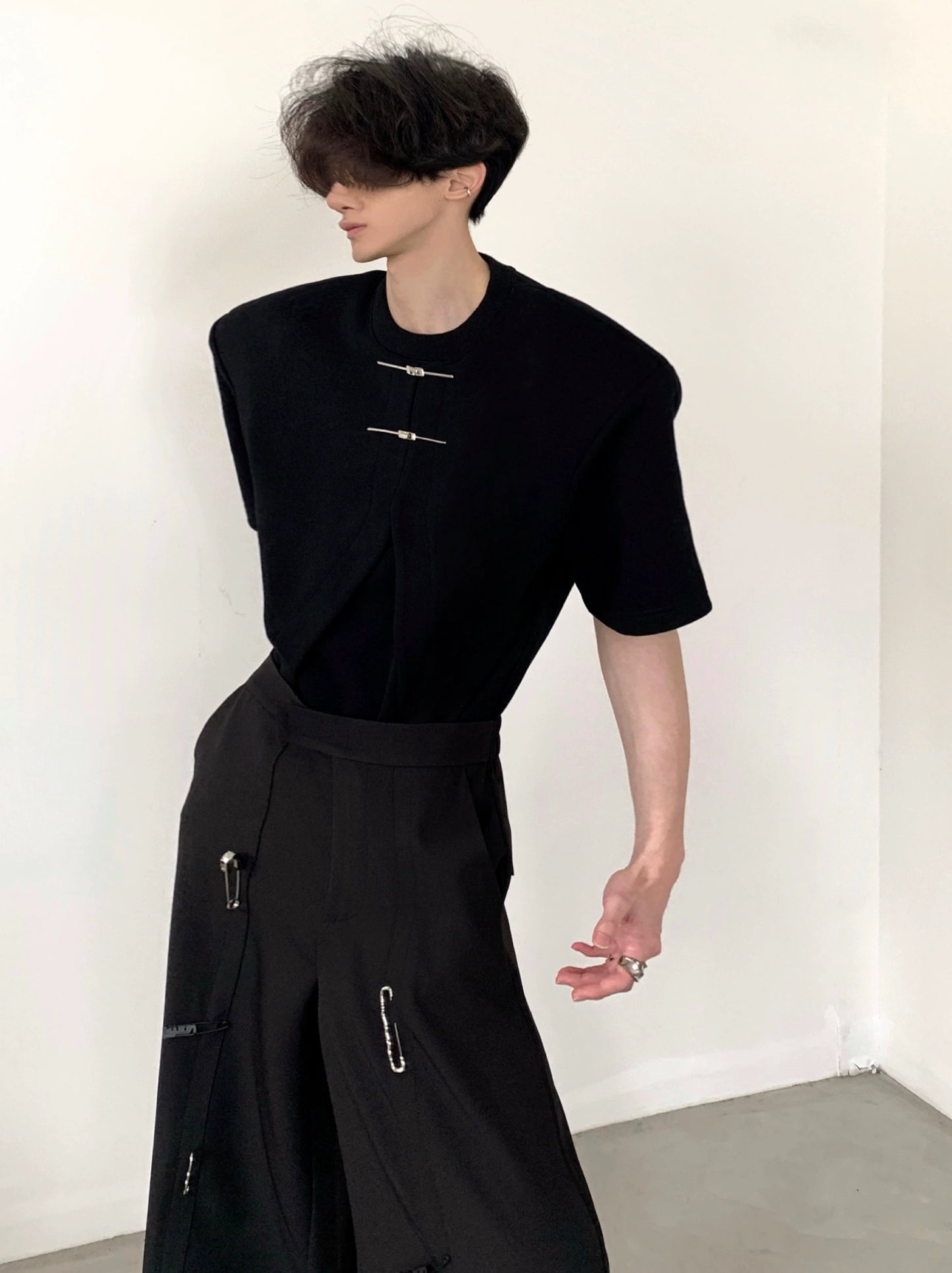 Metal Buckle Shoulder Pad Short Sleeve T-Shirt WN5987