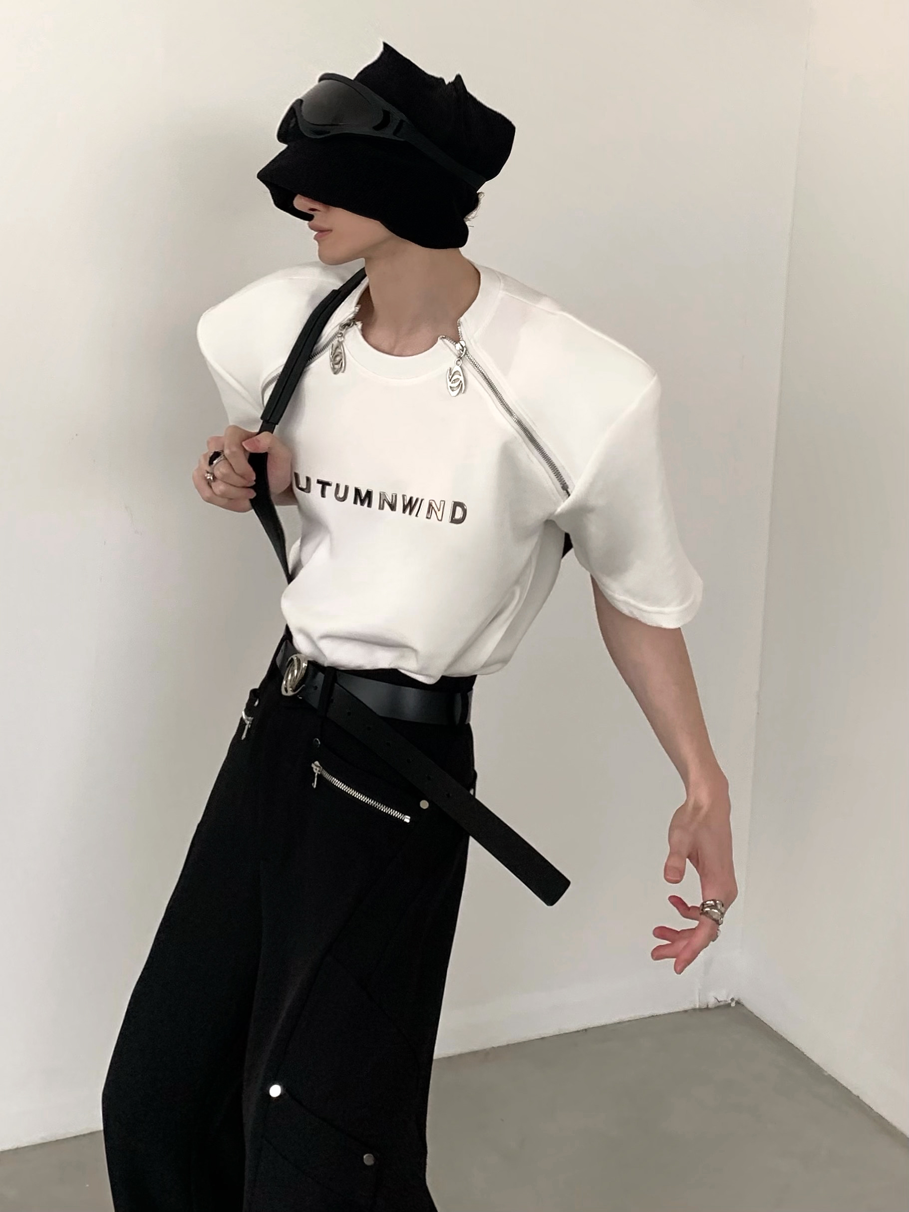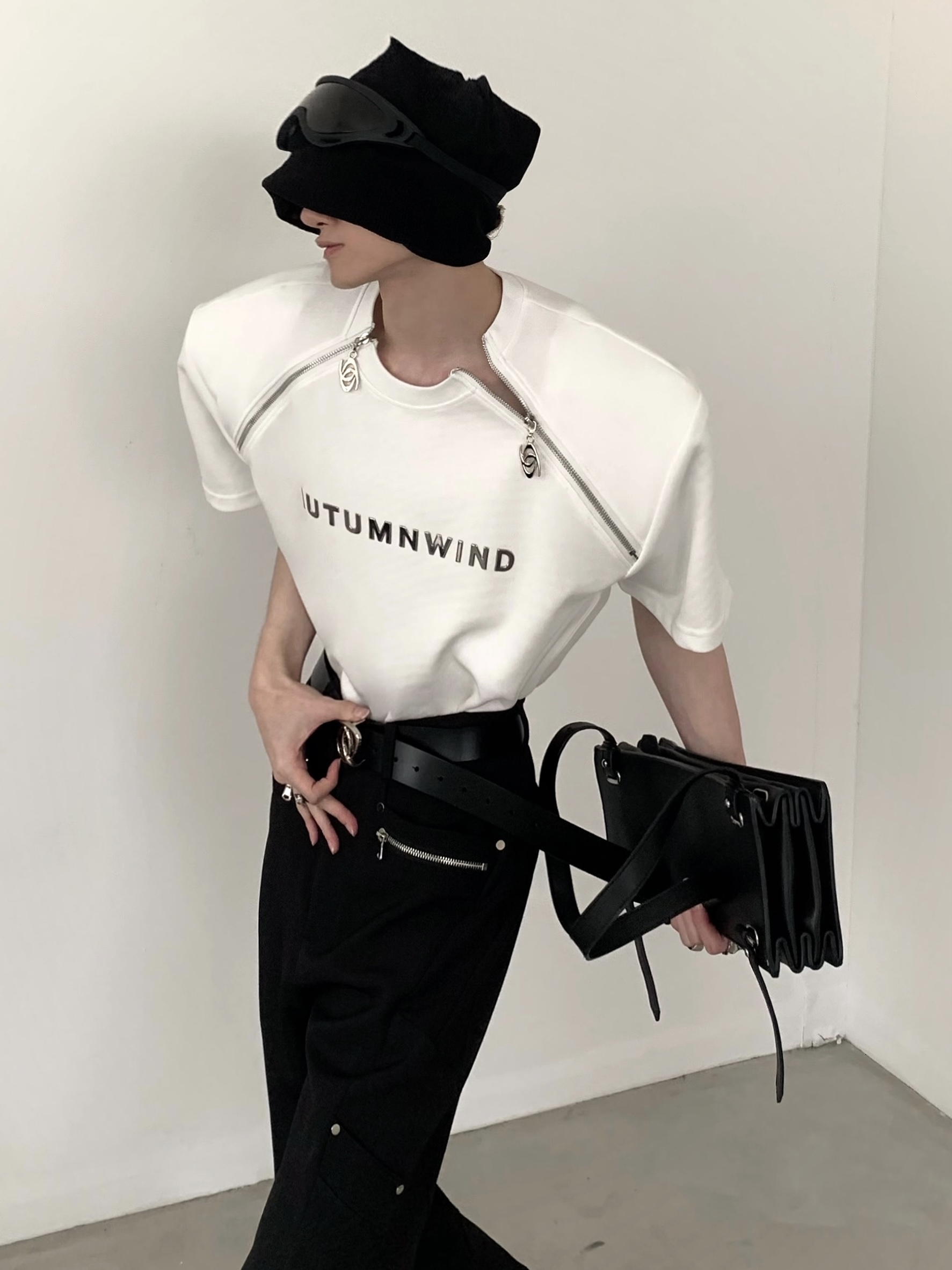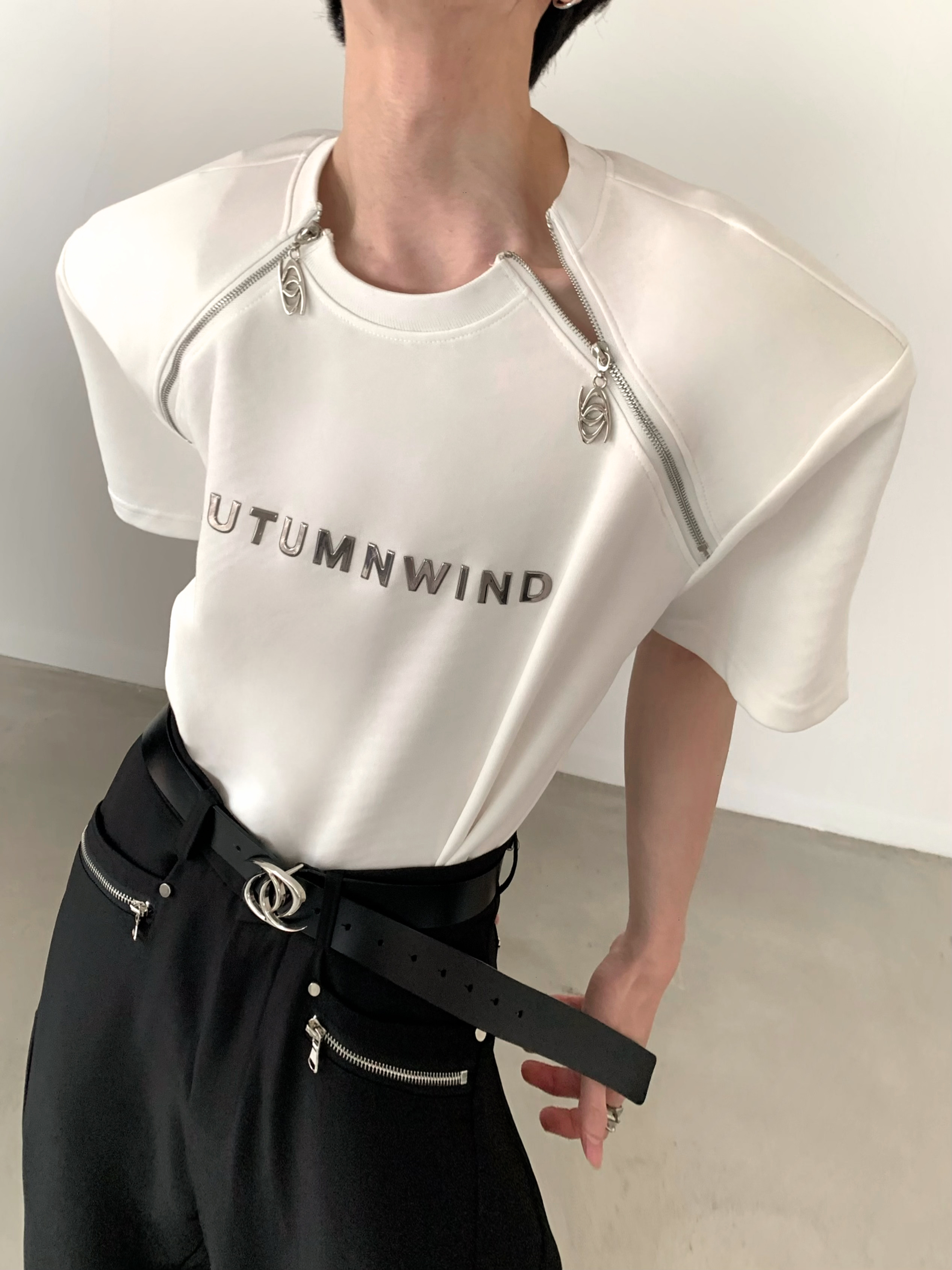 Zipper Design Shoulder Pad Short Sleeve T-Shirt WN5999