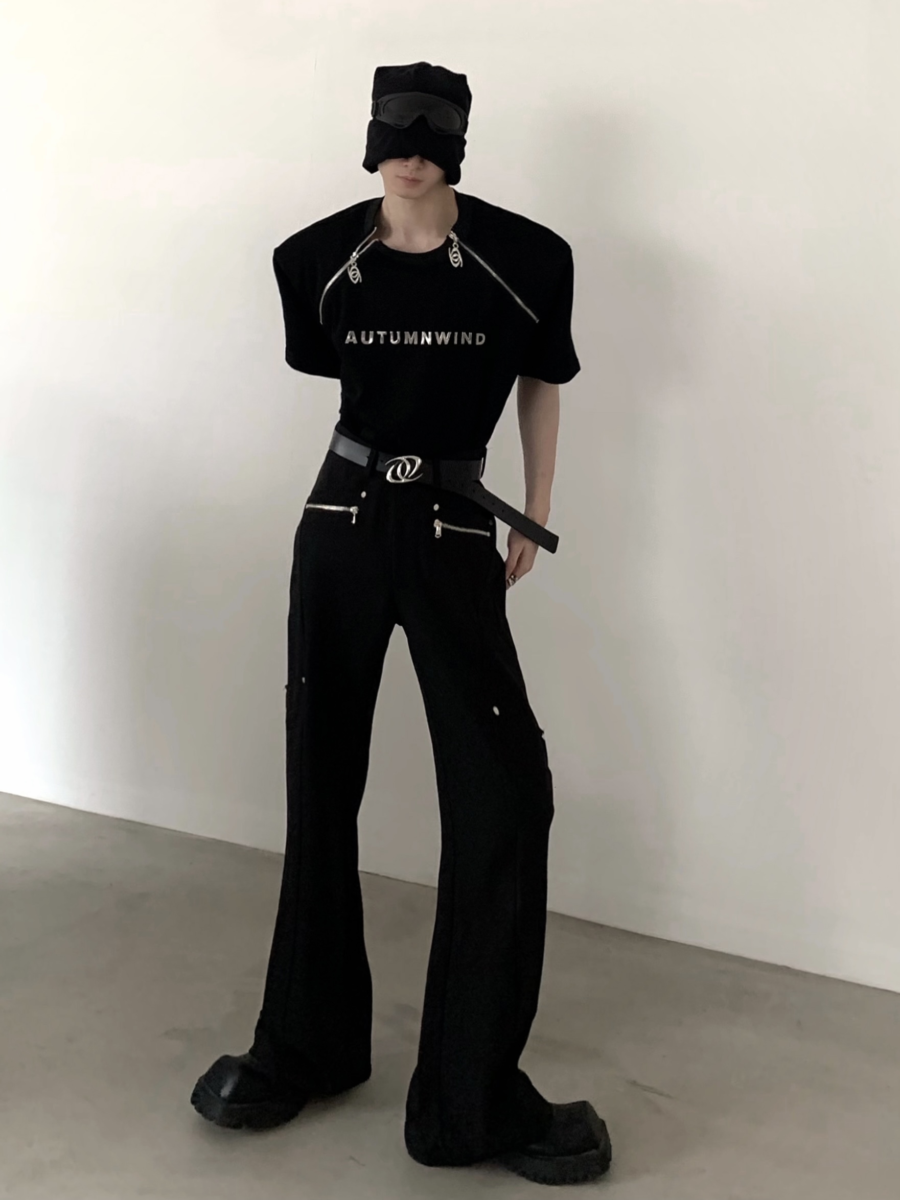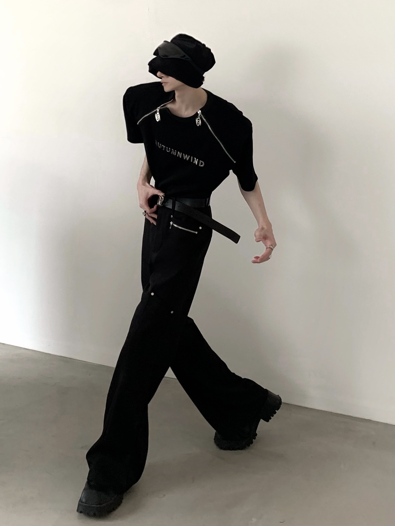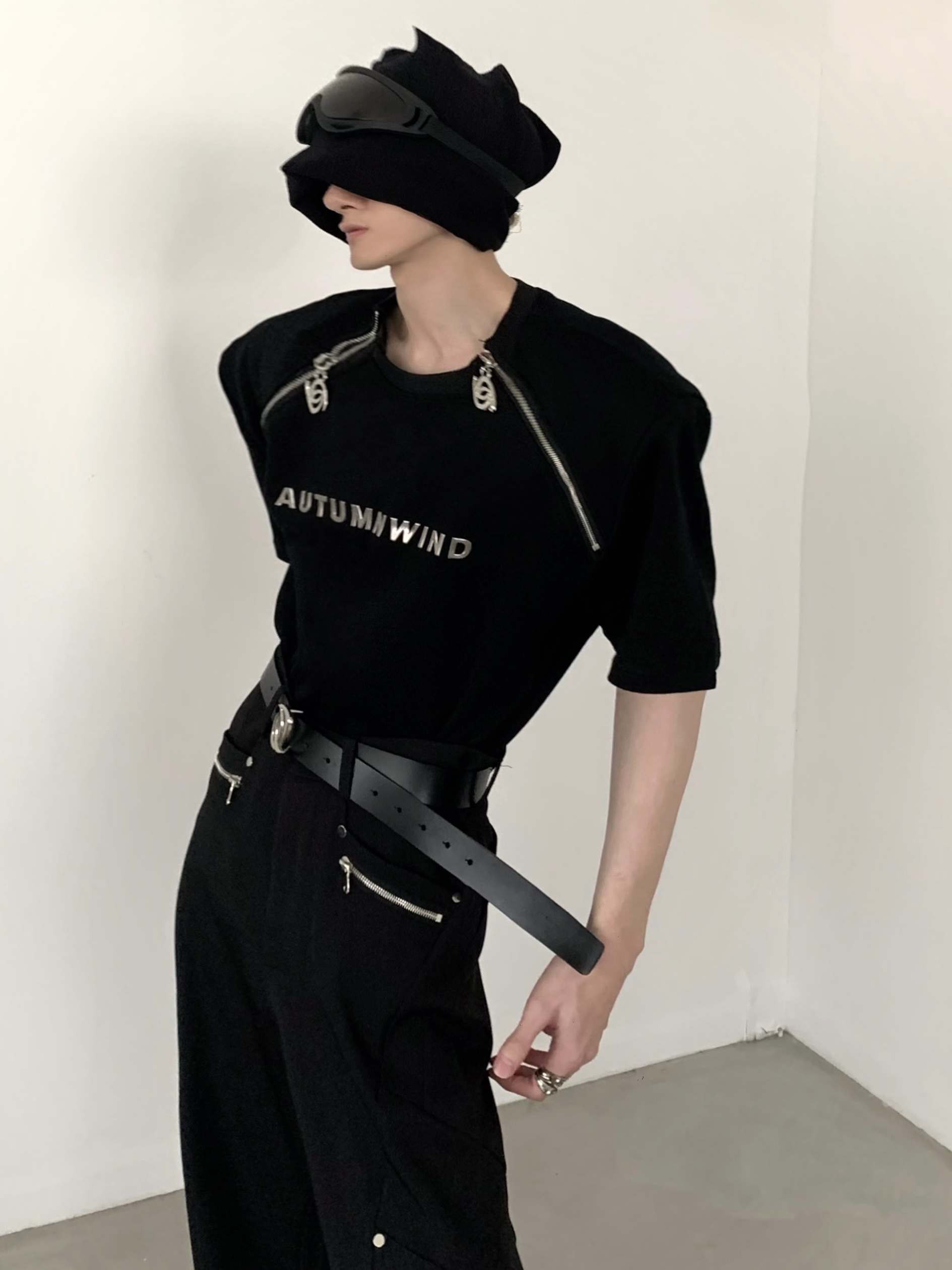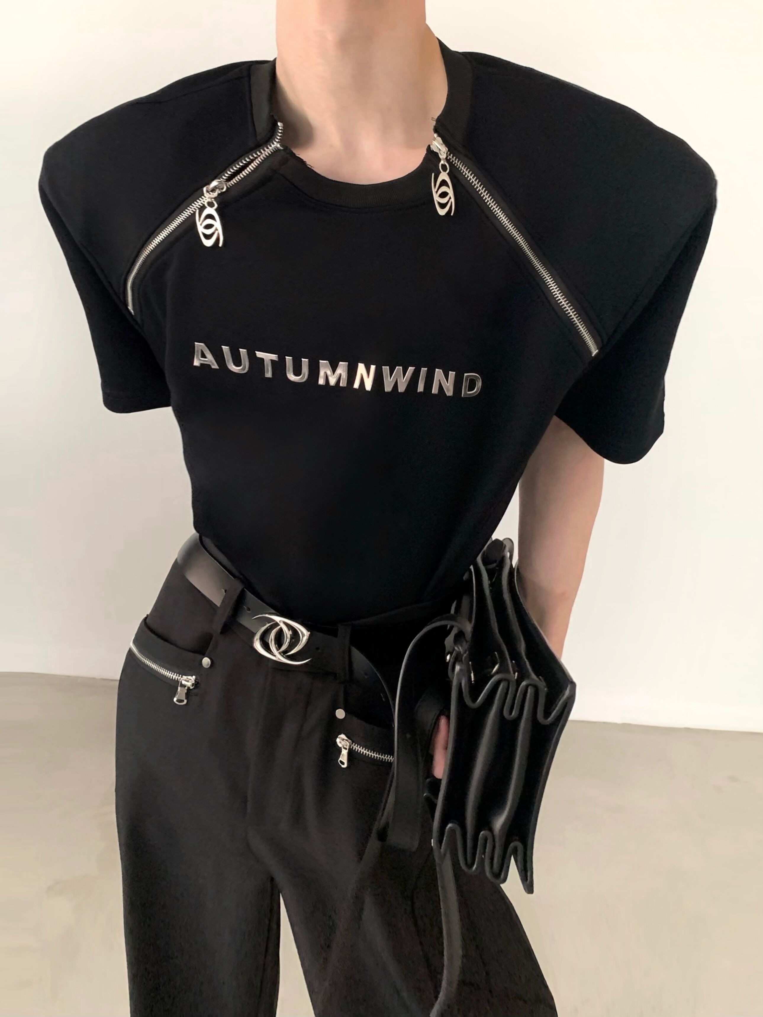 Zipper Design Shoulder Pad Short Sleeve T-Shirt WN5999