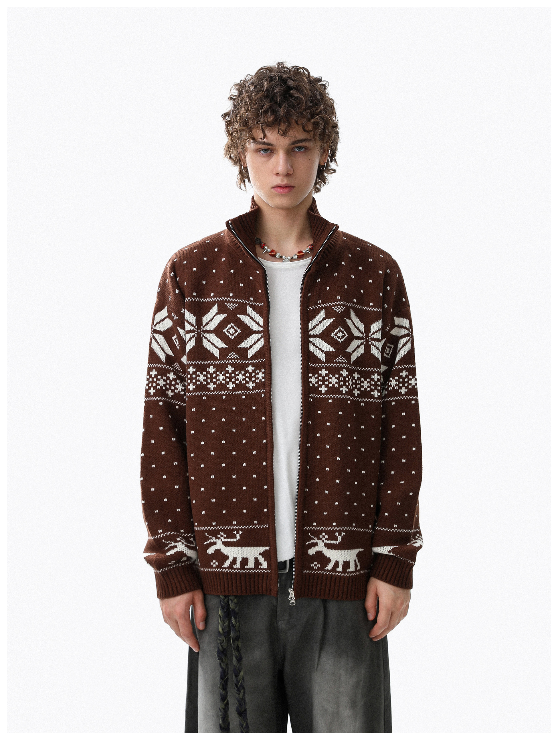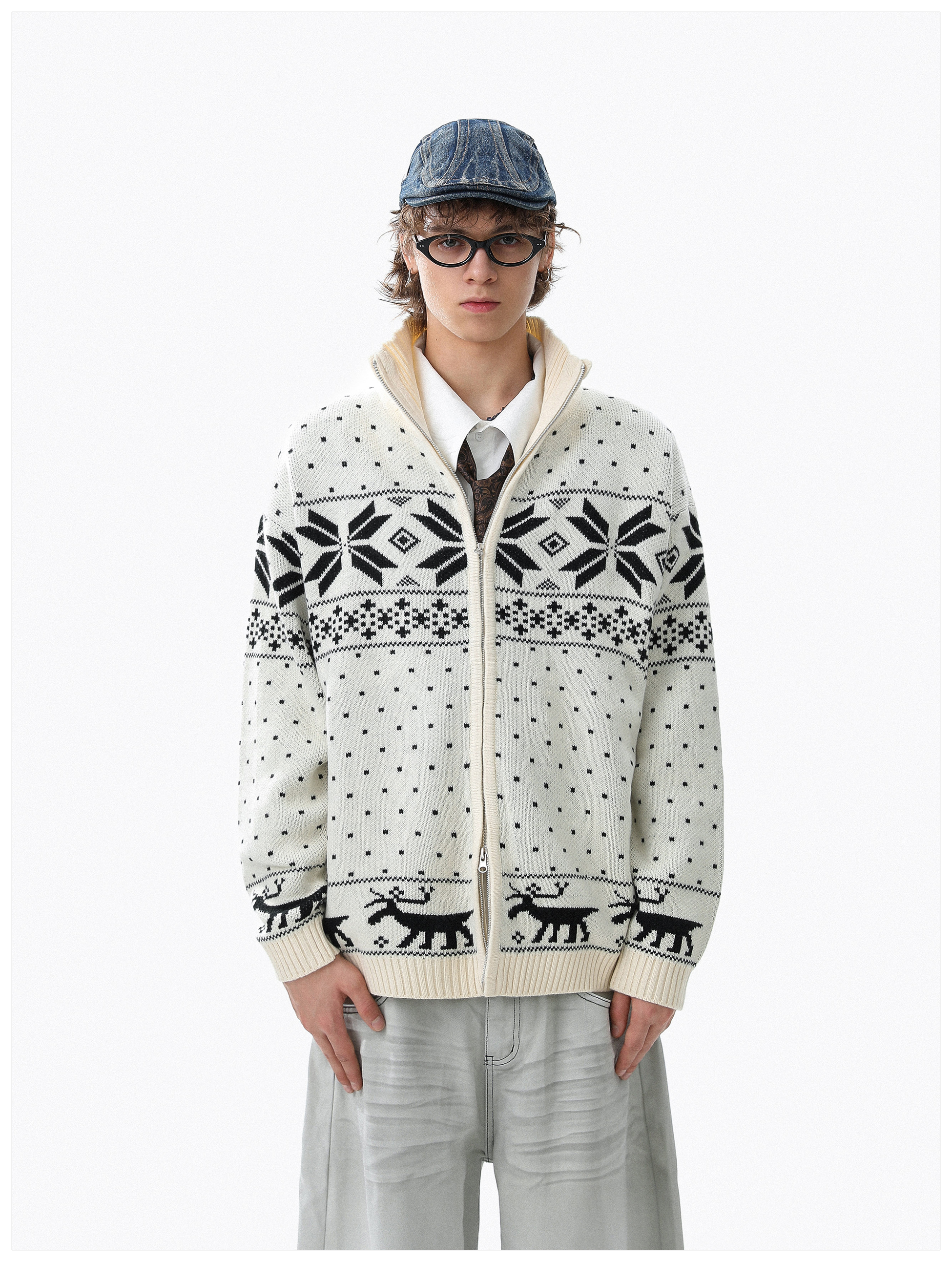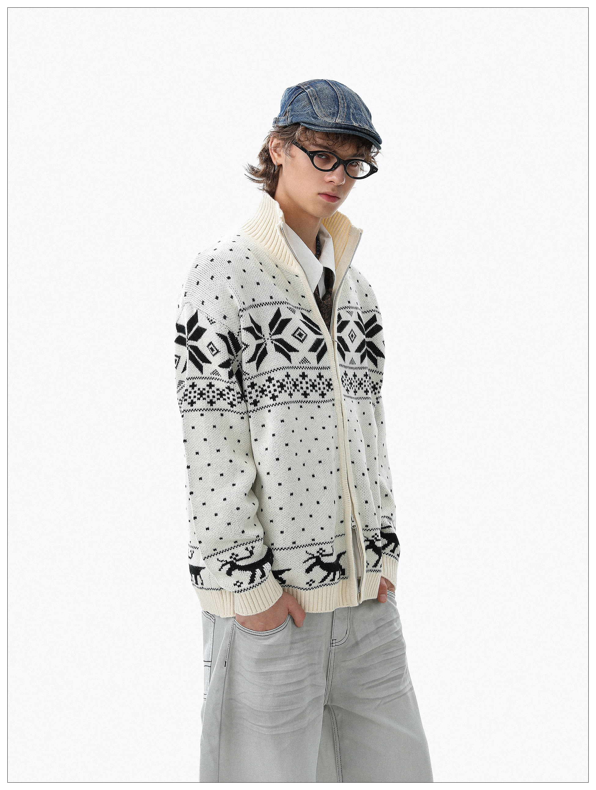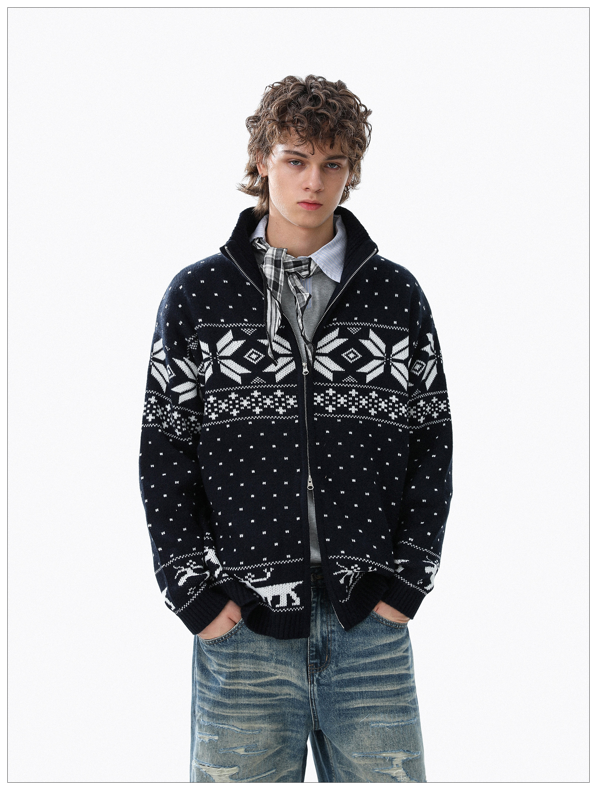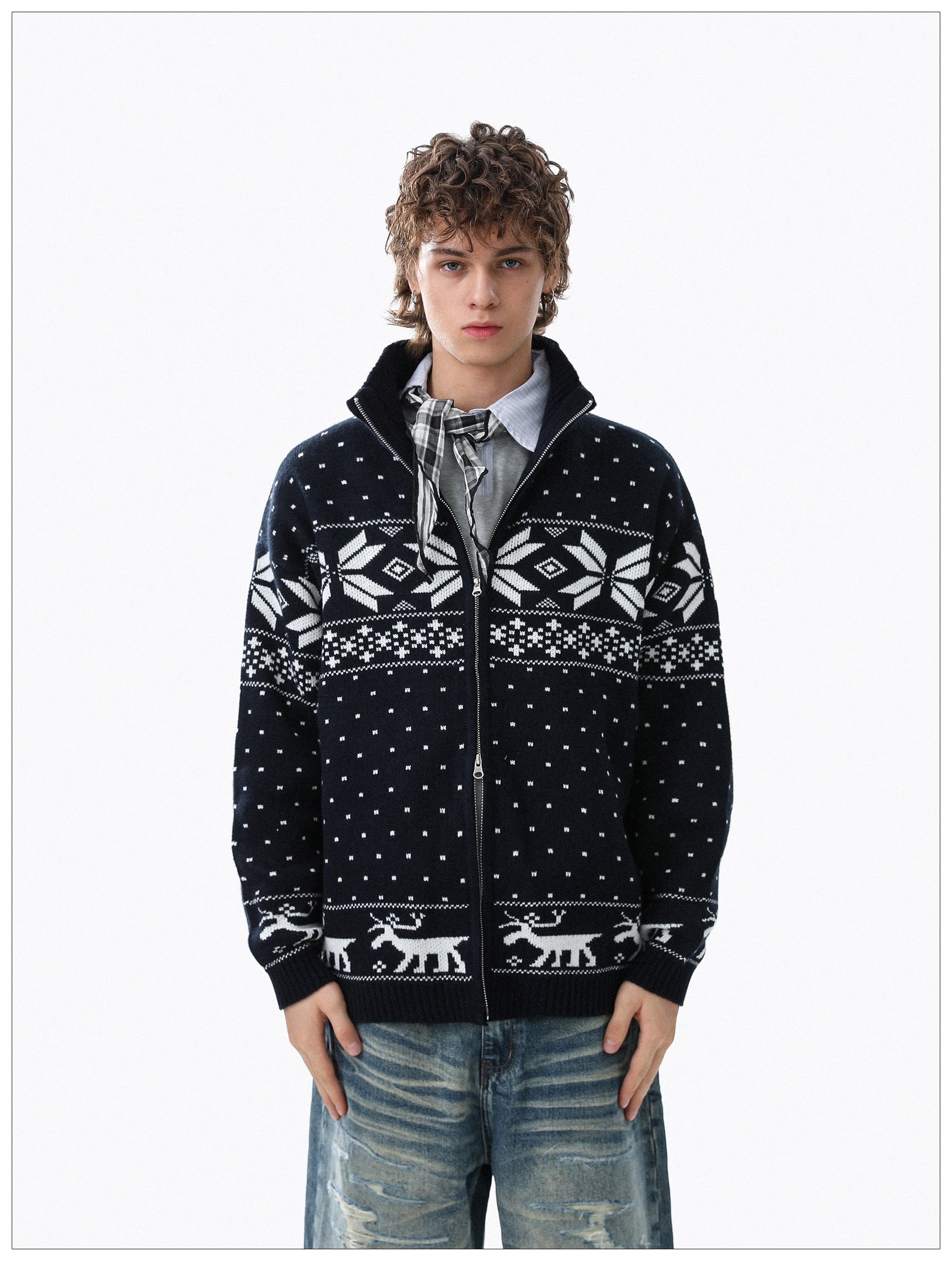 Snowflake Zipper Stand Neck Knit Sweater WN22102