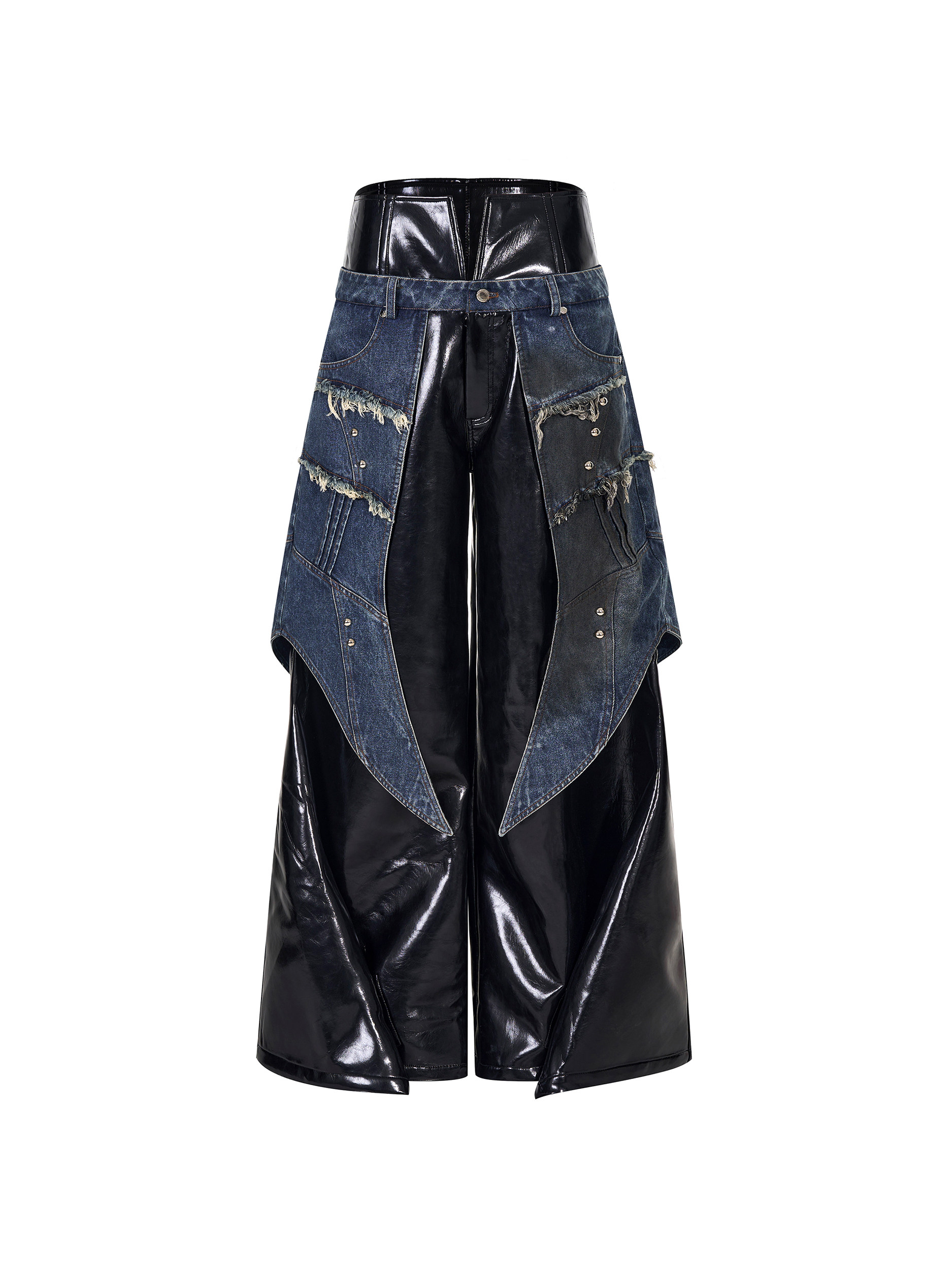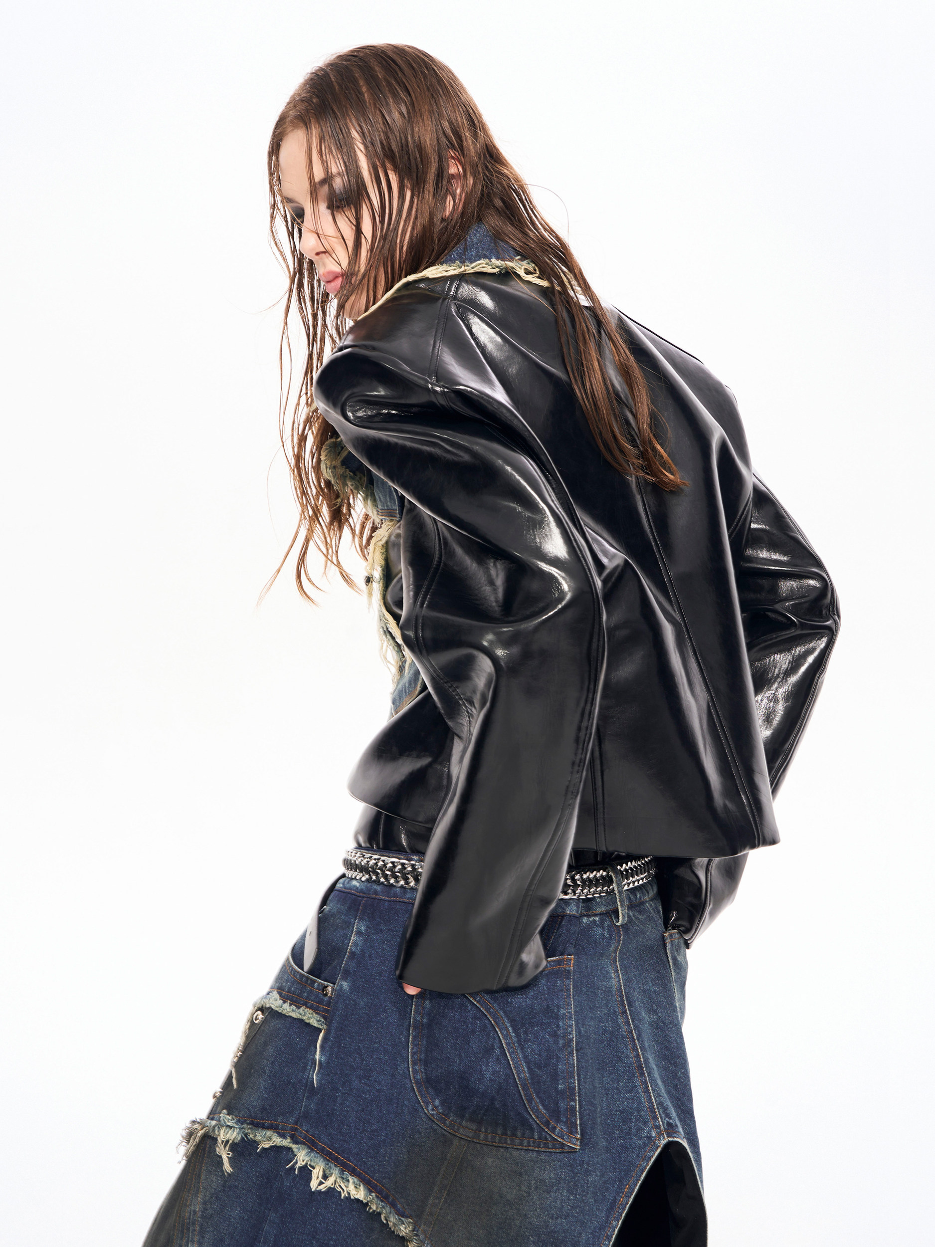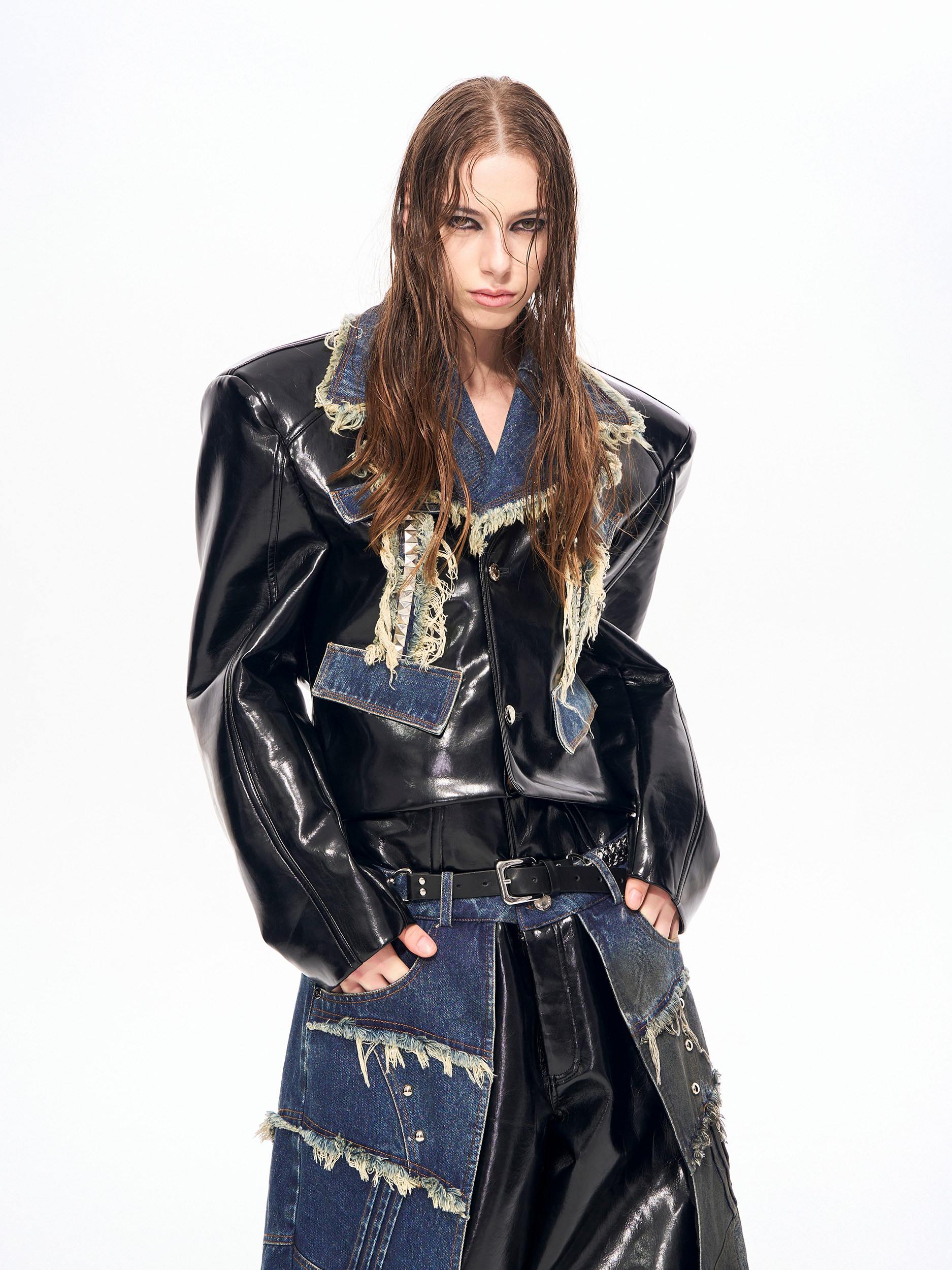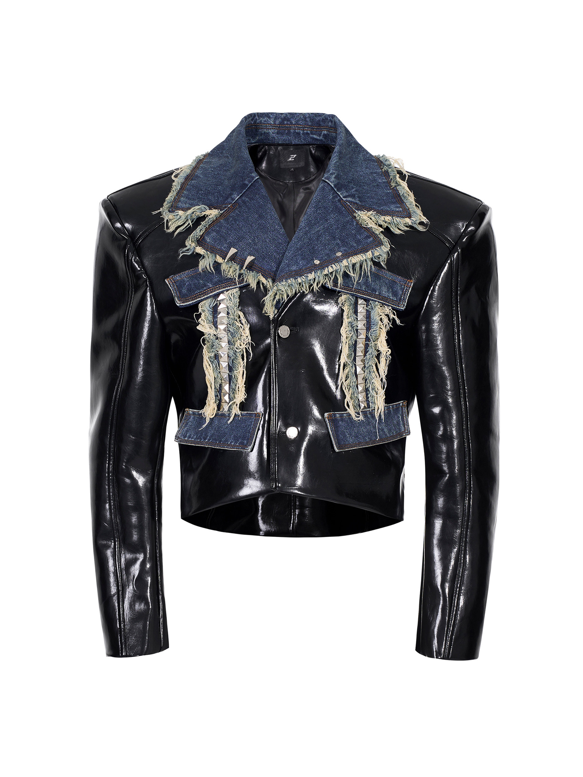 Frayed Denim Patch Rivet PU Leather Short Jacket & PU Leather Pants Setup WN22123