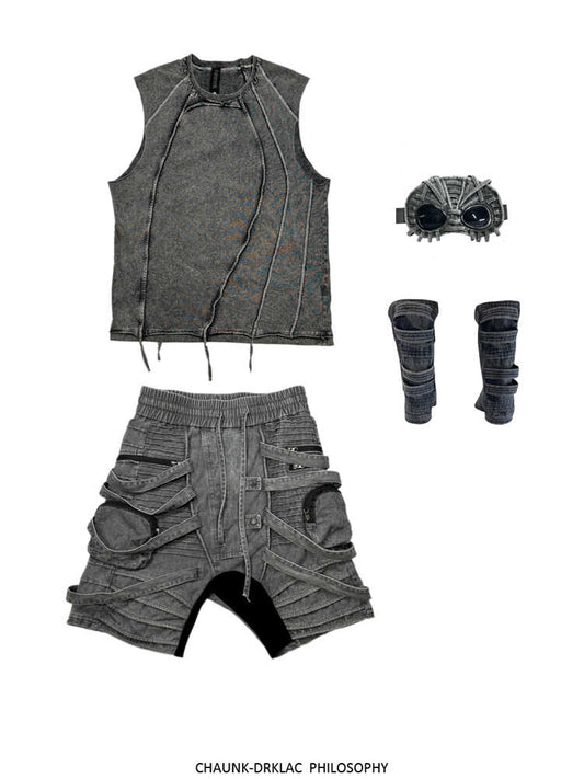 Asymmetrical Deconstructed Pleats Strap Washed Cargo Half Pants WN13981