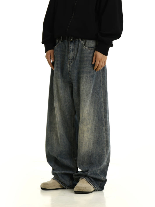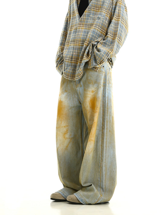Washed Yellow Mud Dyed Wide-Leg Straight Denim Jeans WN10615