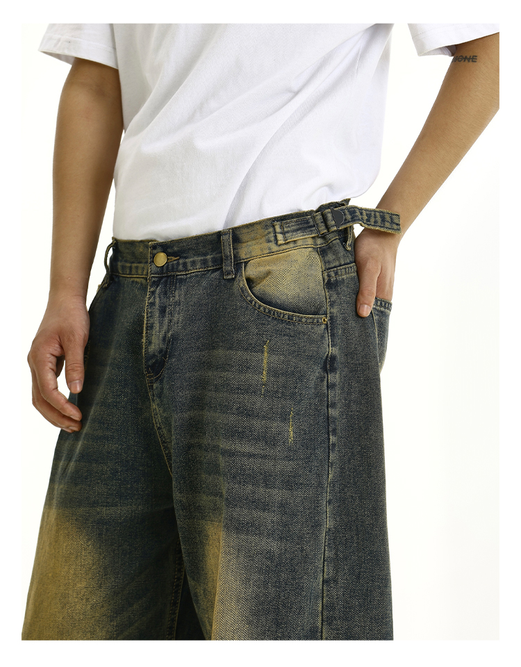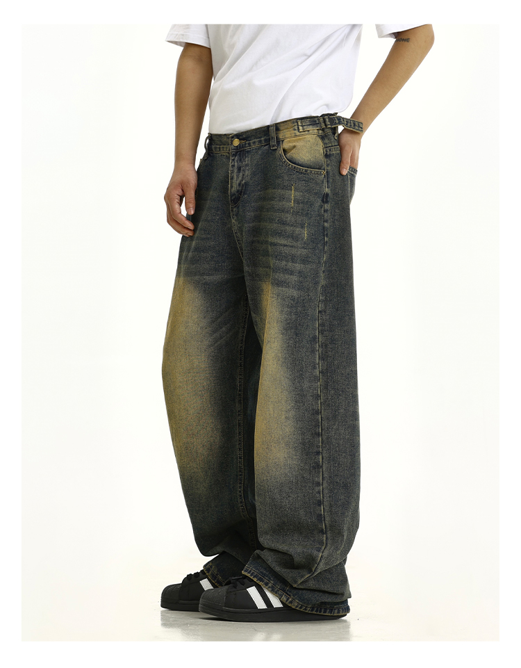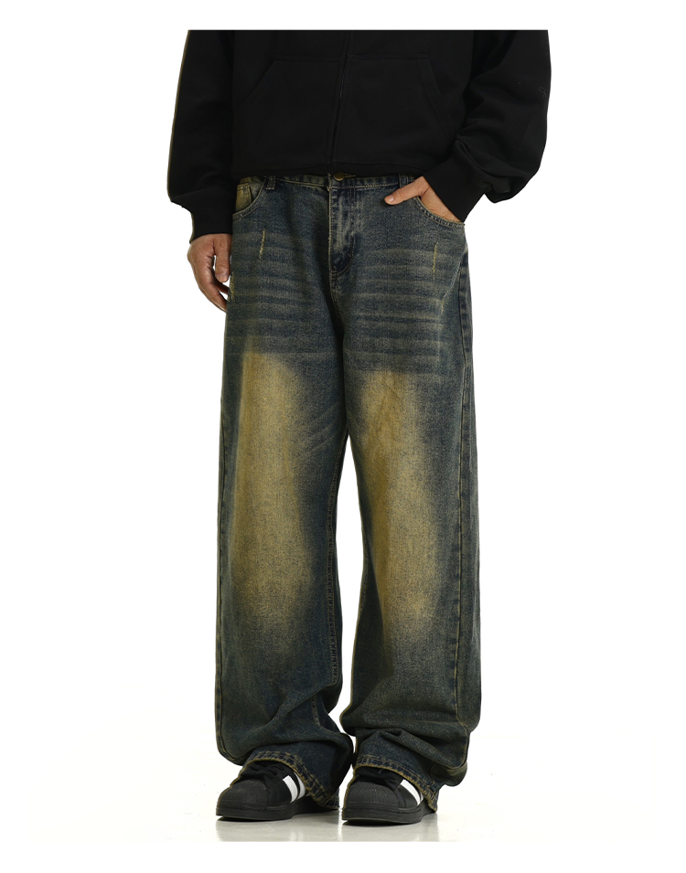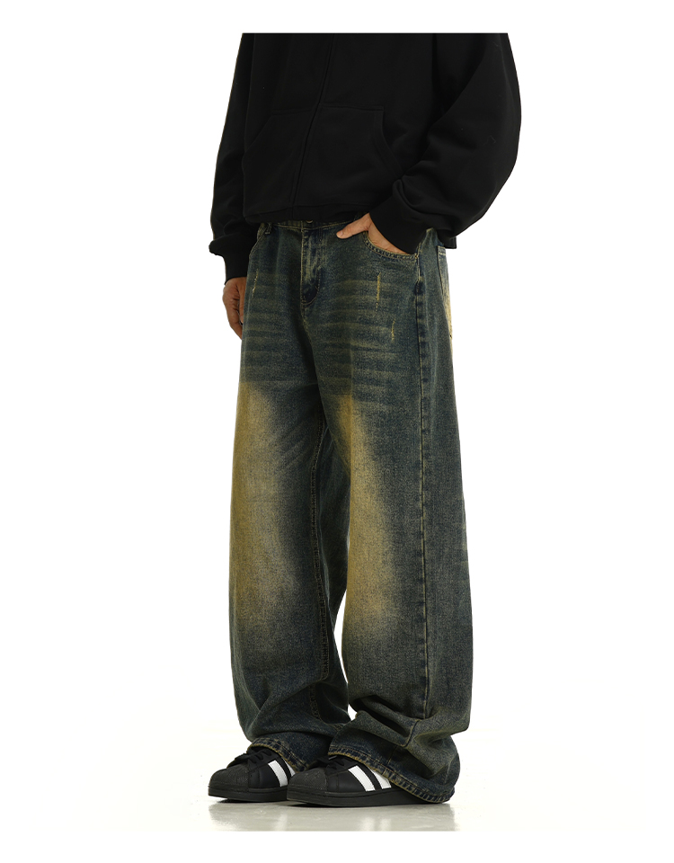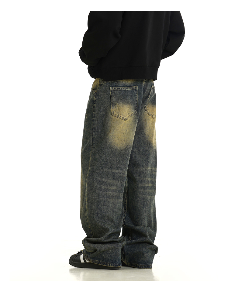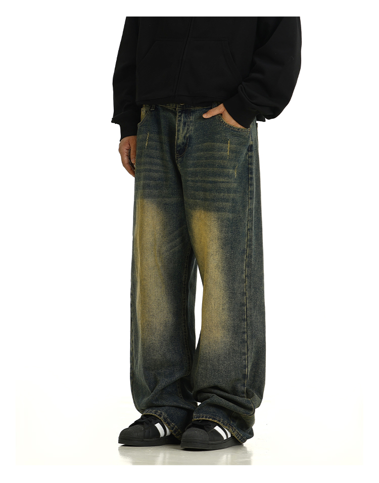 Washed Yellow Mud Dyed Wide-Leg Straight Denim Jeans WN10615