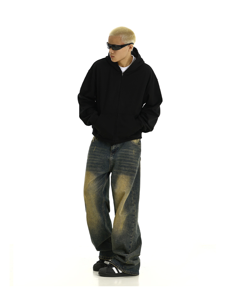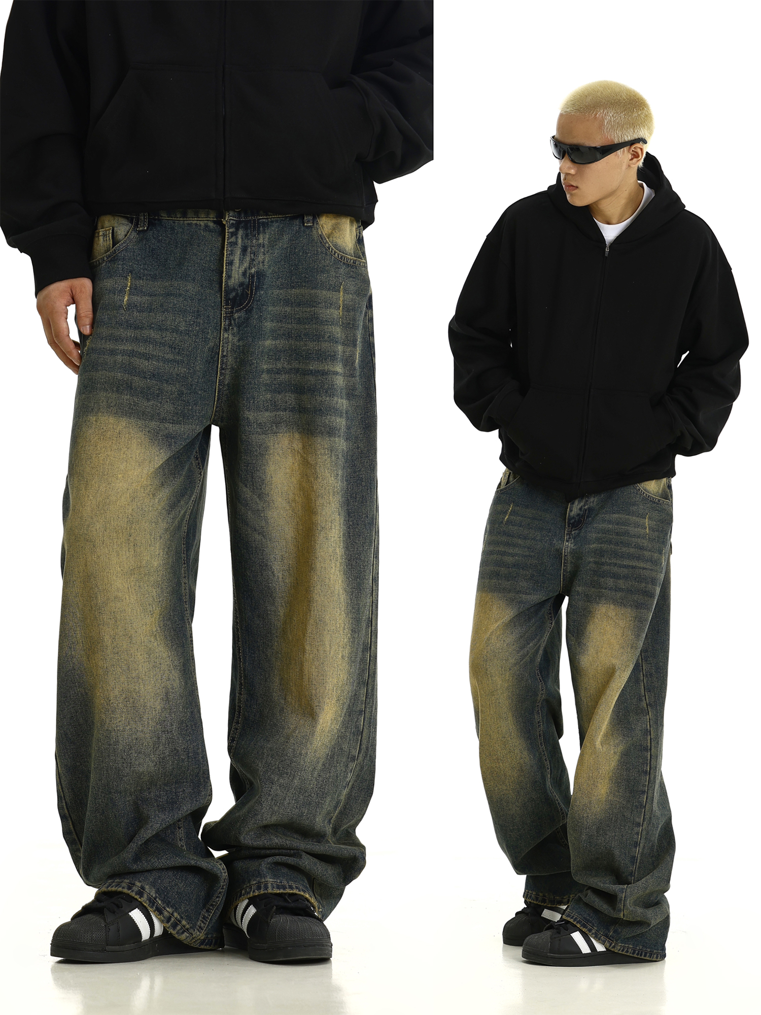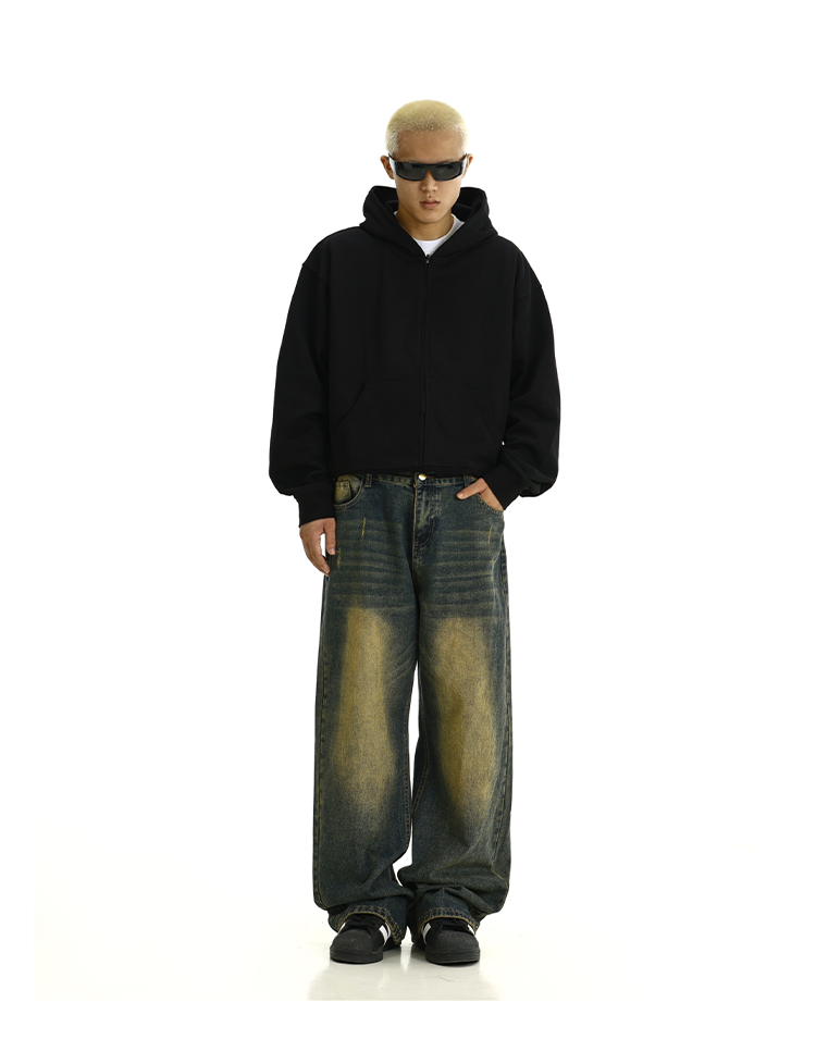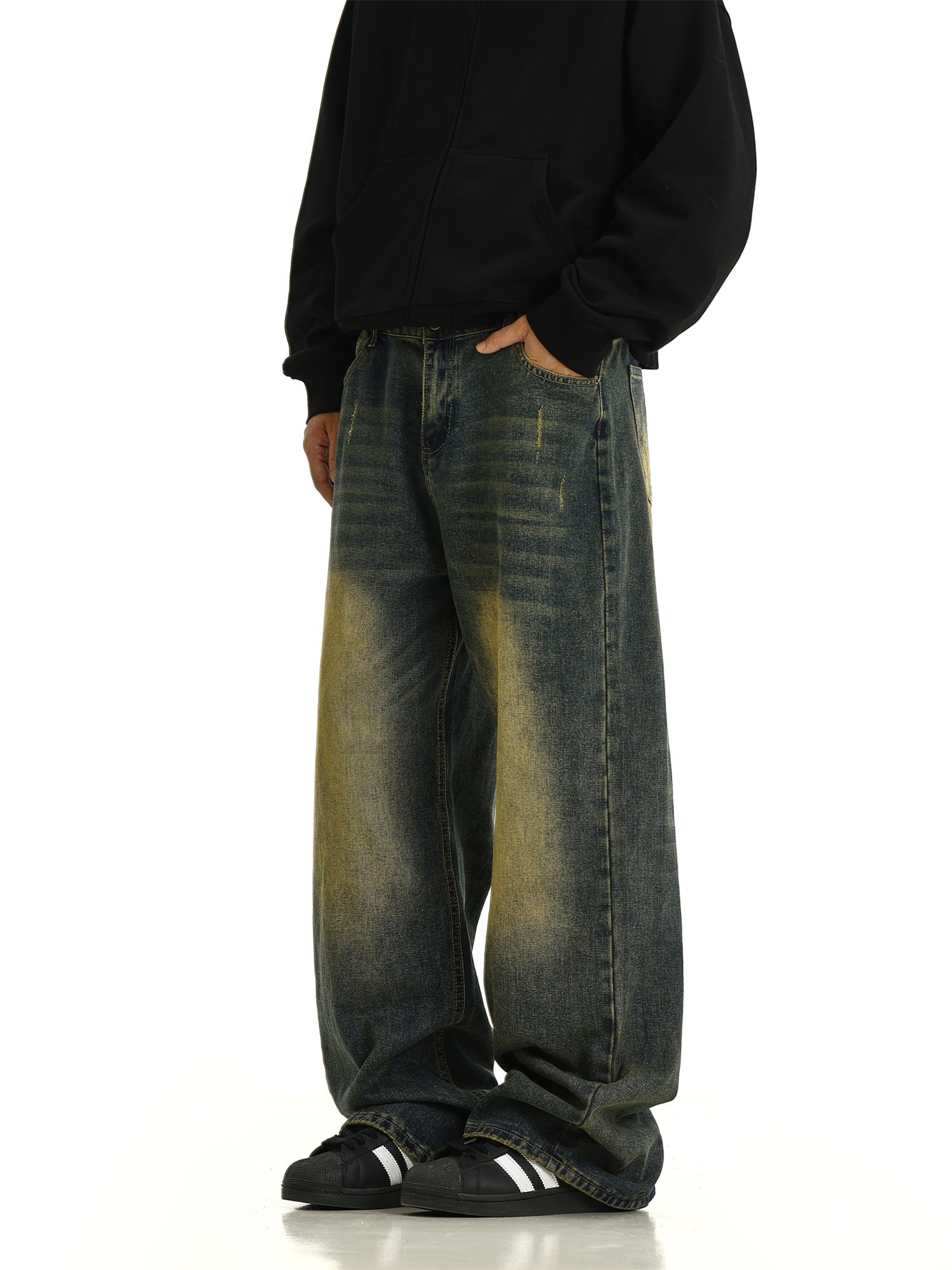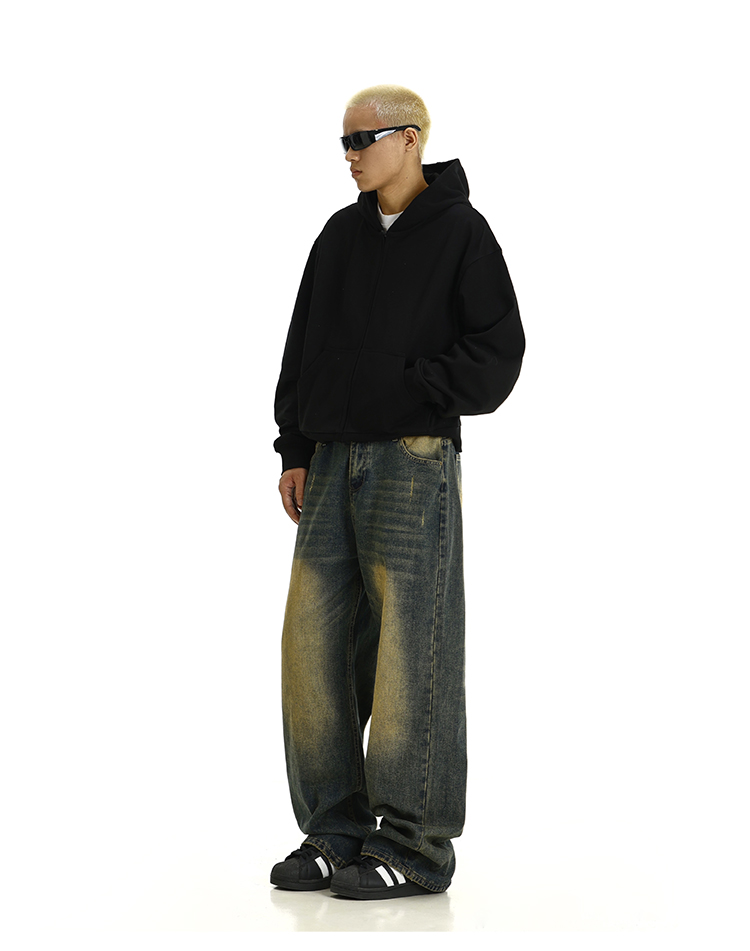 Washed Yellow Mud Dyed Wide-Leg Straight Denim Jeans WN10615