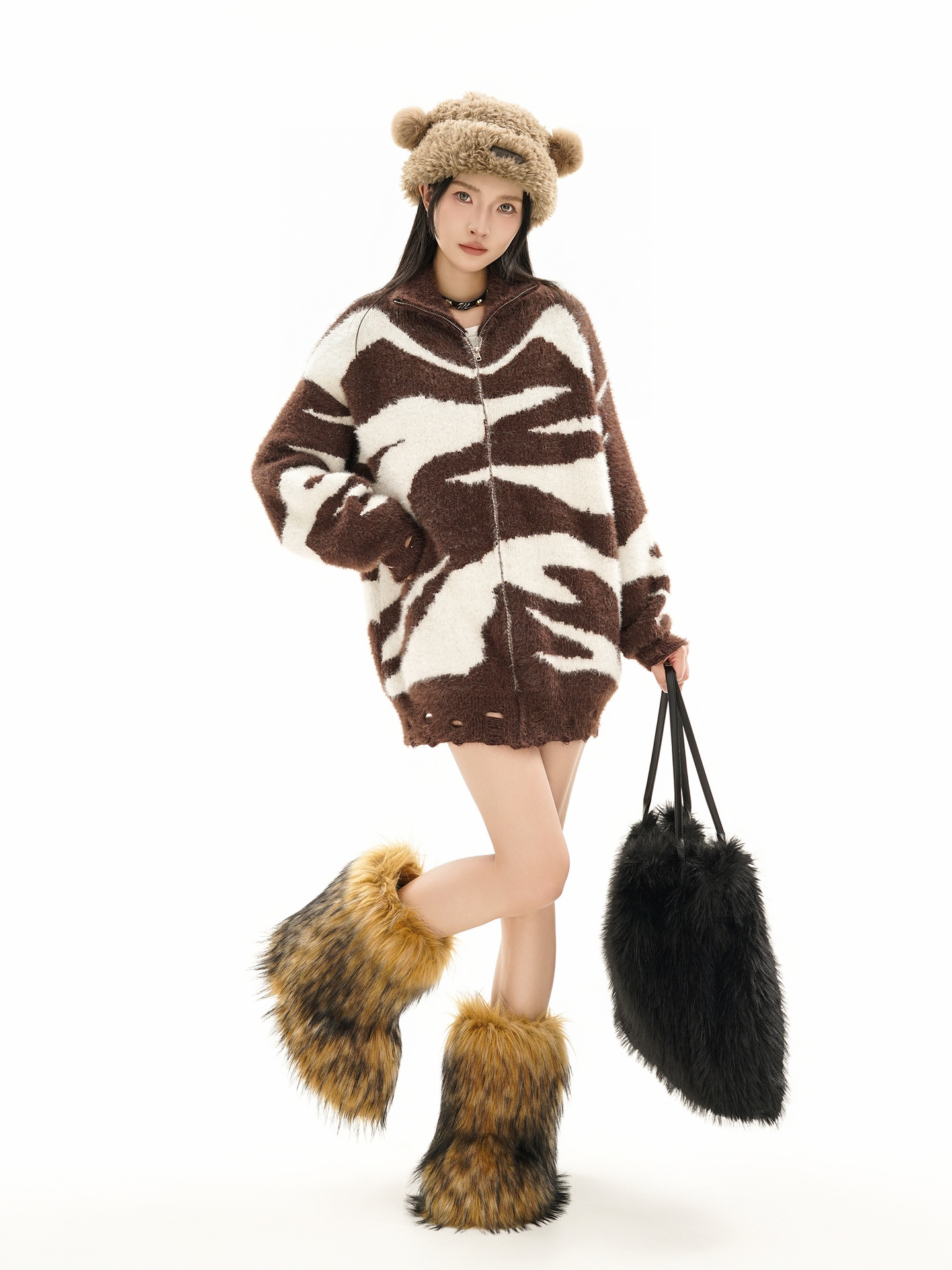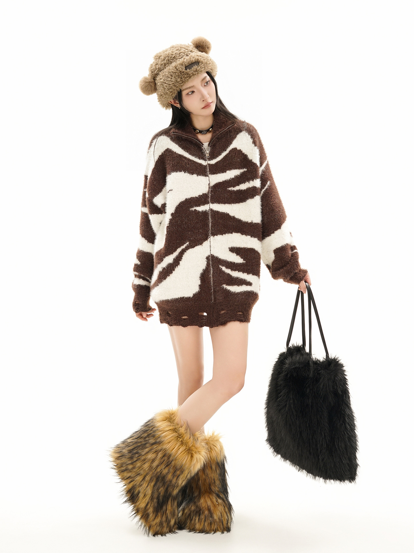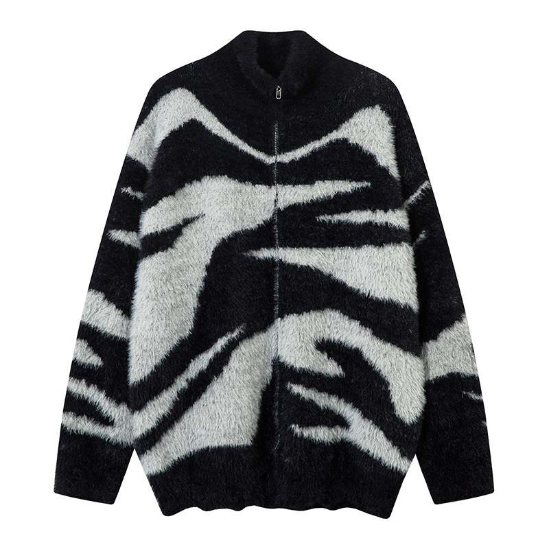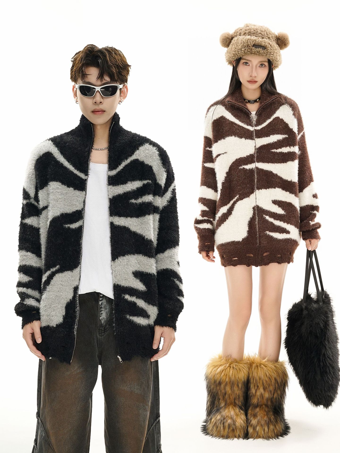 Zebra Print Oversize Zipper Knit Cardigan WN11176