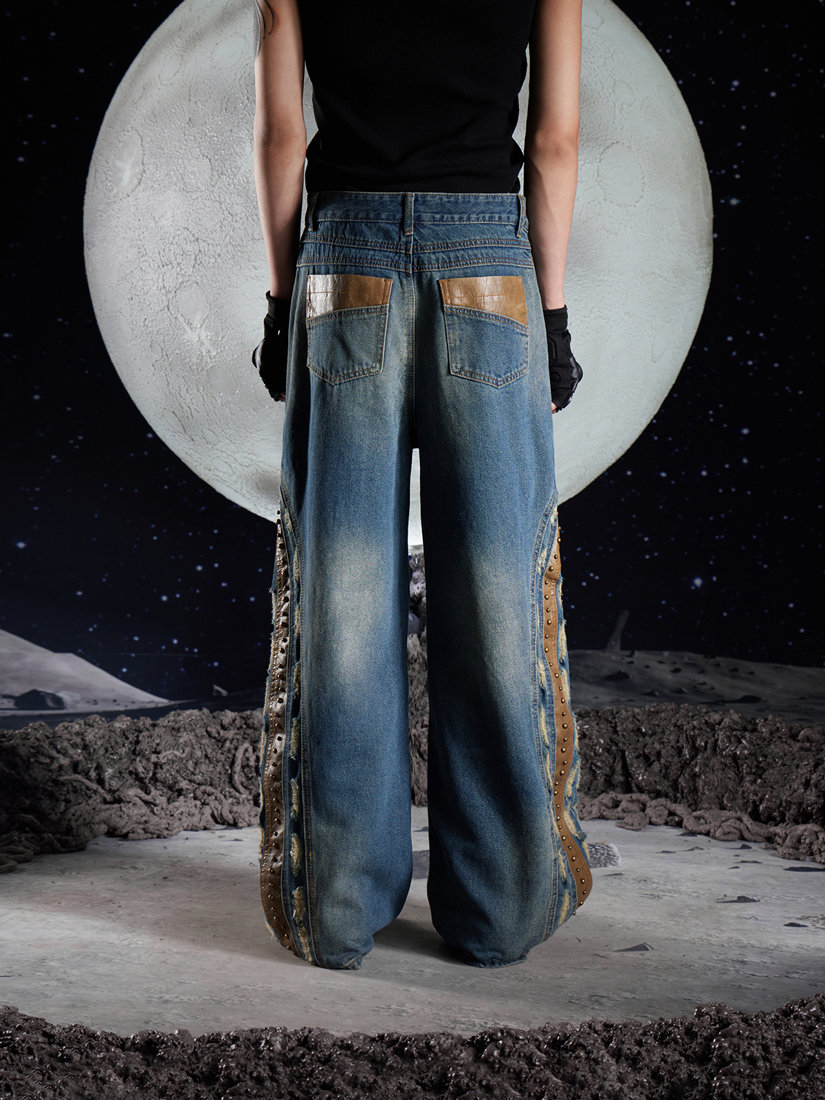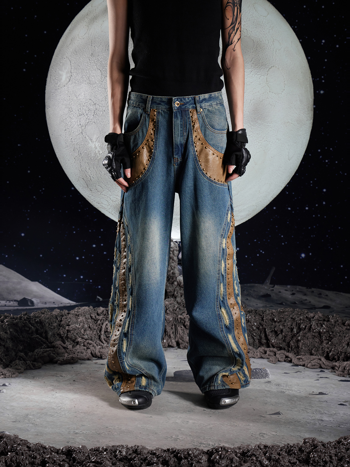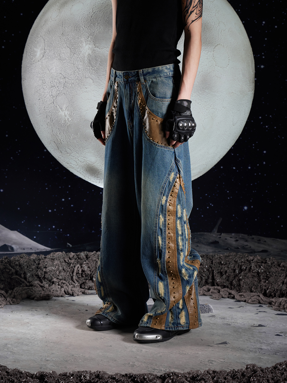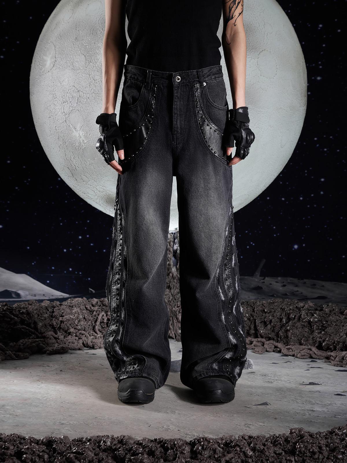 Patchwork PU Leather Contrast Metal Studded Washed Denim Wide-Leg Jeans WN13471