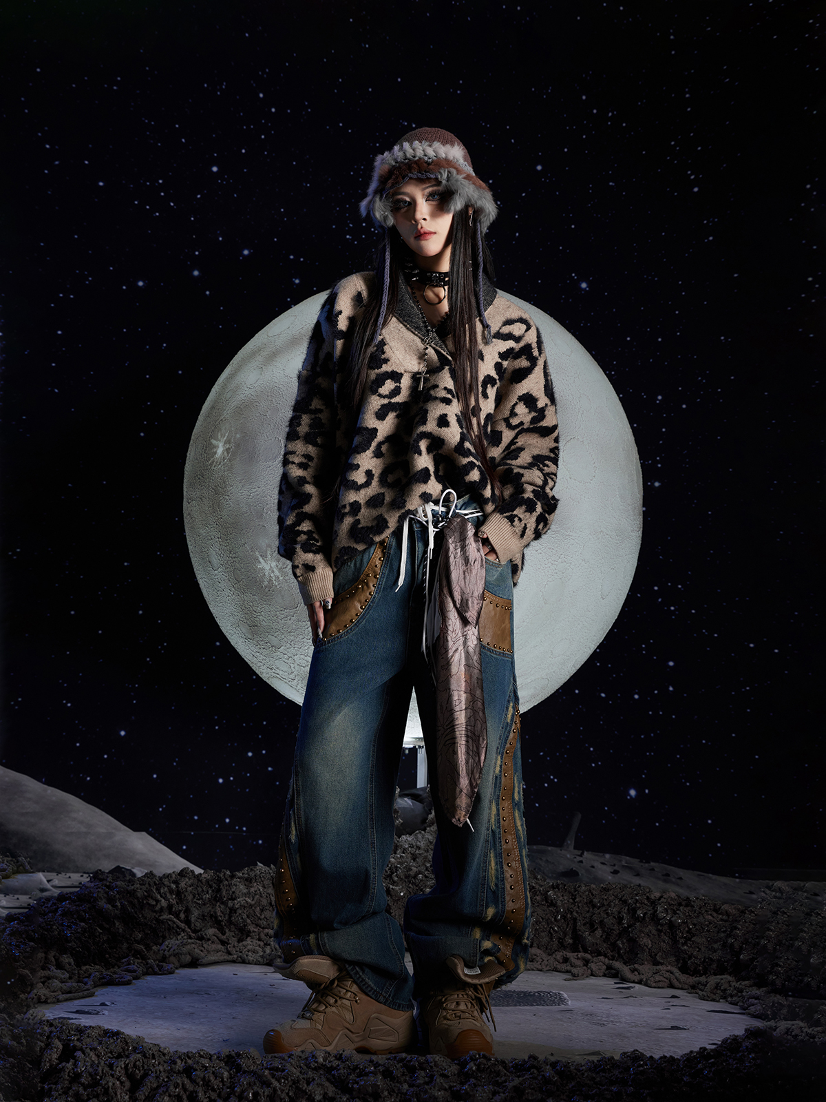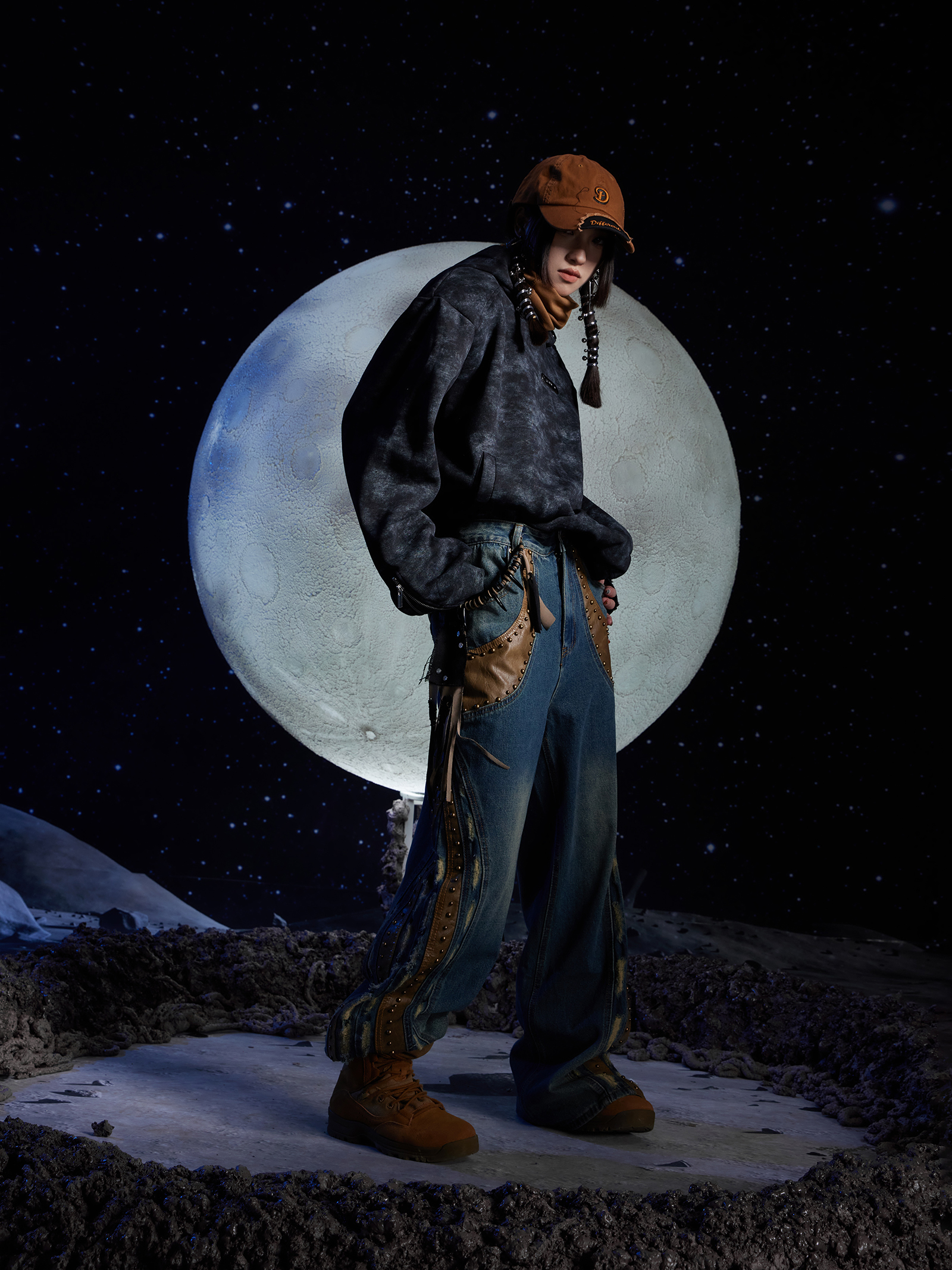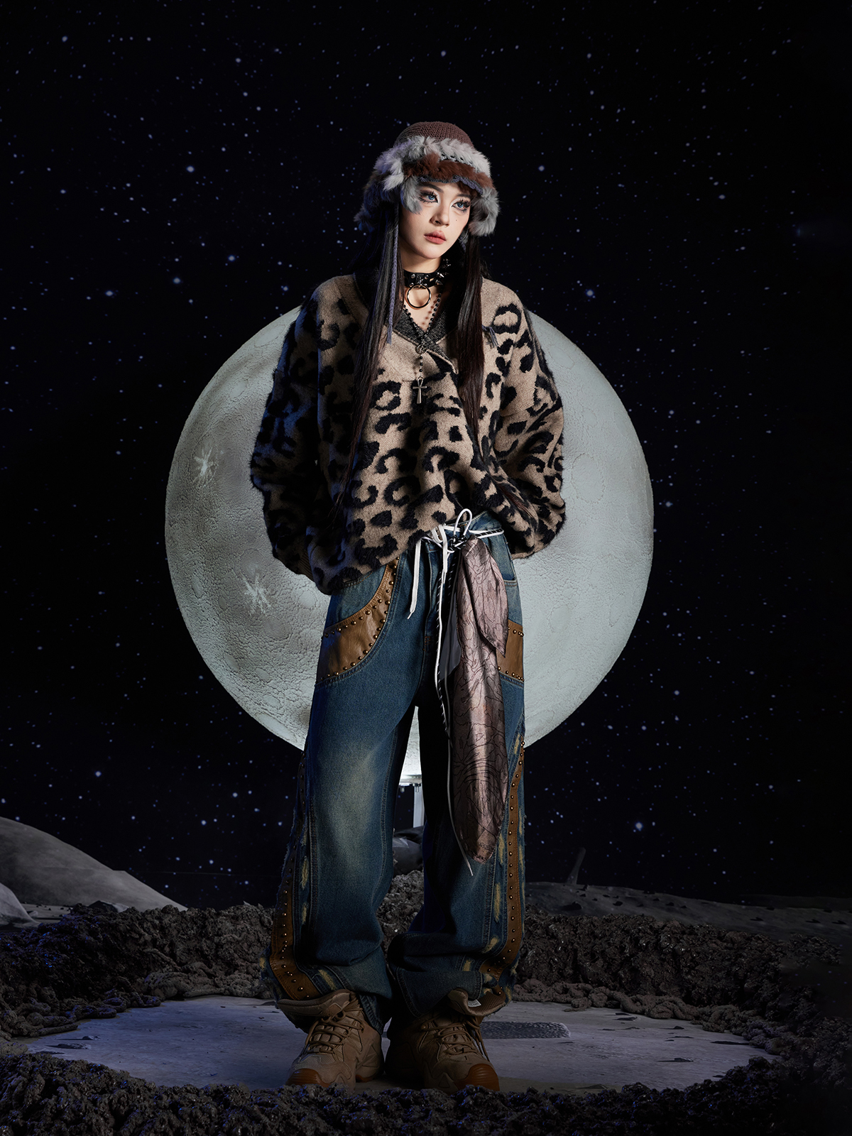 Patchwork PU Leather Contrast Metal Studded Washed Denim Wide-Leg Jeans WN13471