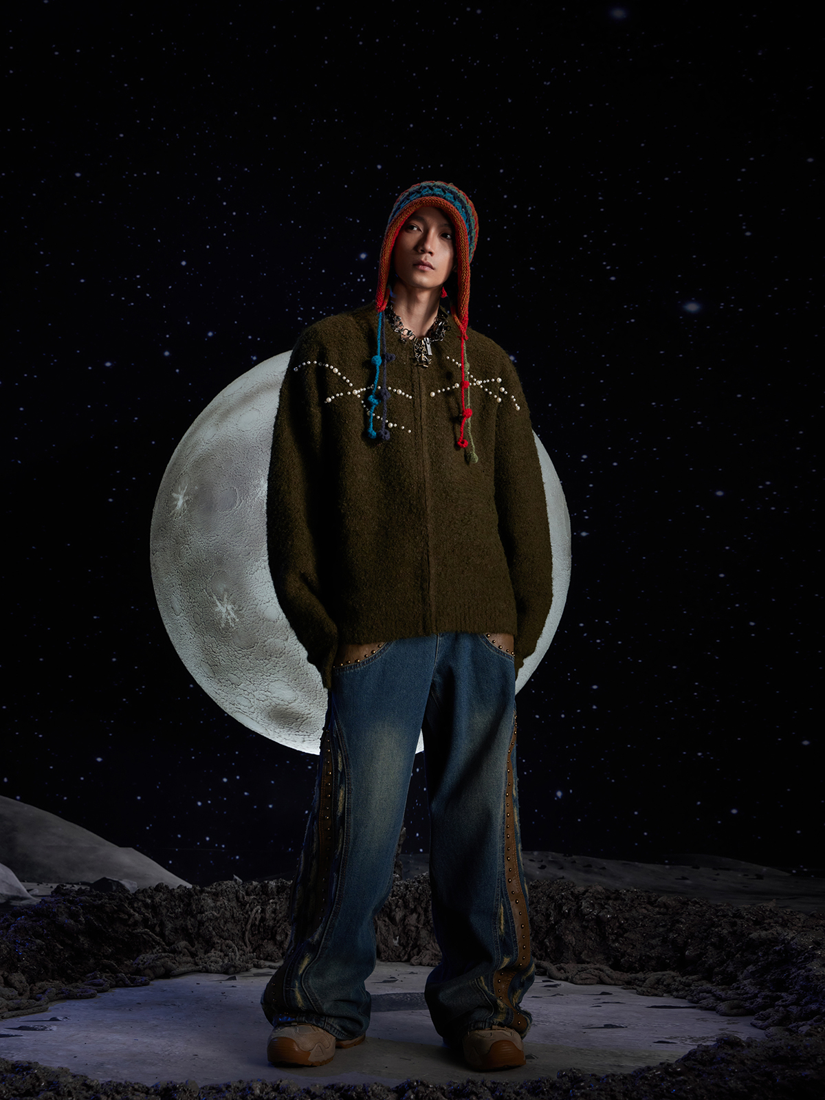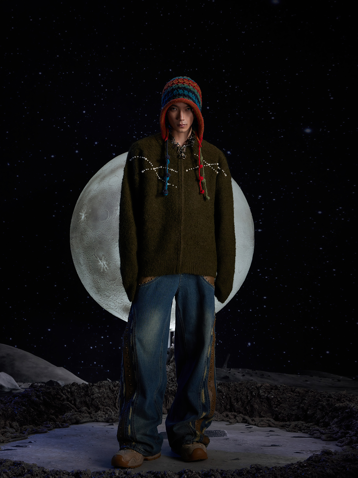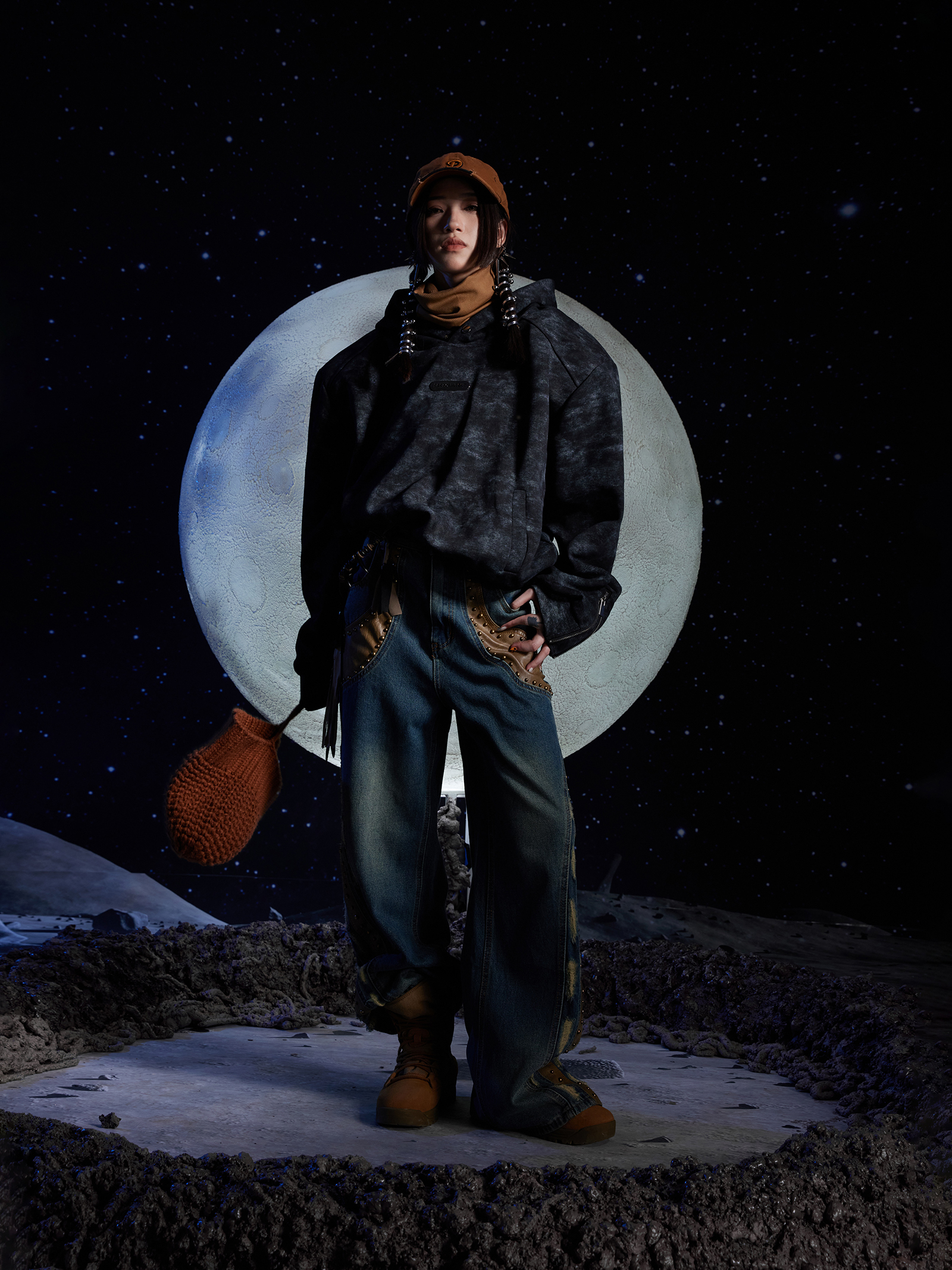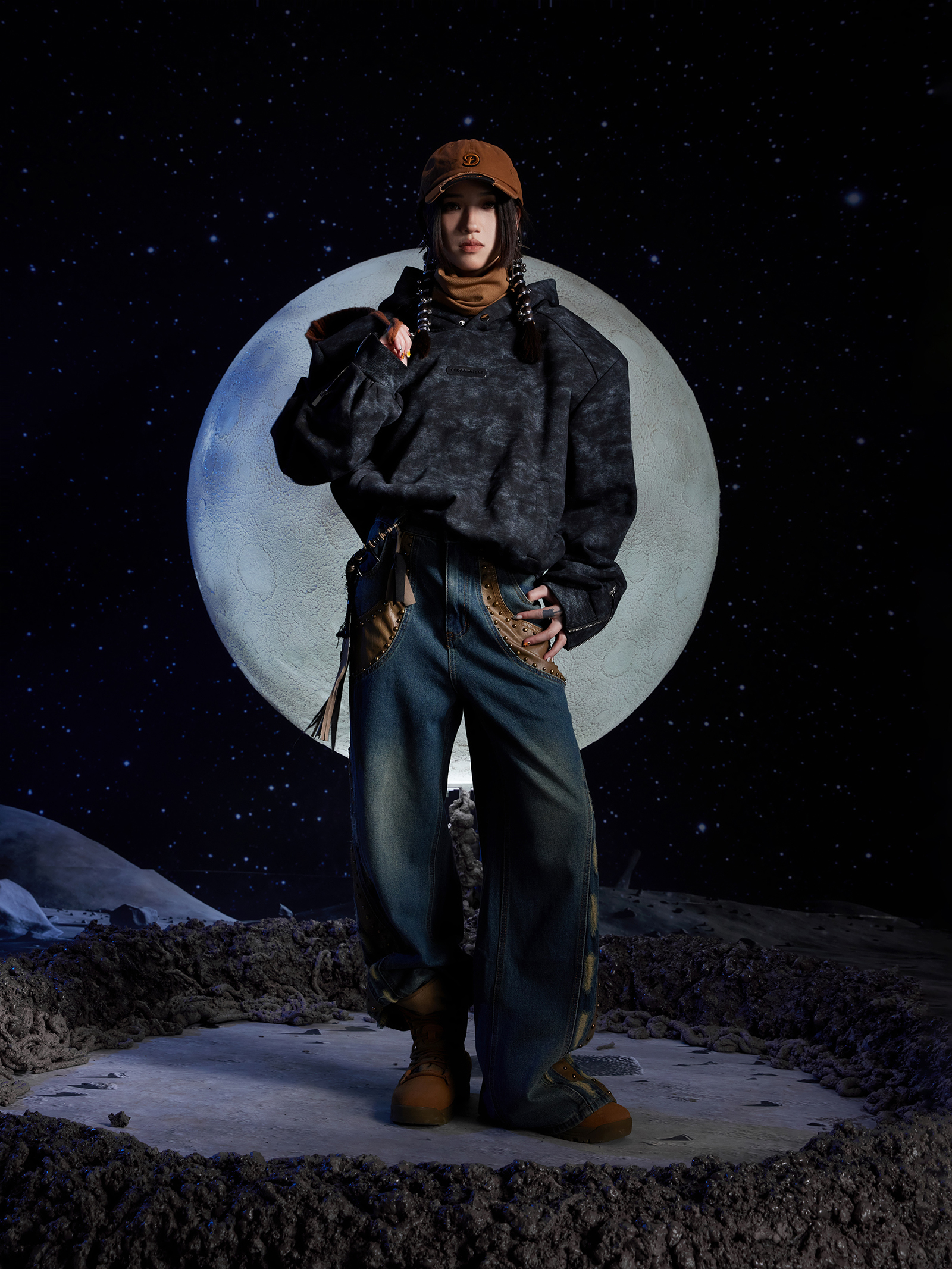 Patchwork PU Leather Contrast Metal Studded Washed Denim Wide-Leg Jeans WN13471