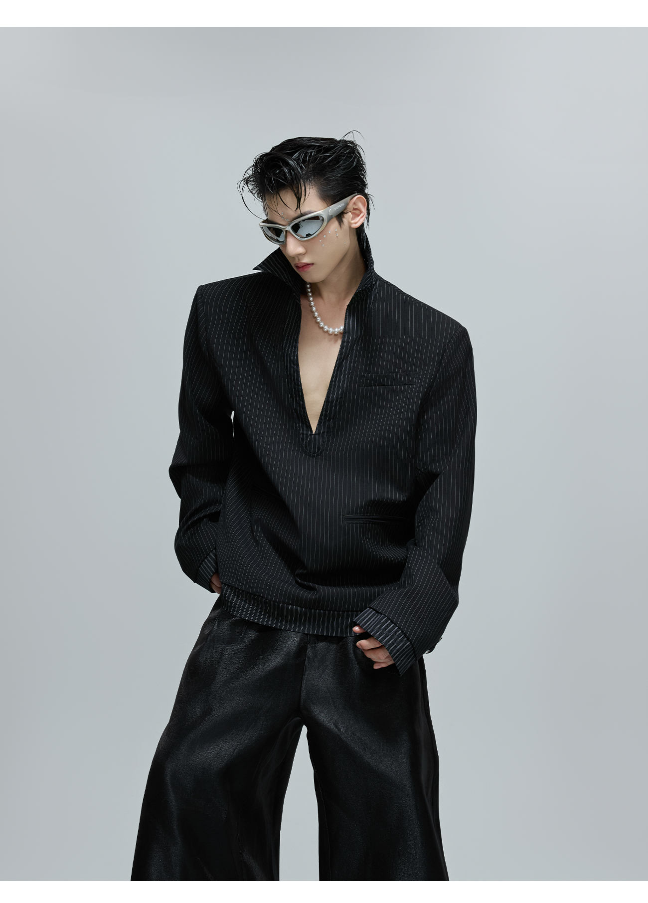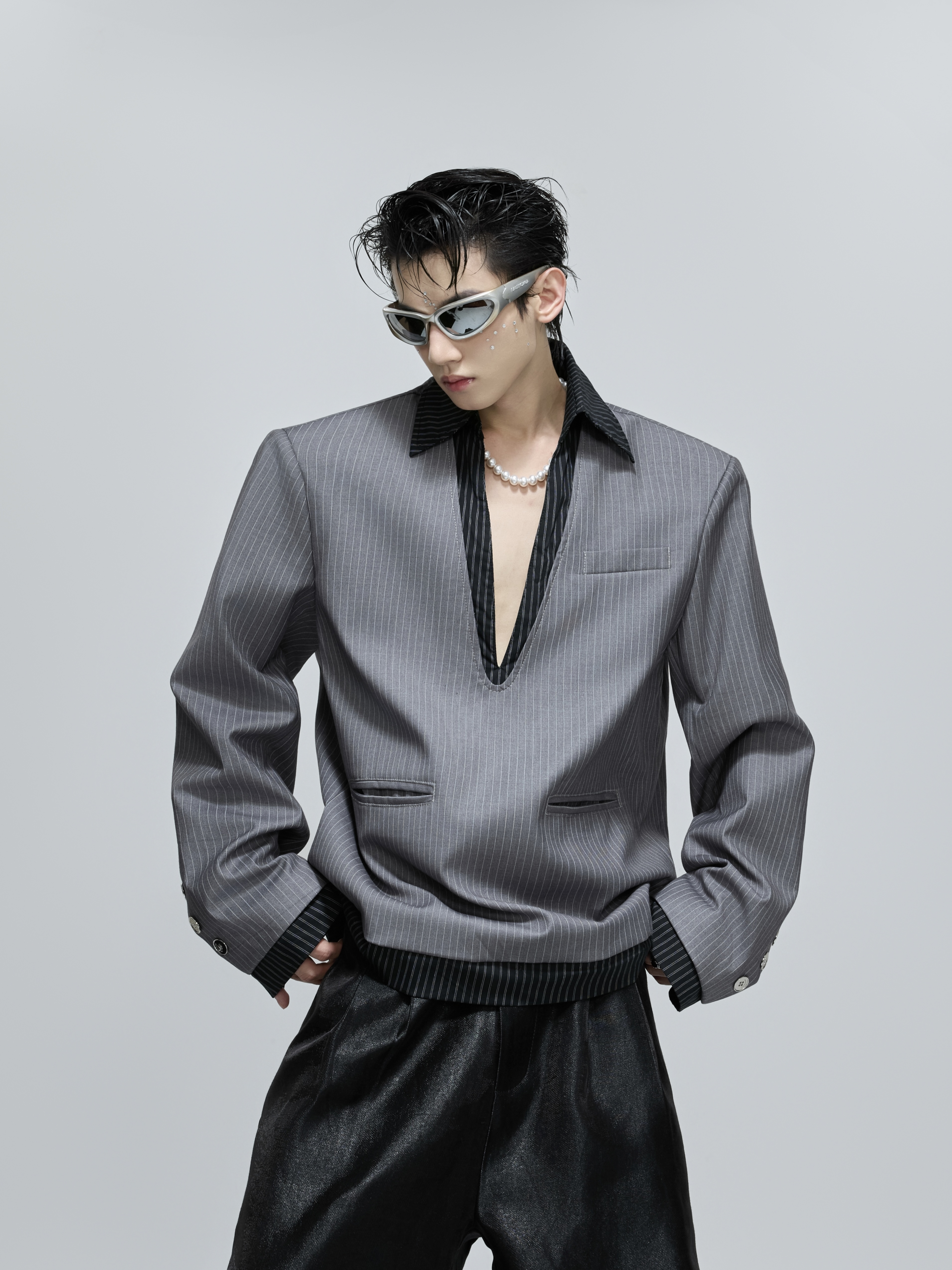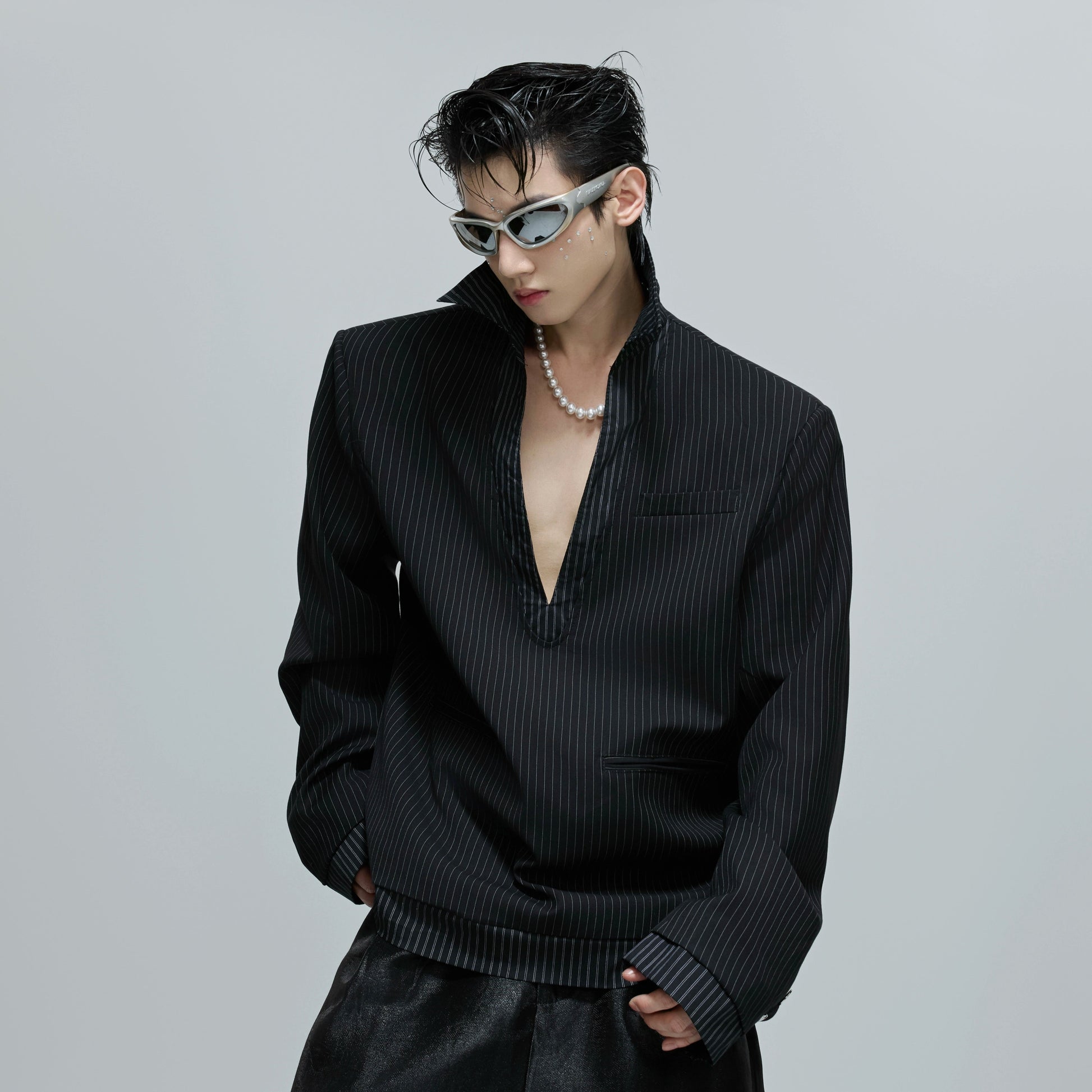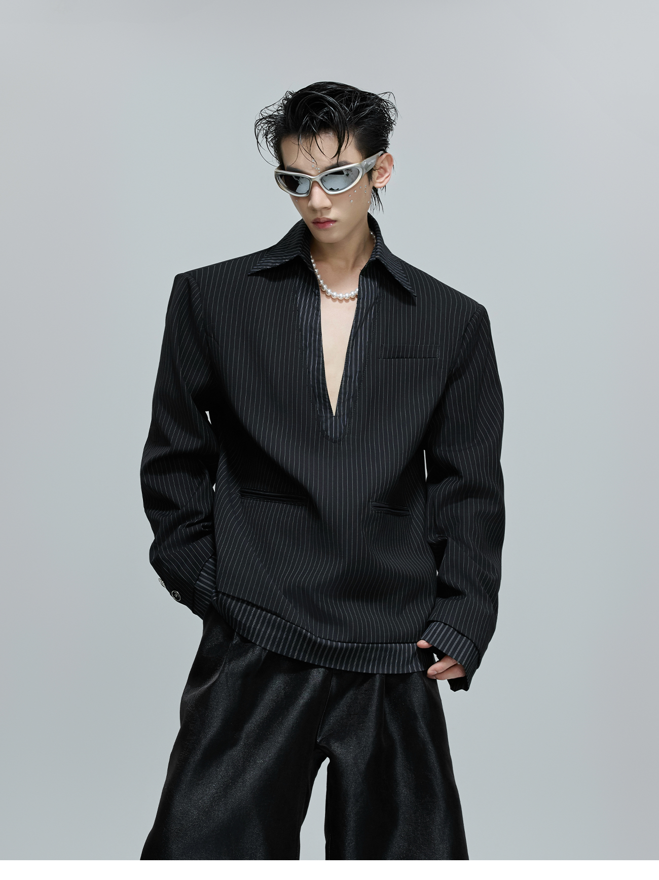 V-Neck Striped Shoulder-Pad Polo Shirt WN21689