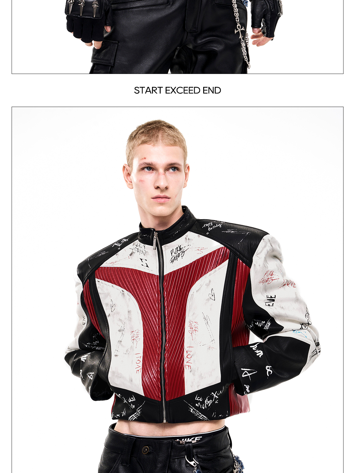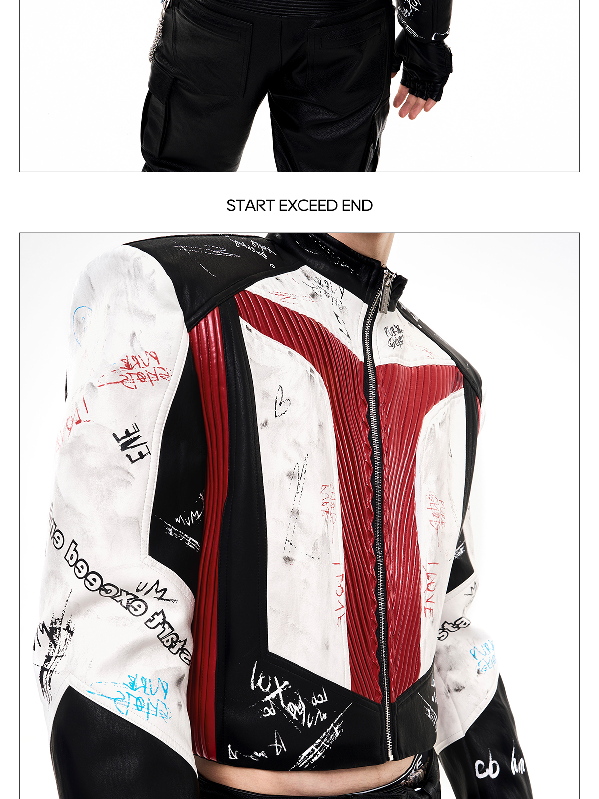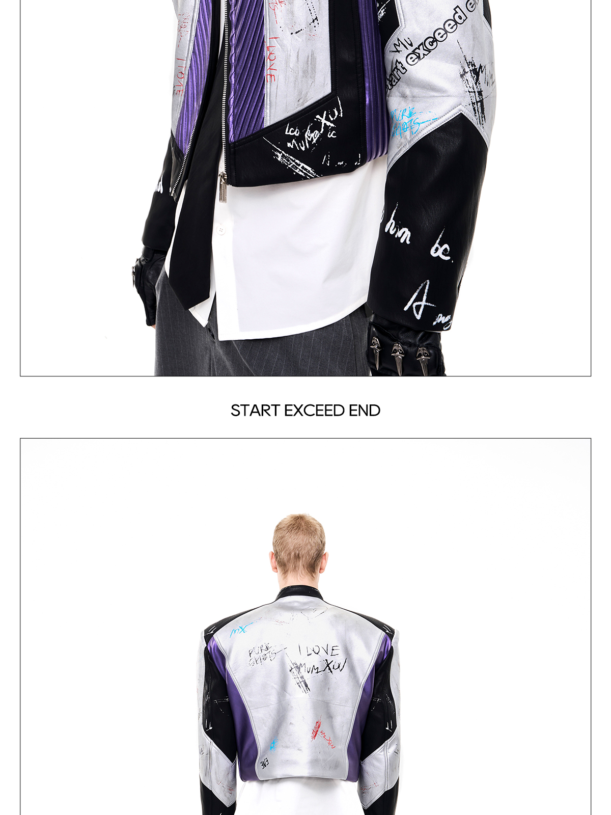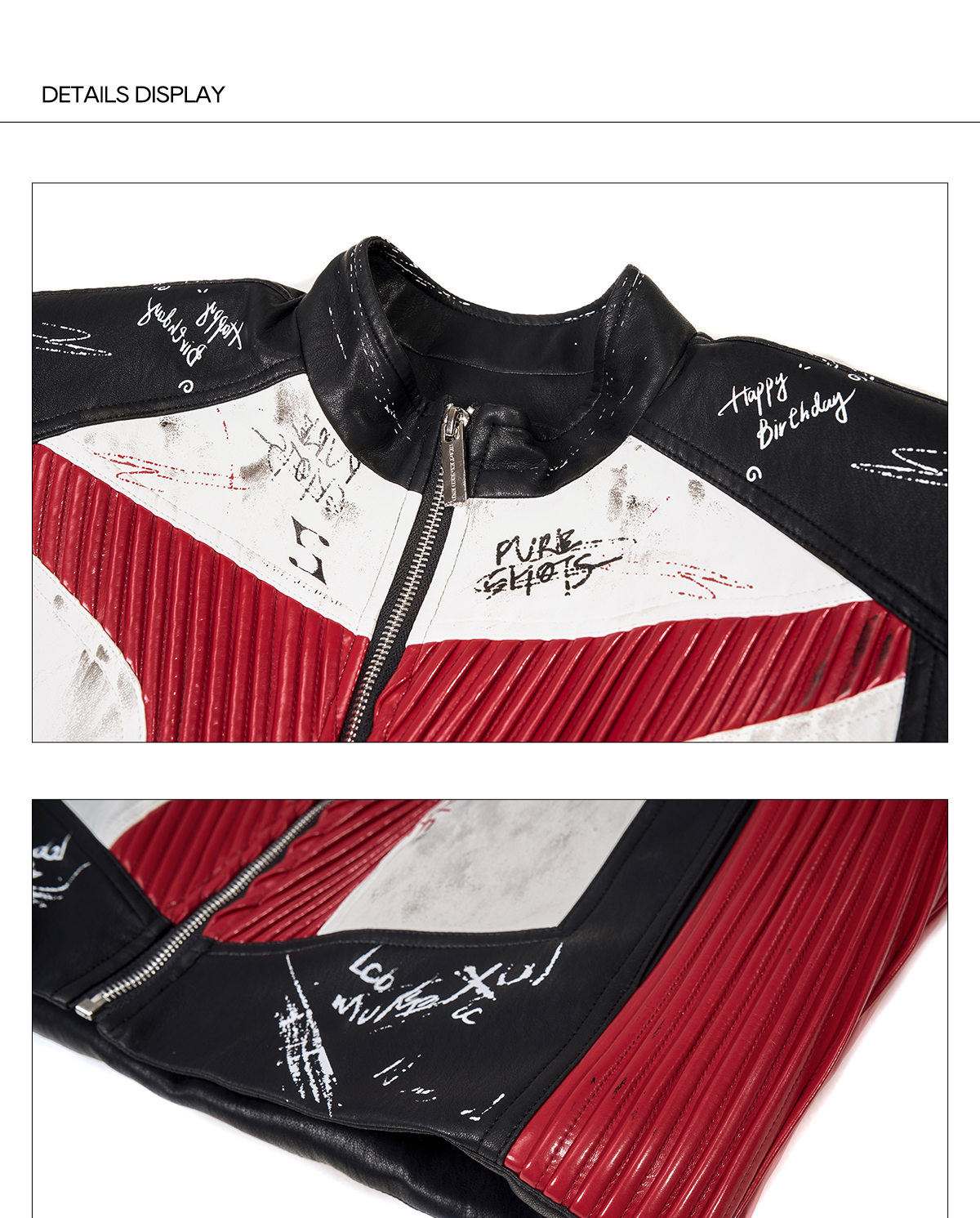 Graffiti Logo Print Stand Neck Patchwork PU Leather Short Jacket WN21808