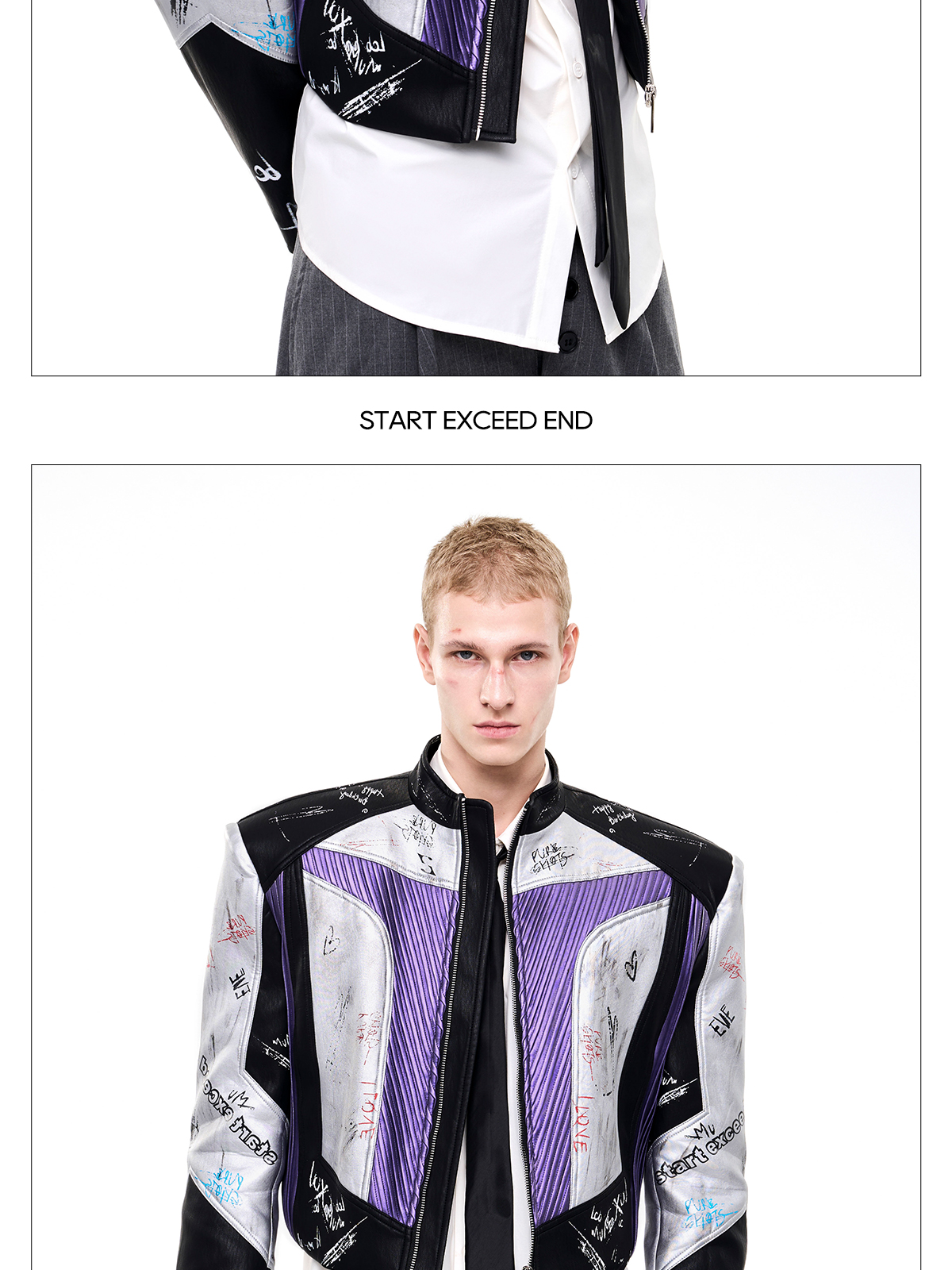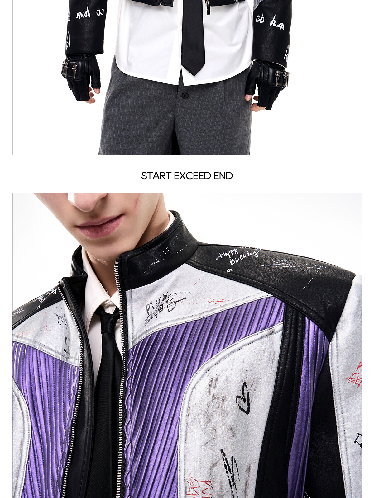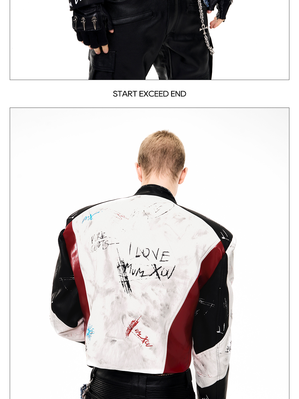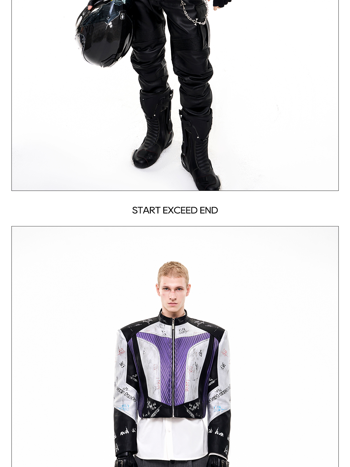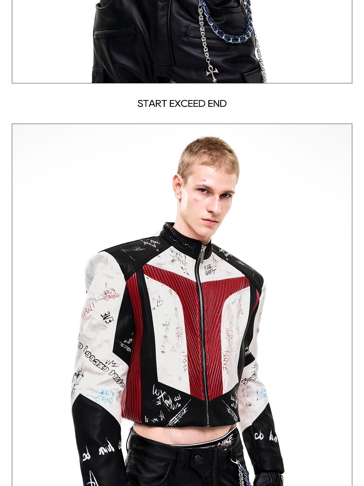 Graffiti Logo Print Stand Neck Patchwork PU Leather Short Jacket WN21808
