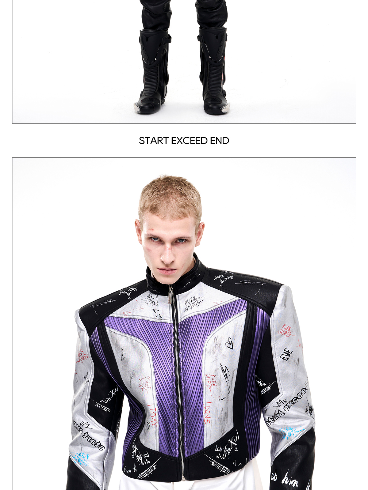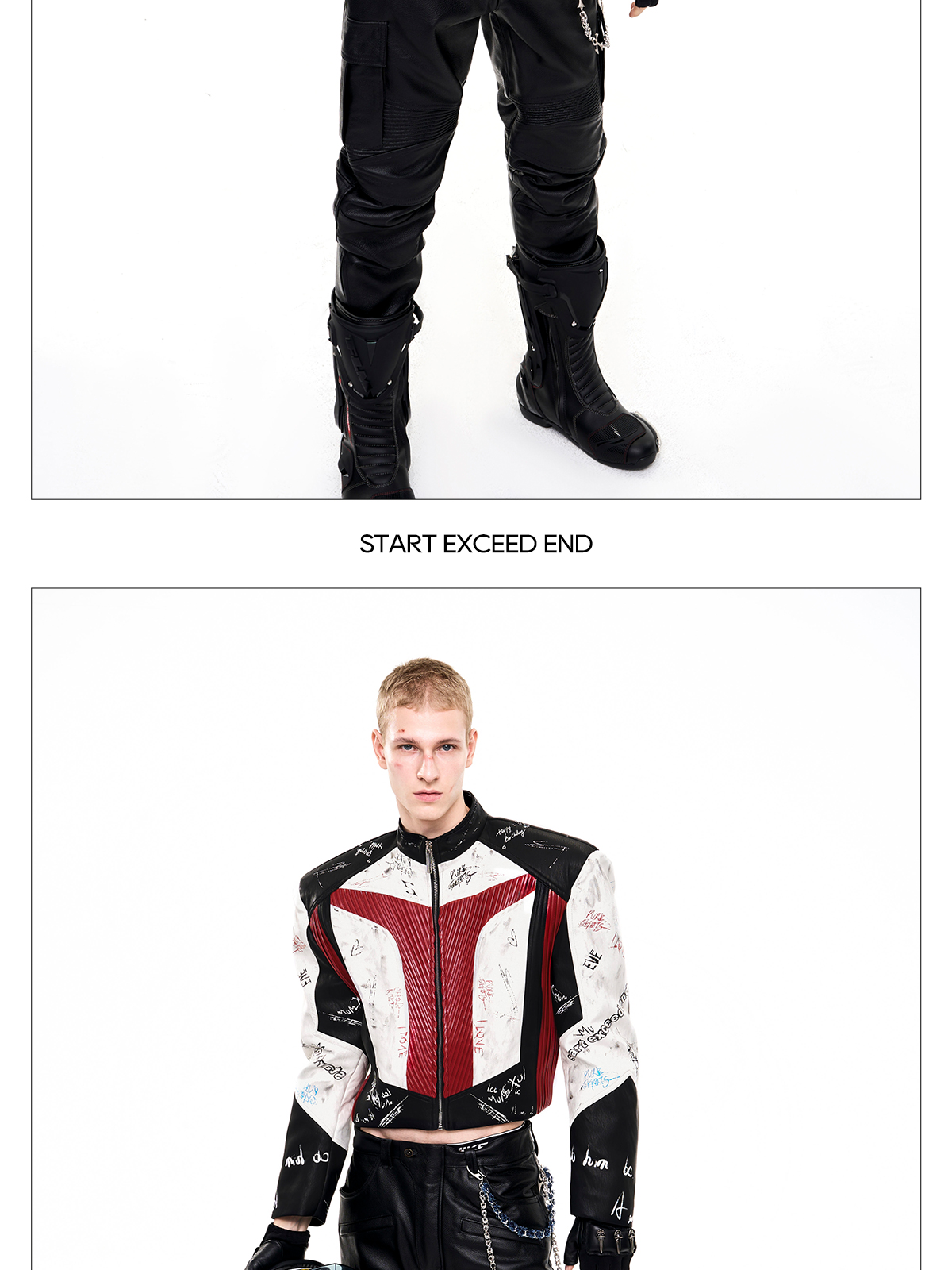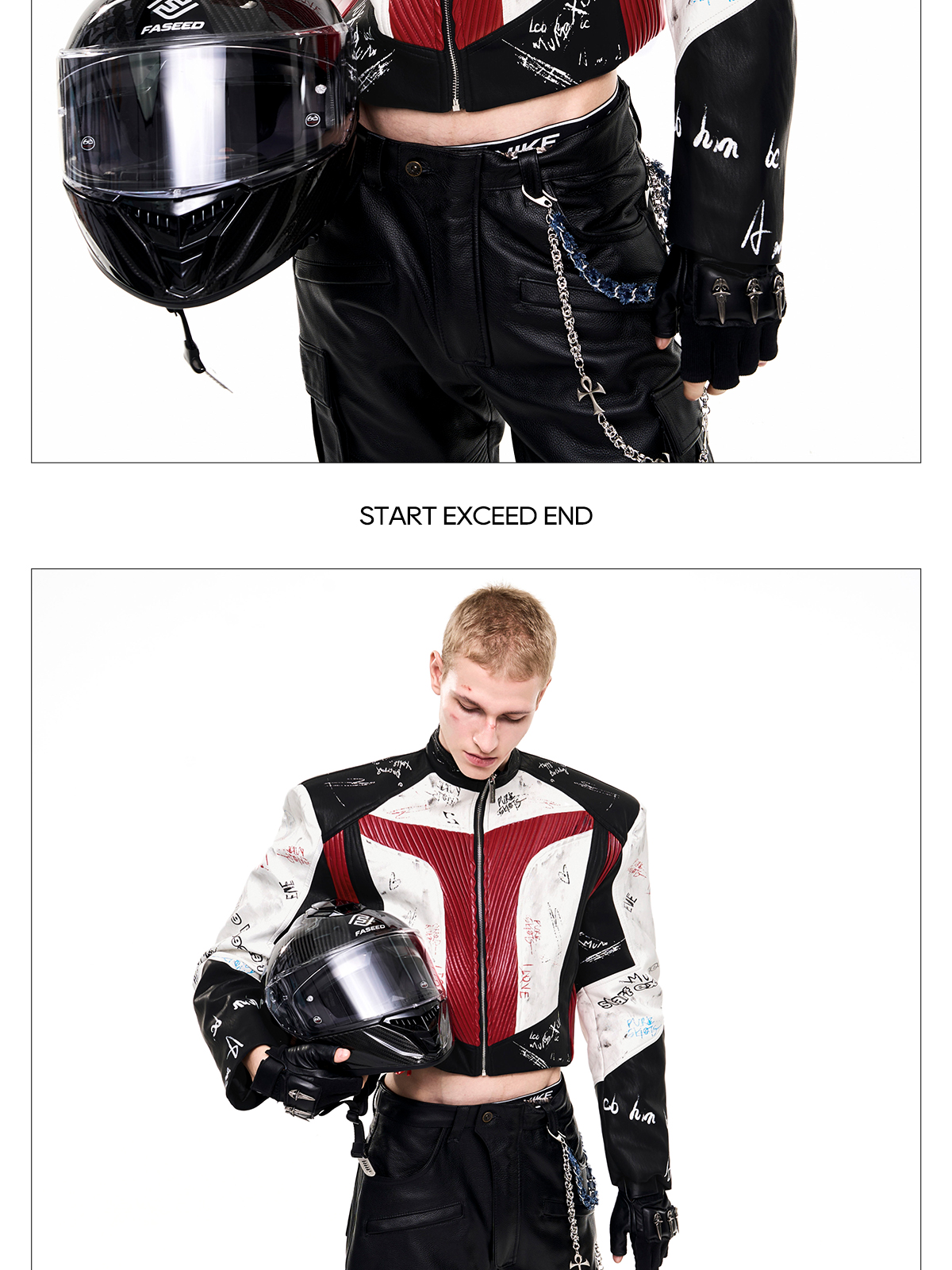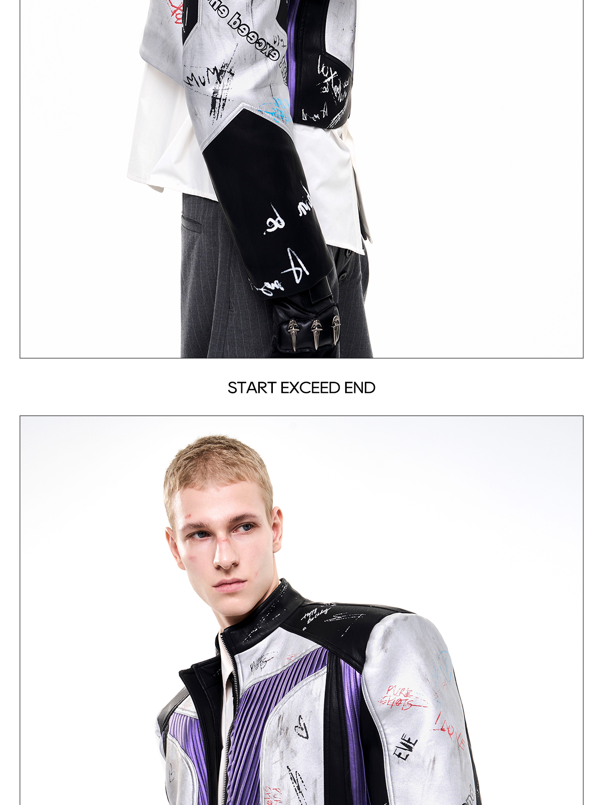 Graffiti Logo Print Stand Neck Patchwork PU Leather Short Jacket WN21808