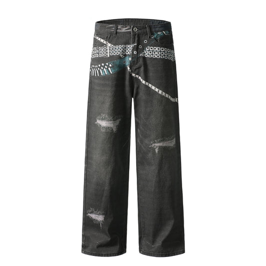 Washed Damage Metal Stud Wide Leg Denim Jeans WN22658