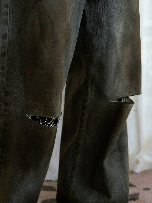 Splashing Ink Damage Wide-Leg Straight Denim Jeans WN8536