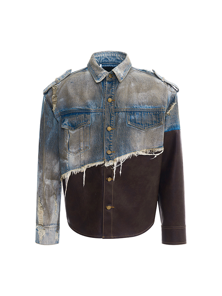 PU Leather Mix Damage Denim Jacket & Wide Leg PU Leather Mix Denim Jeans Setup WN10183
