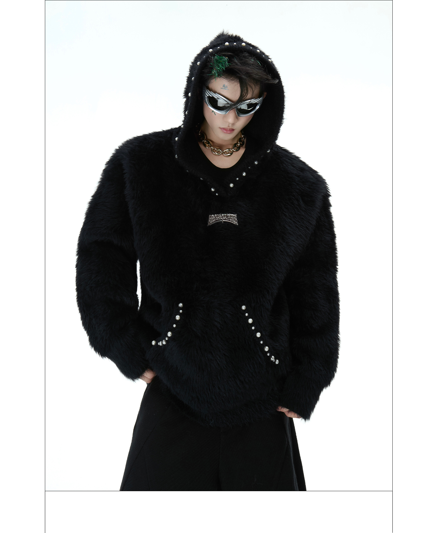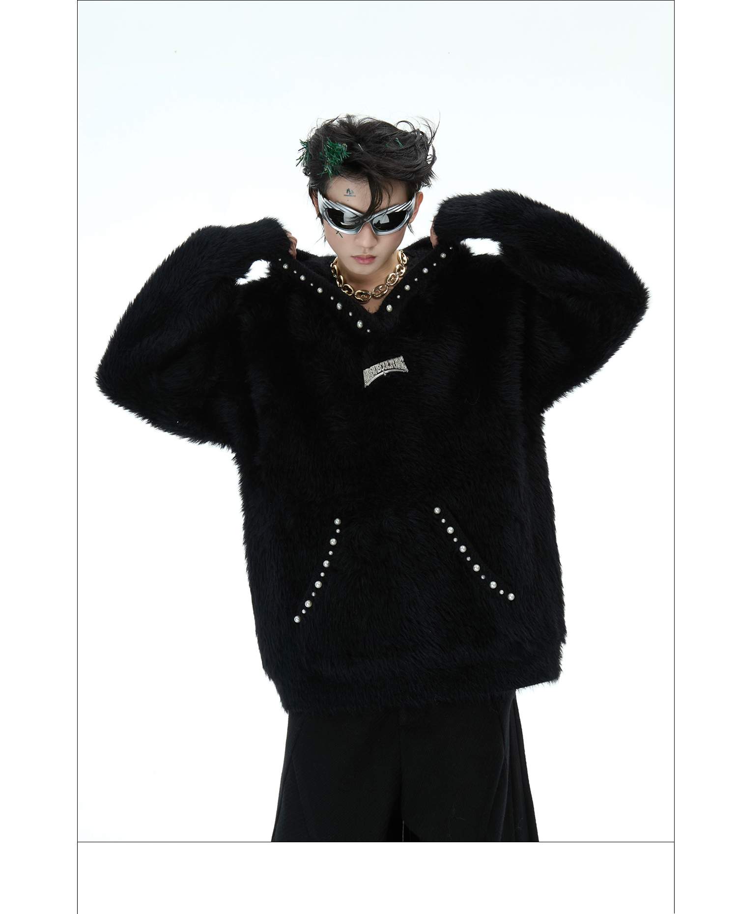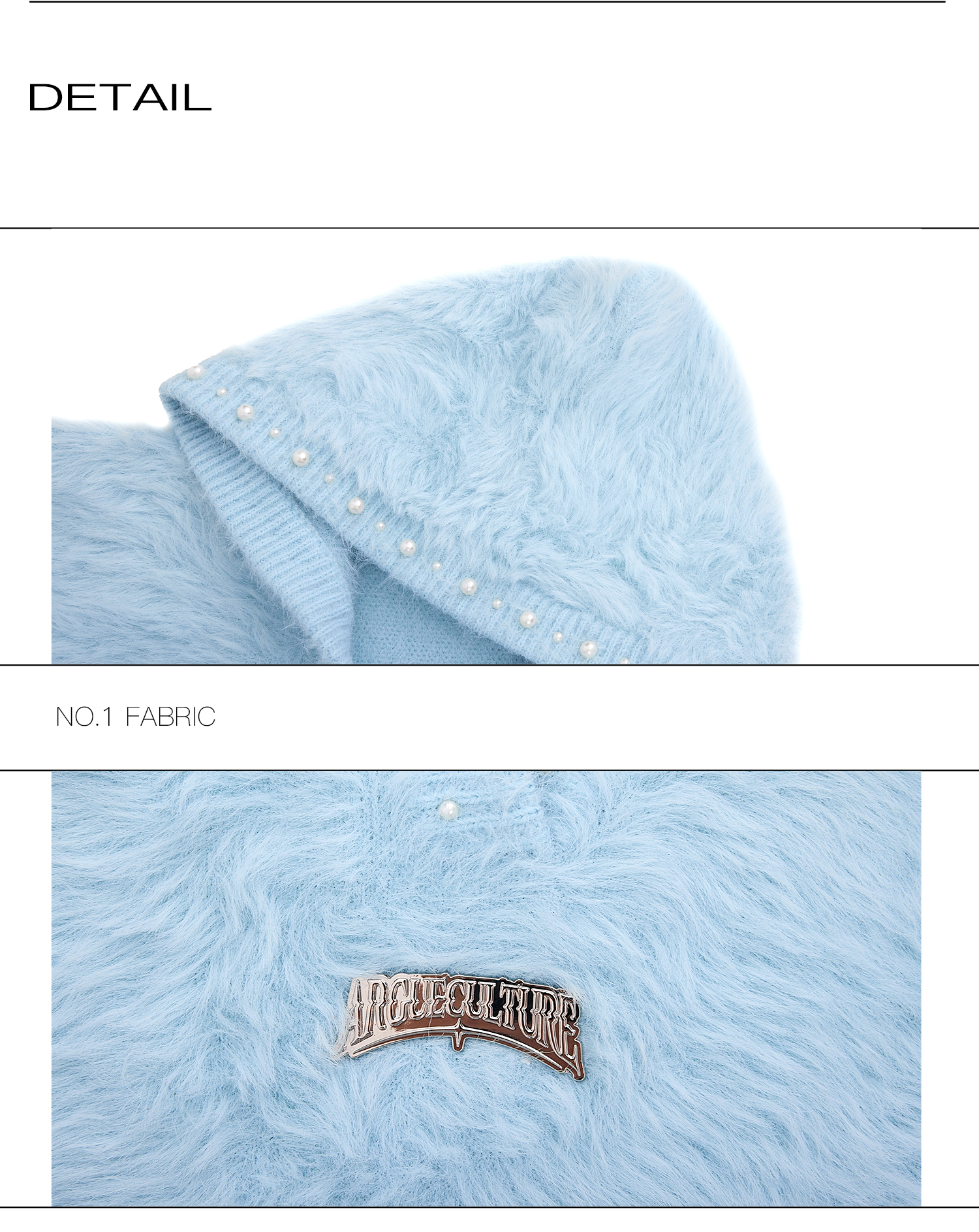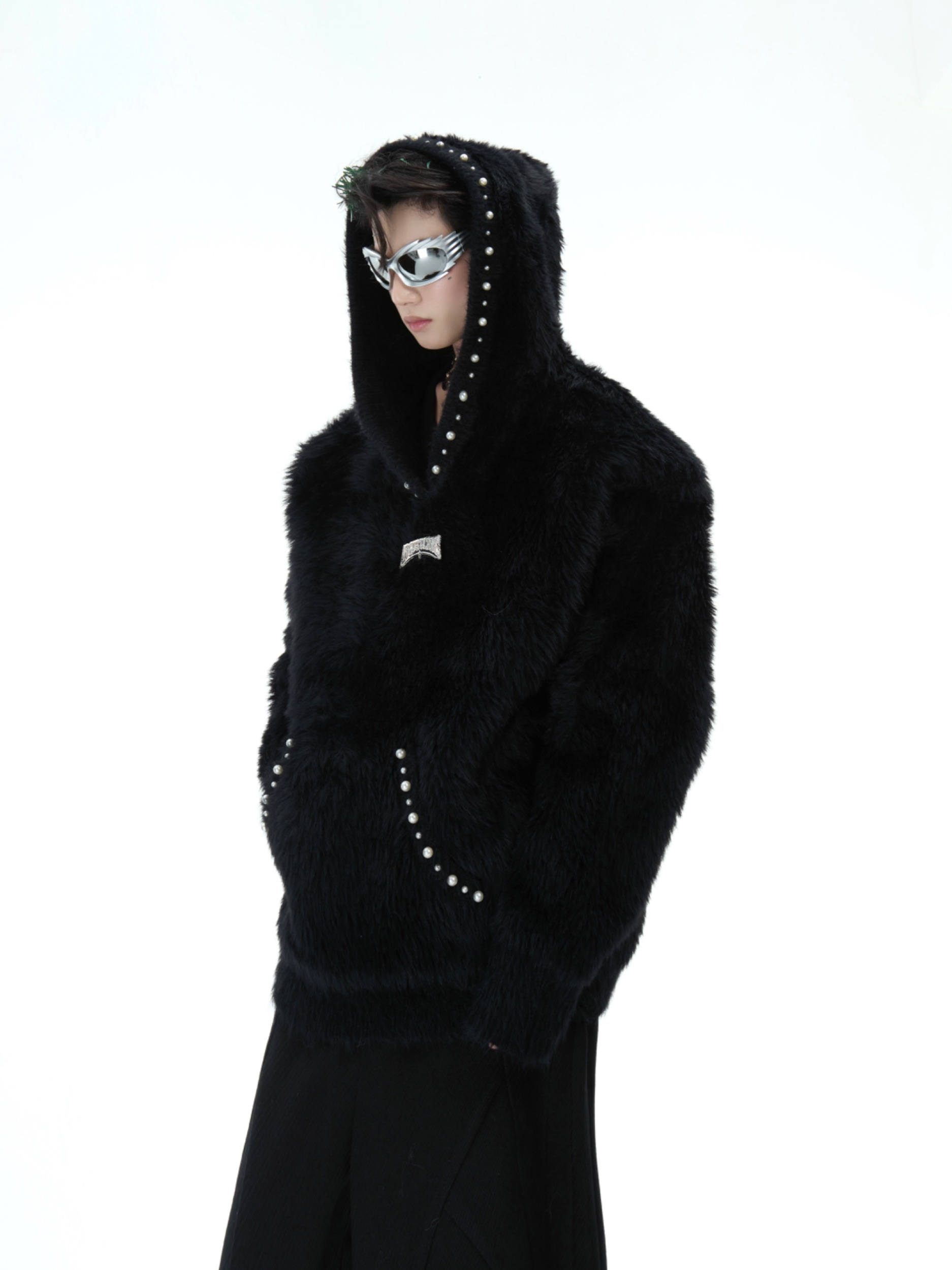 Pearl-Embellished Furry Hooded Knit Sweater WN11614