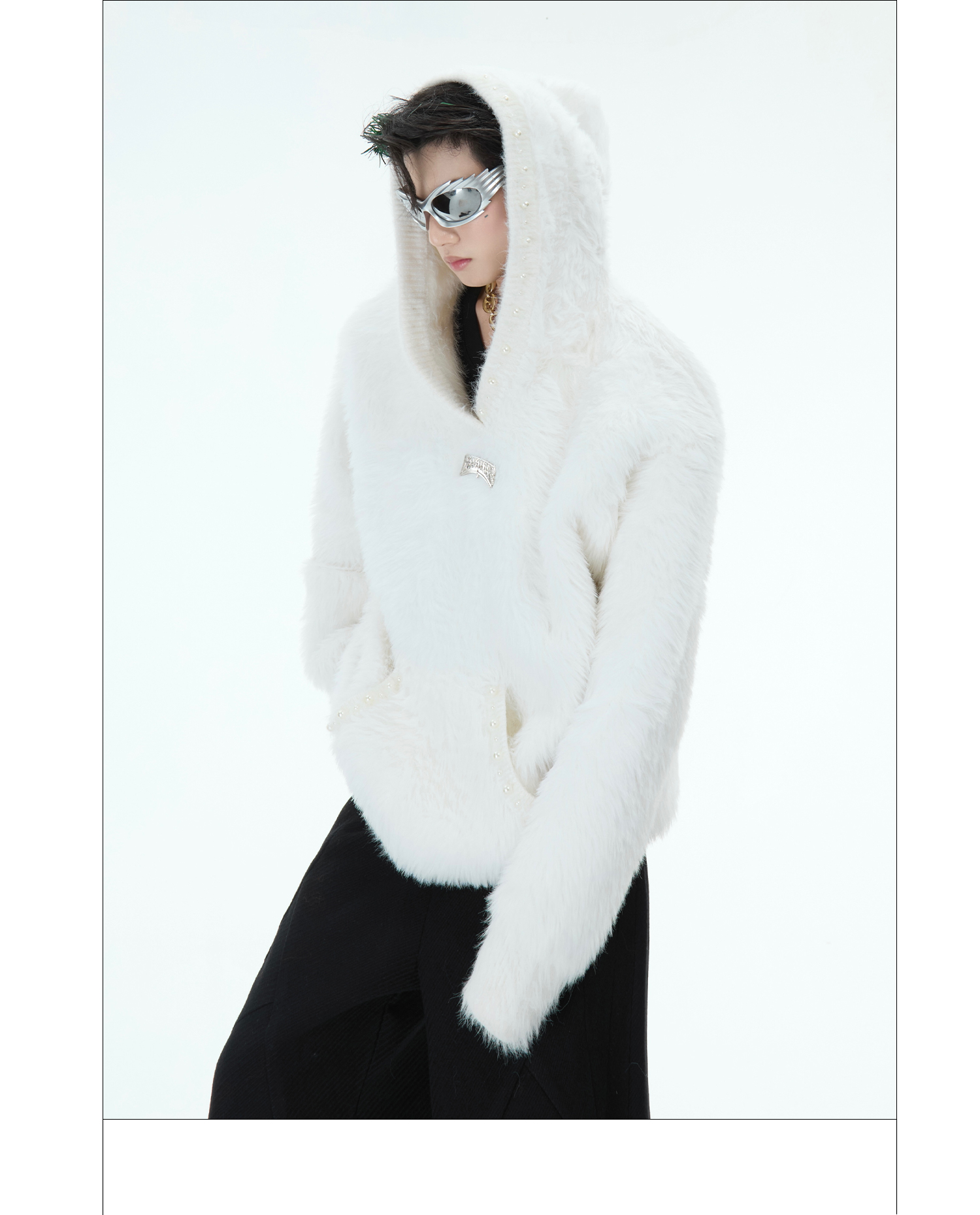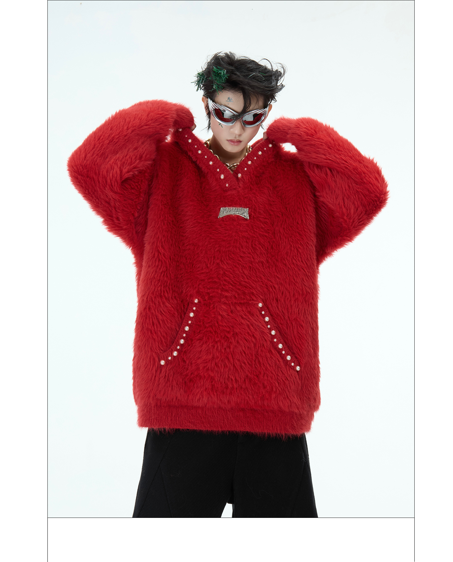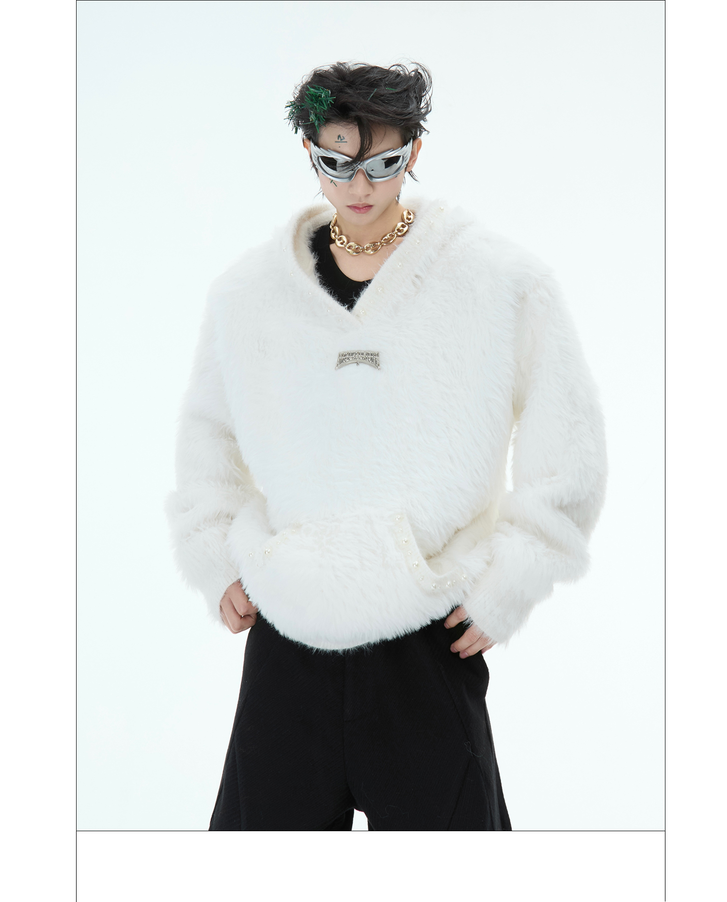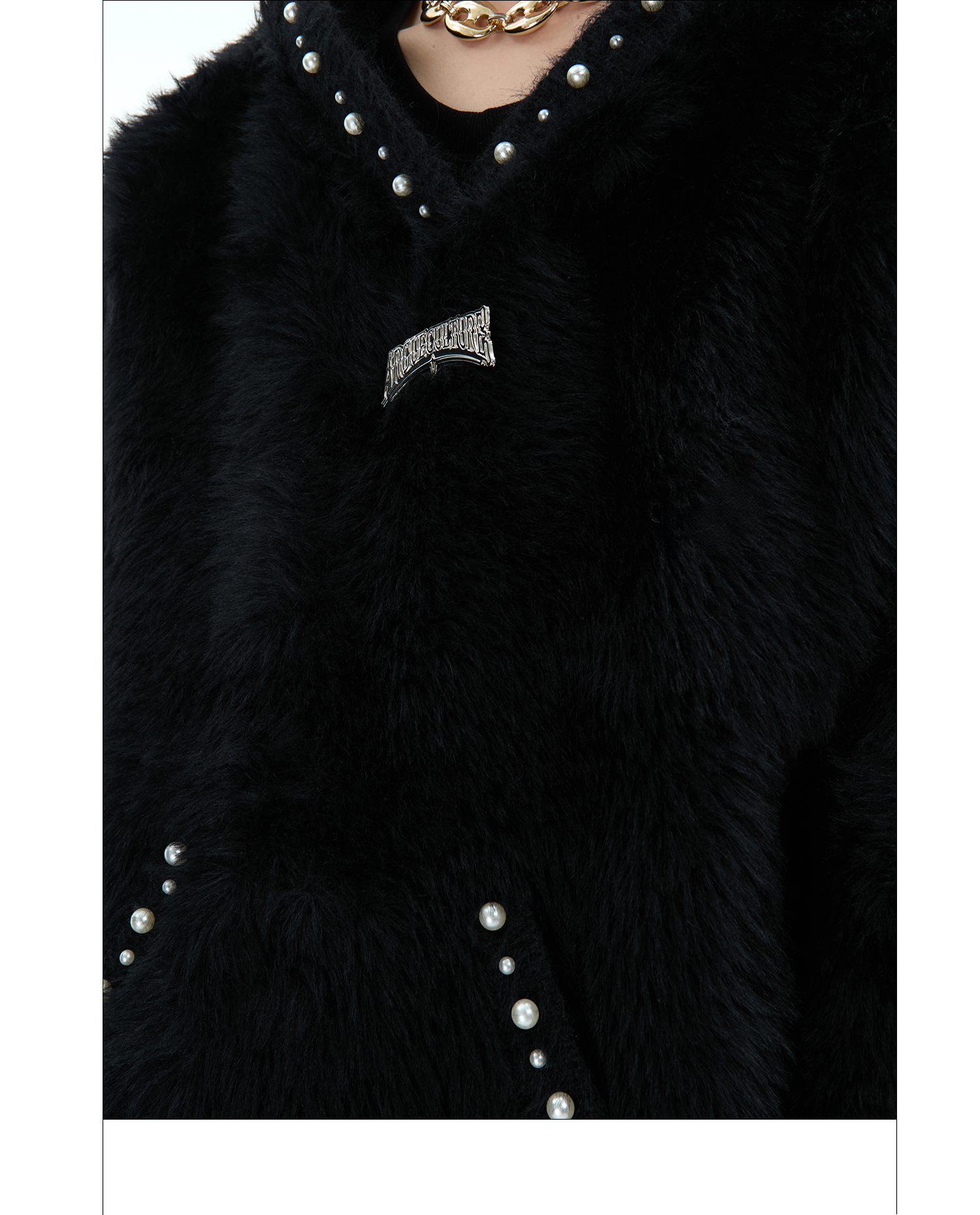 Pearl-Embellished Furry Hooded Knit Sweater WN11614