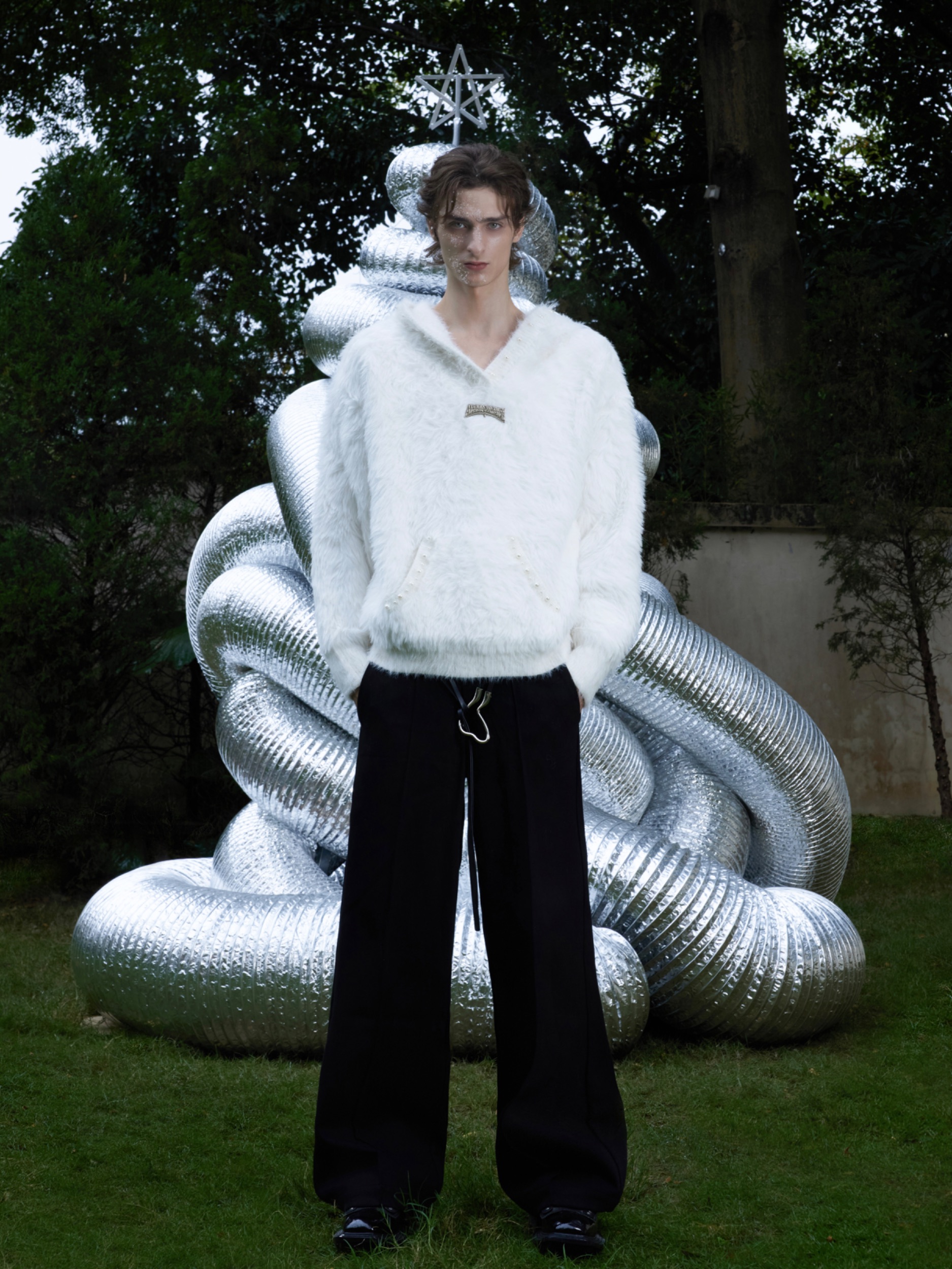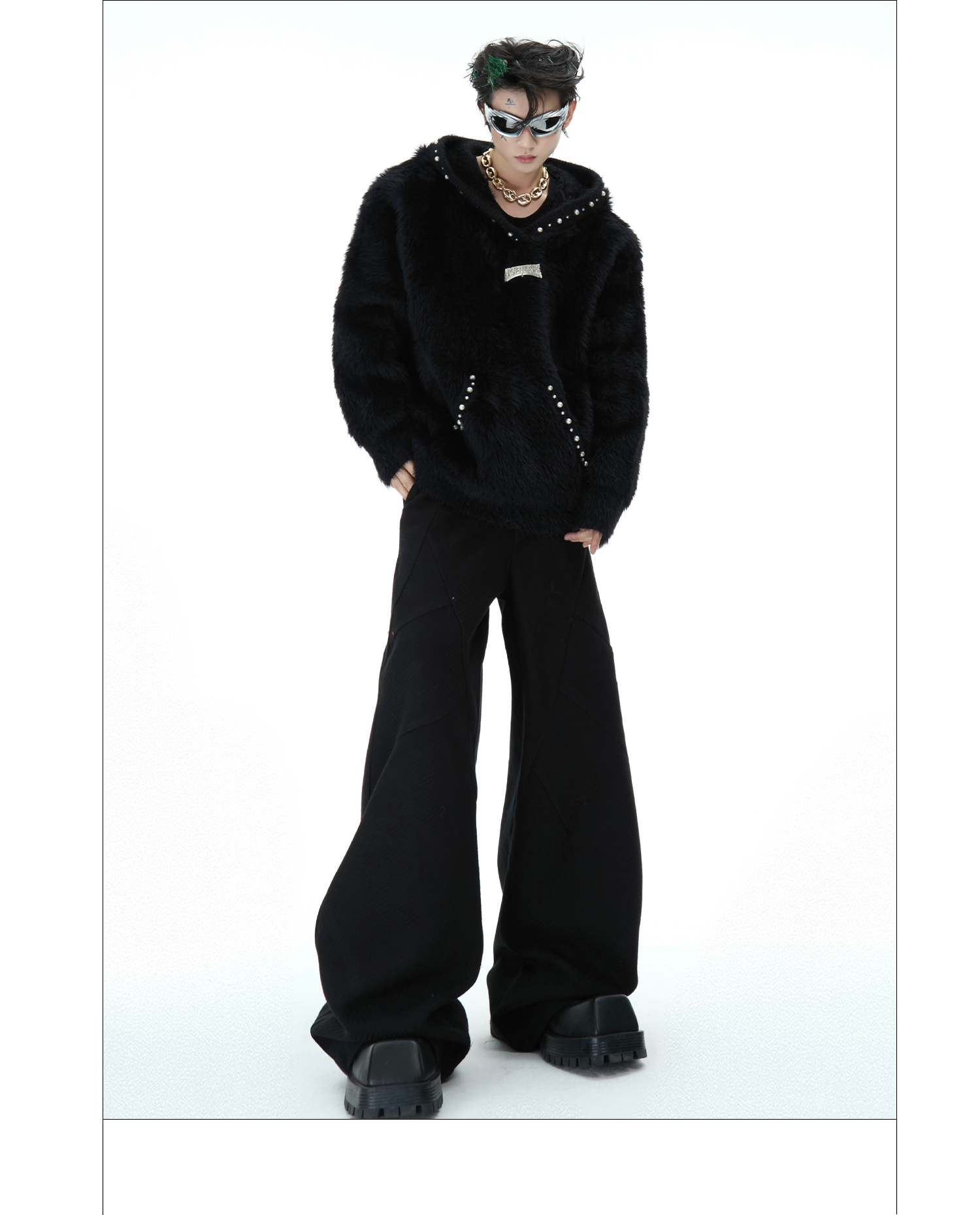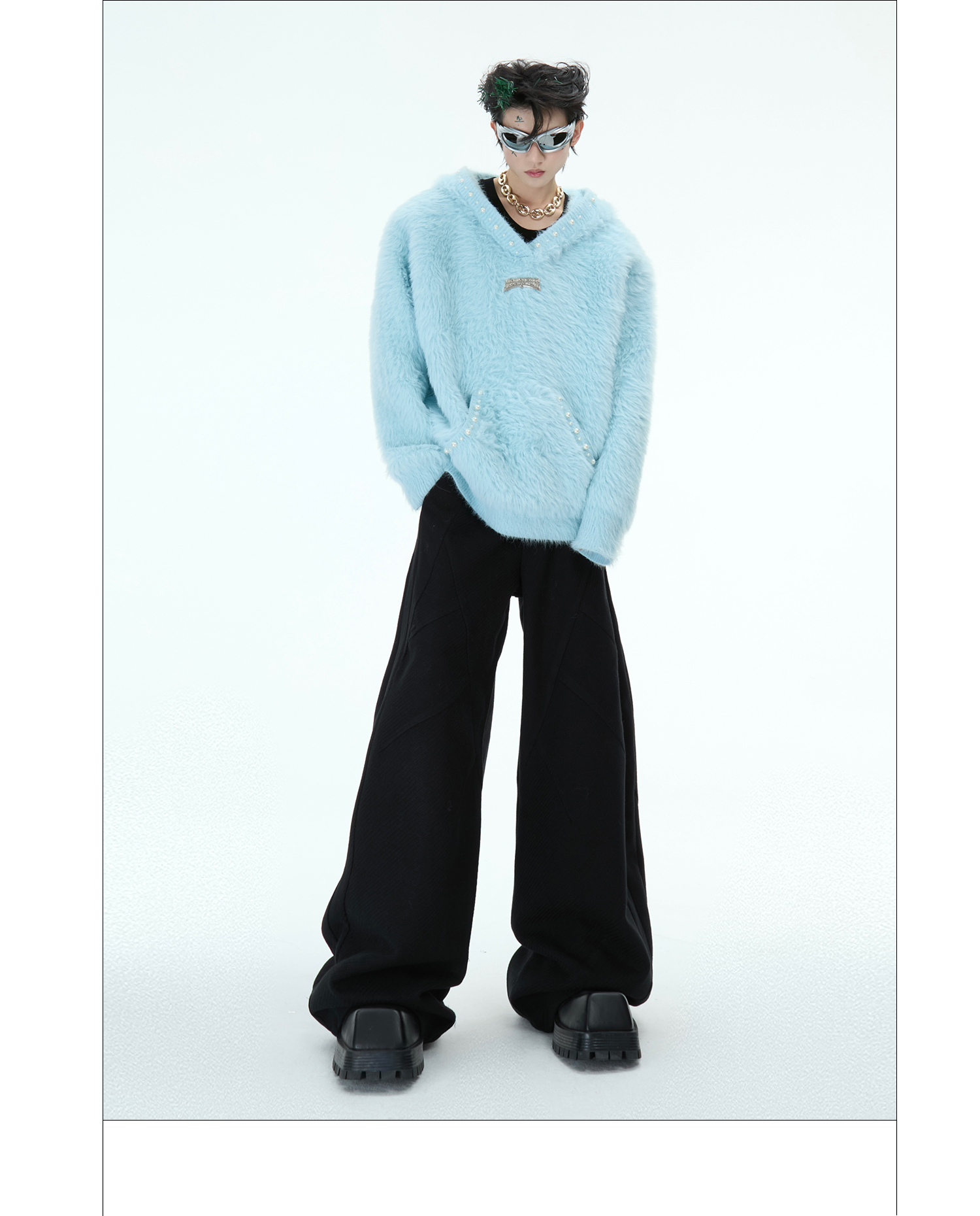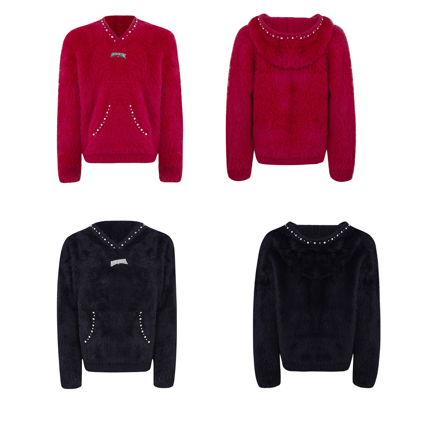 Pearl-Embellished Furry Hooded Knit Sweater WN11614
