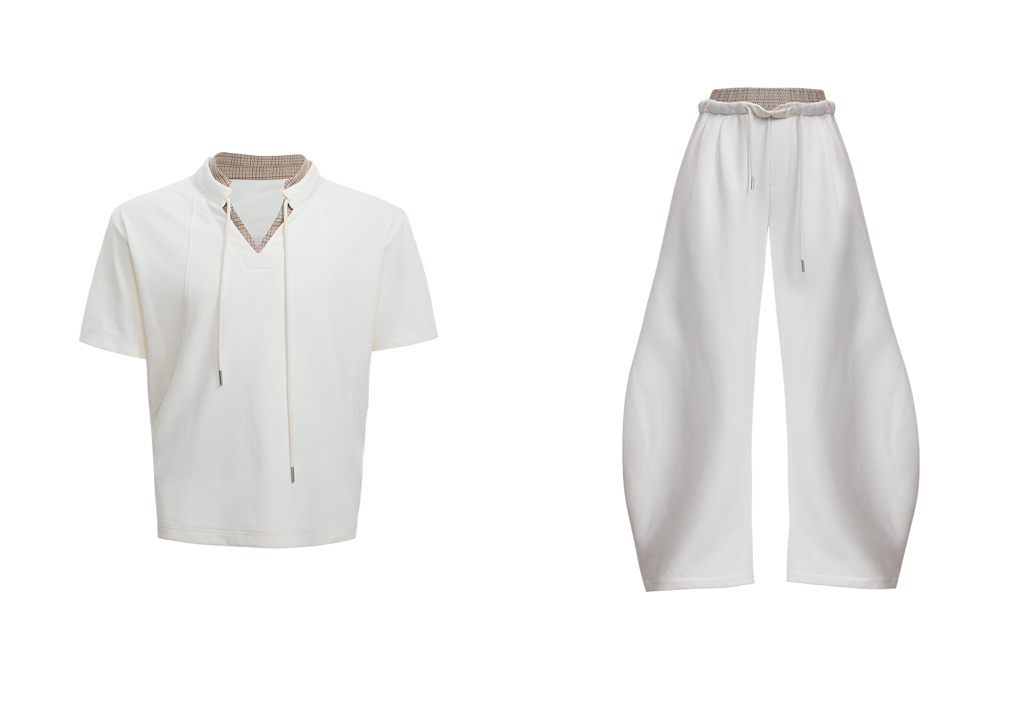 Houndstooth V-Neck Short Sleeve T-Shirt & Double Waistband Curved Hem Pants Setup WN18366
