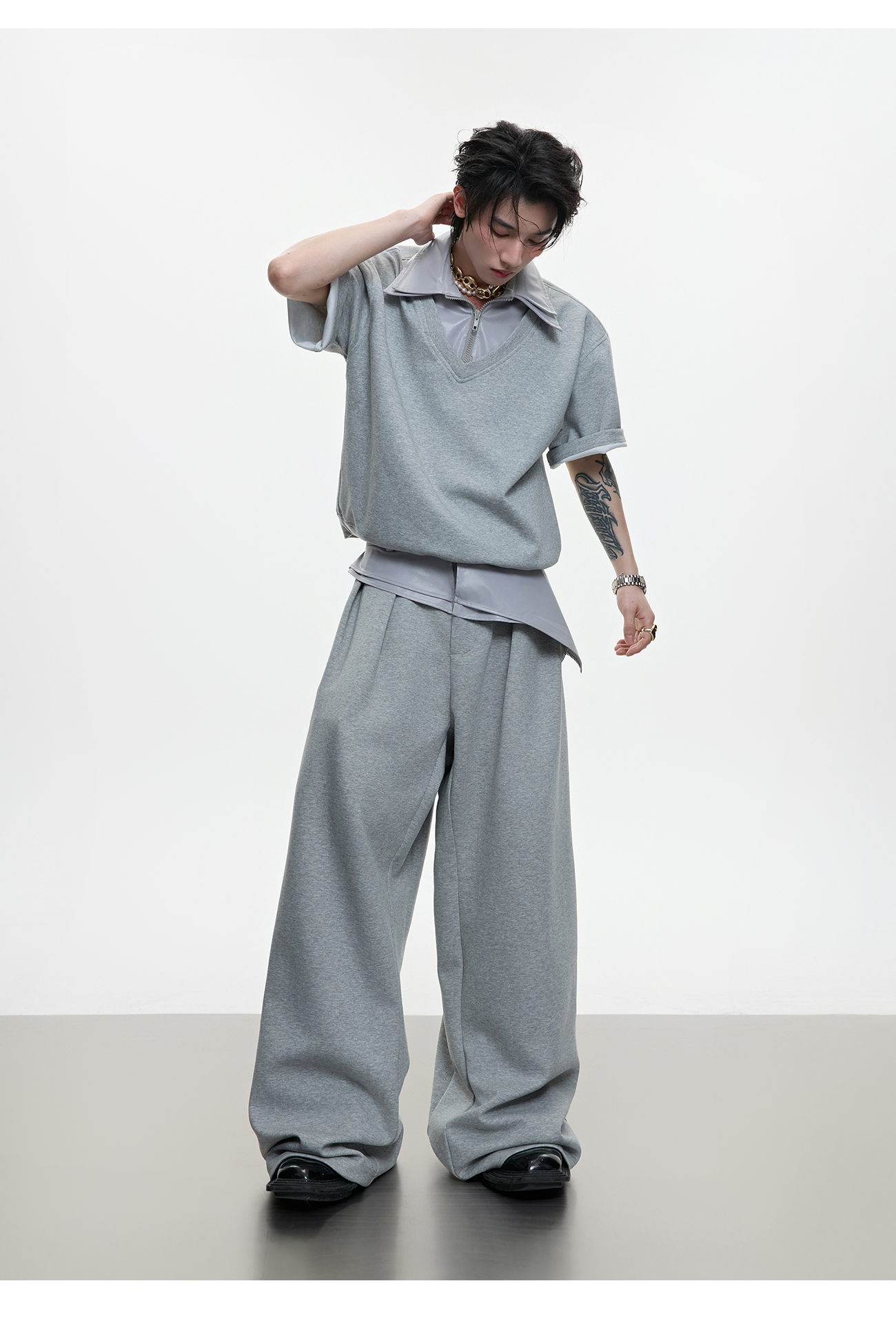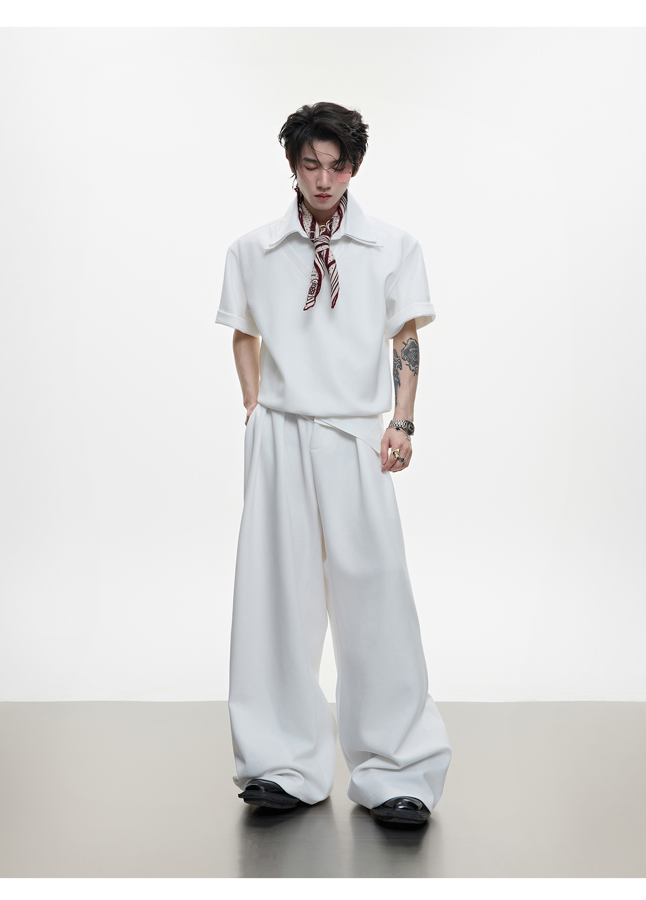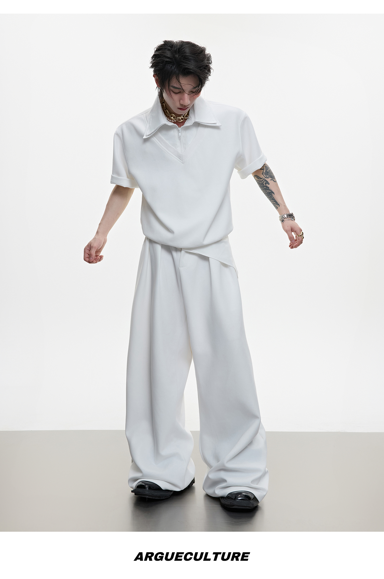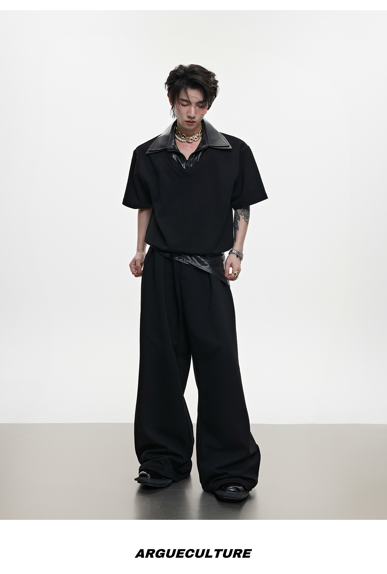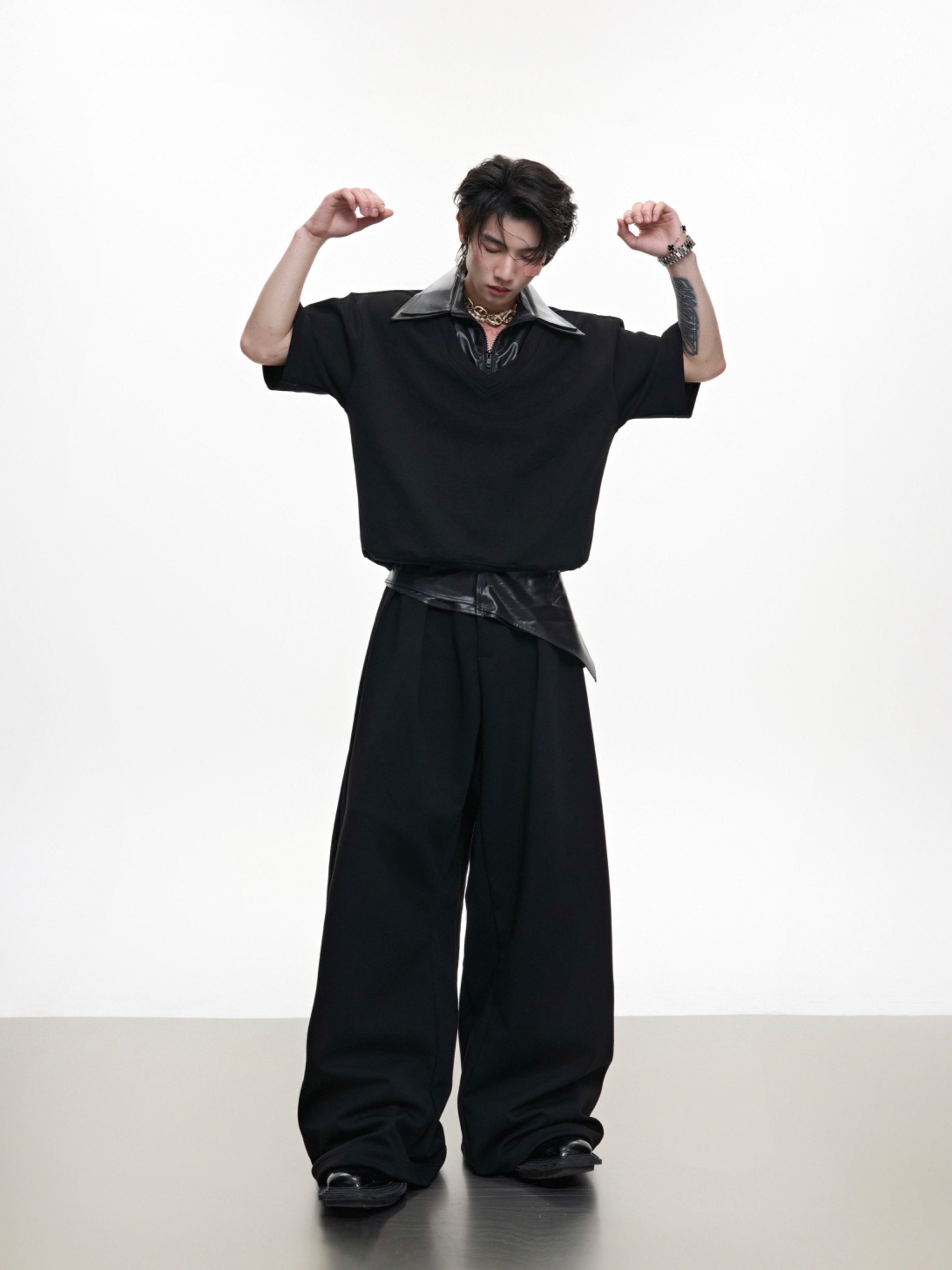 Glossy Double Collar Fake Layered Short Sleeve T-Shirt & Wide Leg Pants Setup WN18371