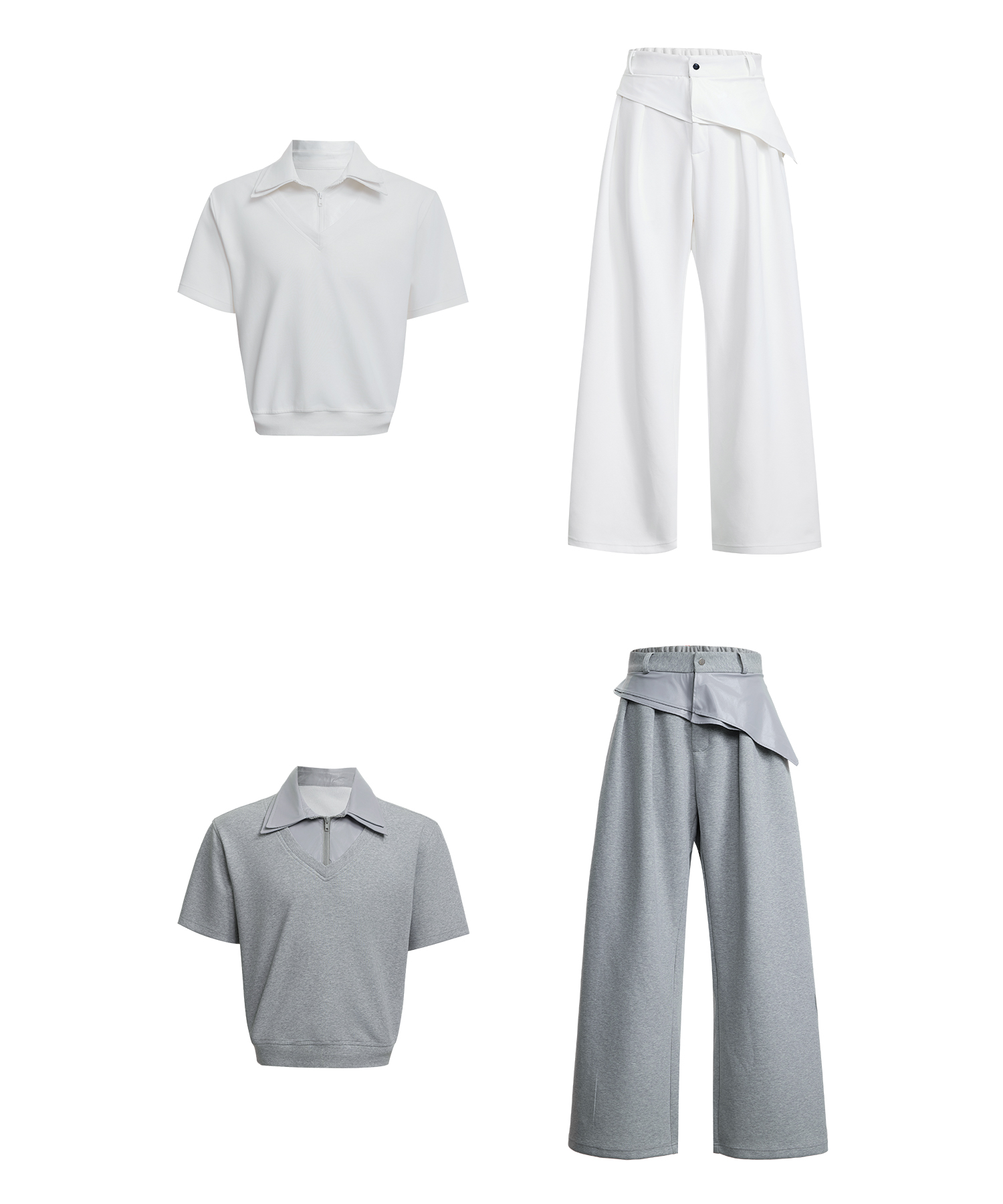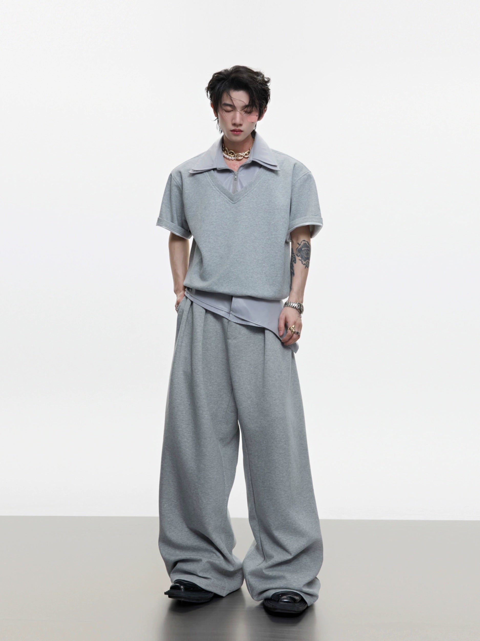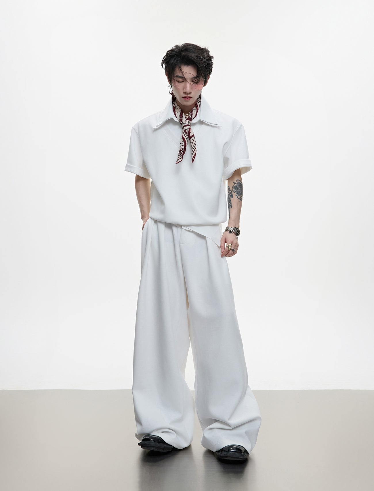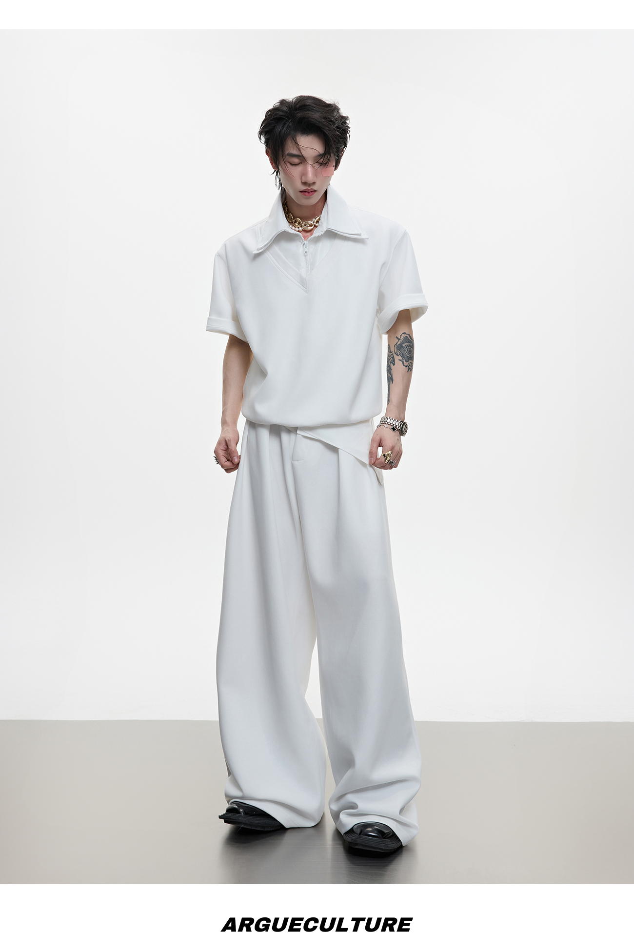 Glossy Double Collar Fake Layered Short Sleeve T-Shirt & Wide Leg Pants Setup WN18371