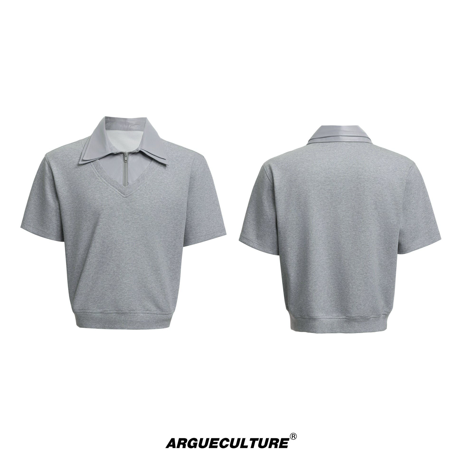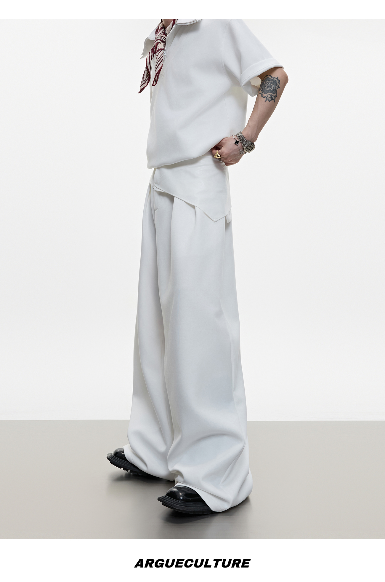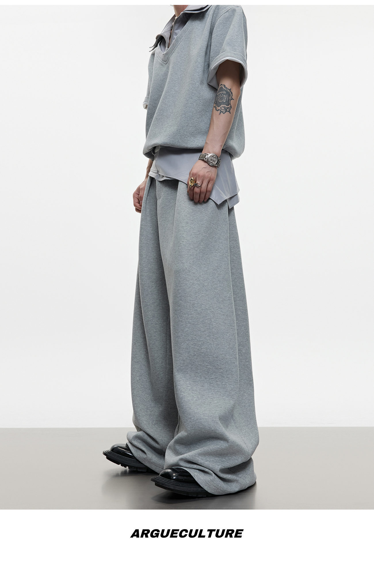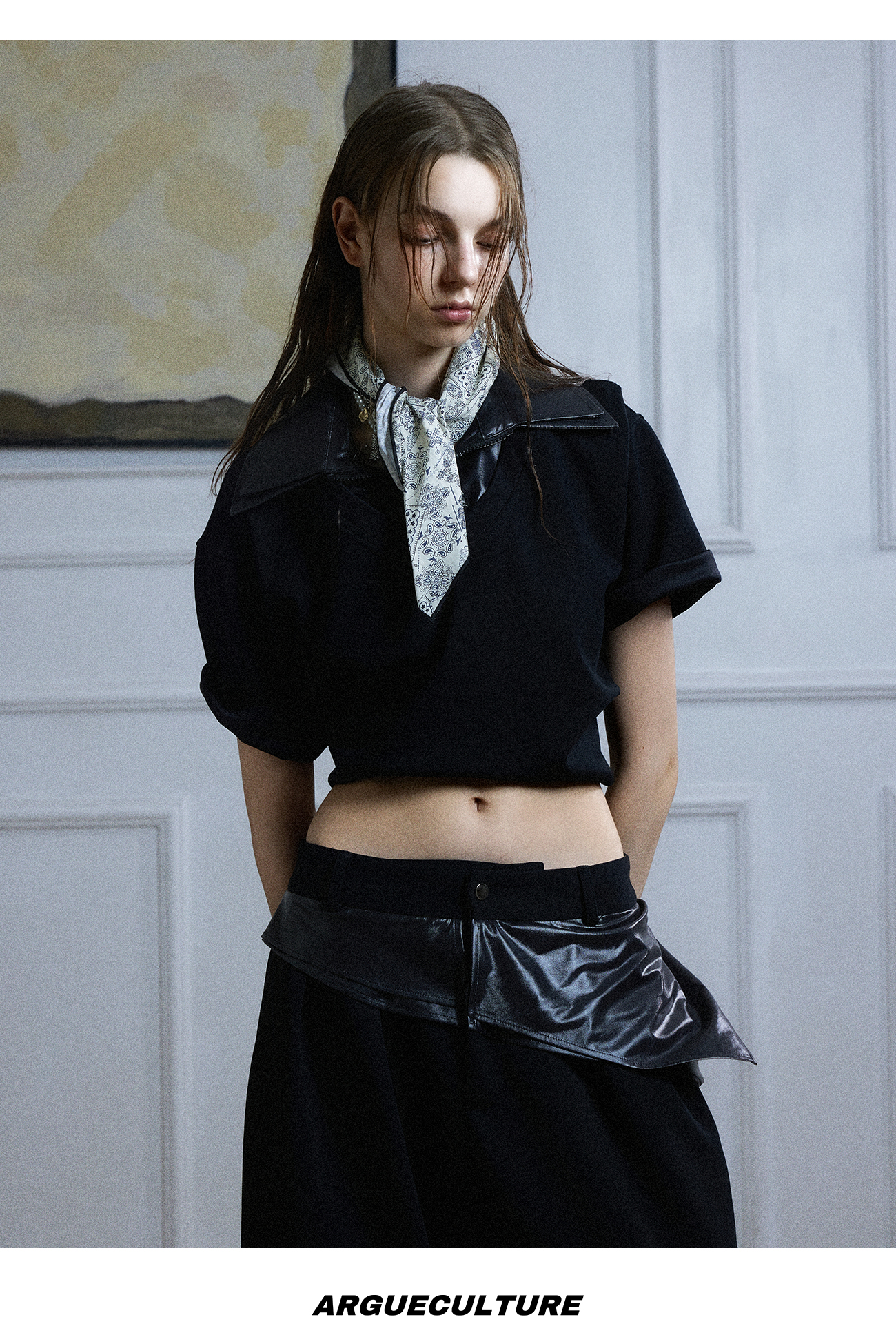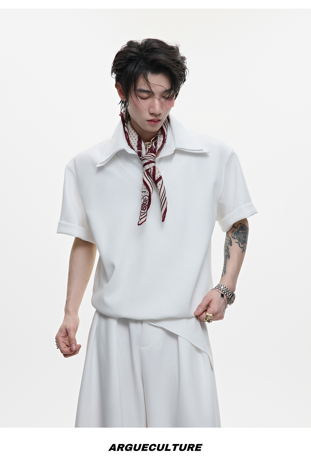 Glossy Double Collar Fake Layered Short Sleeve T-Shirt & Wide Leg Pants Setup WN18371