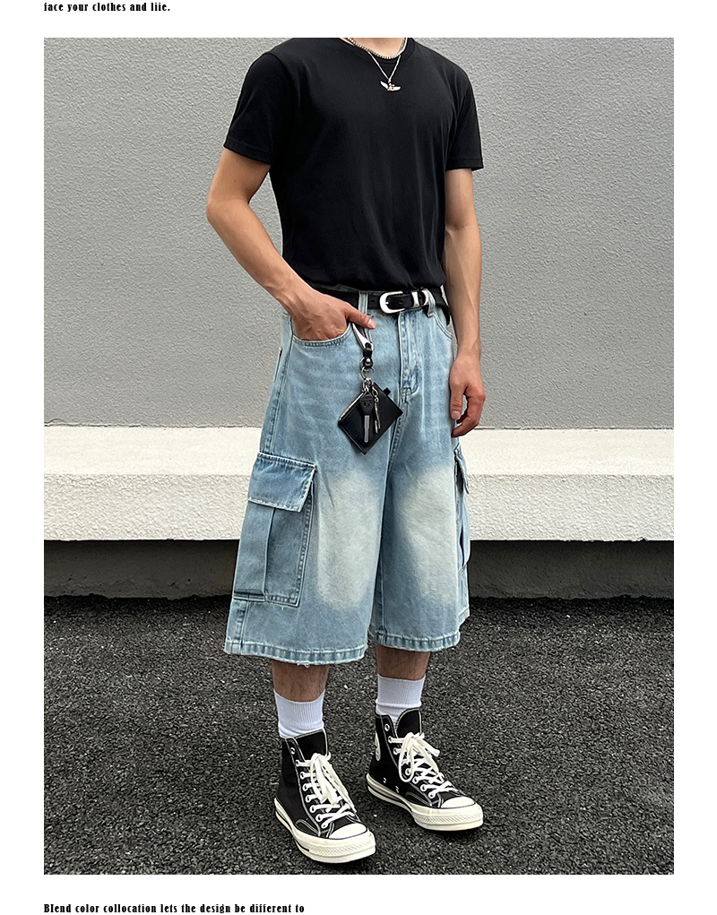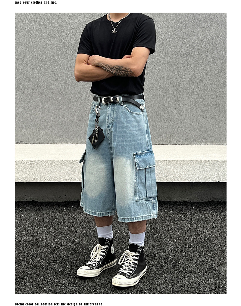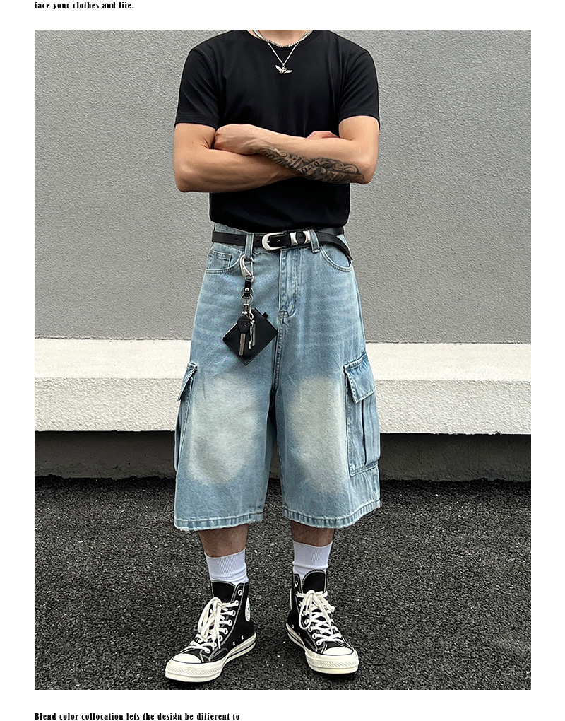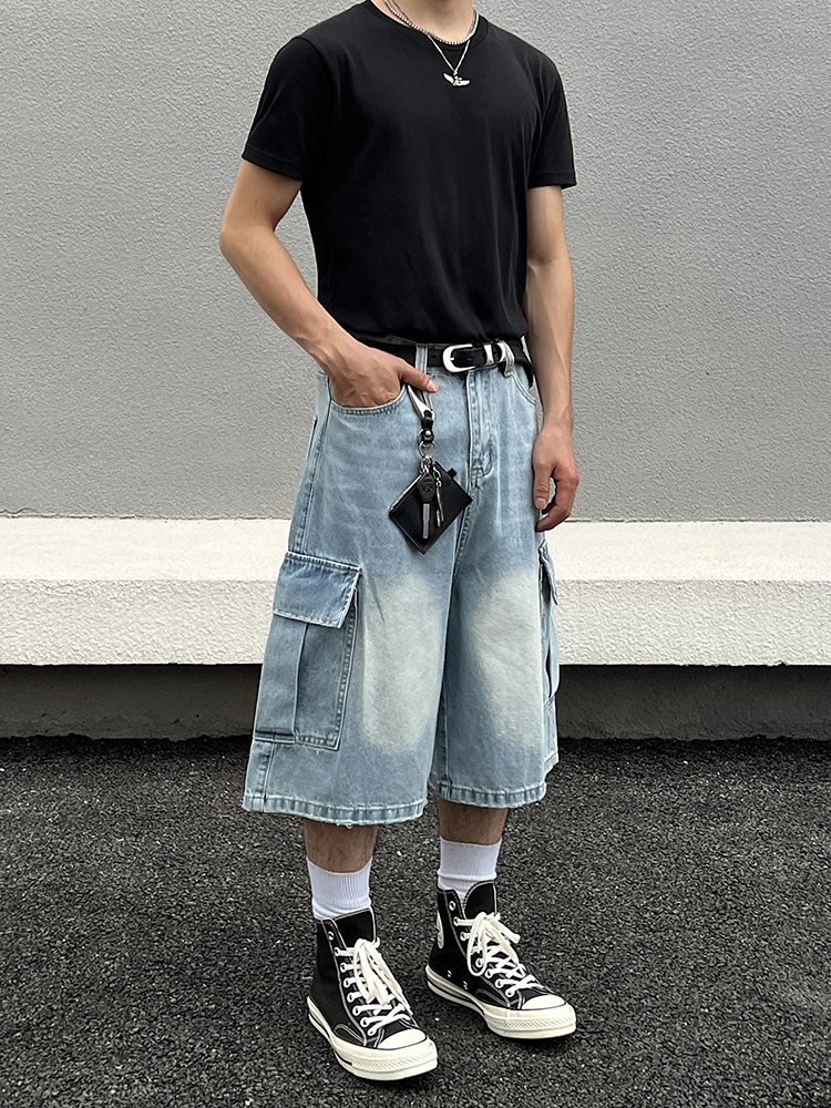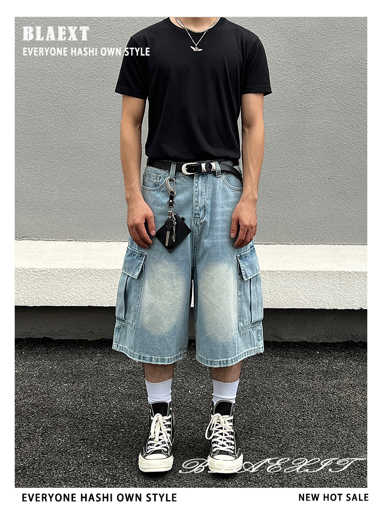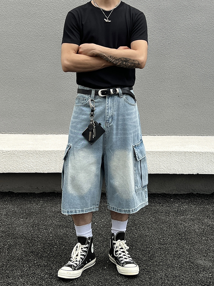 Washed Light Blue Multi-Pocket Wide Leg Denim Half Pants WN19555