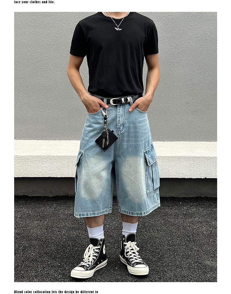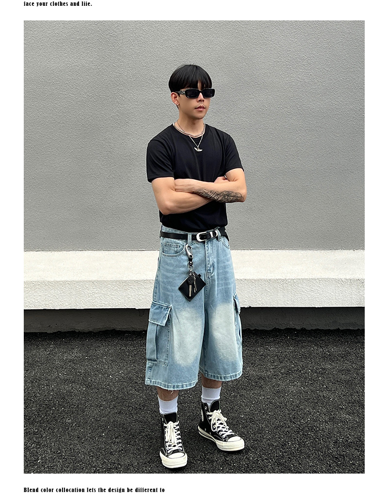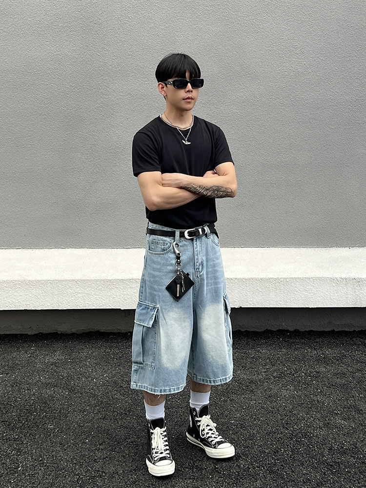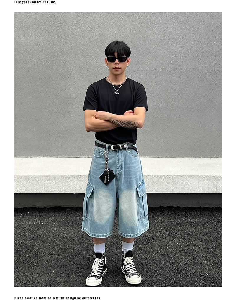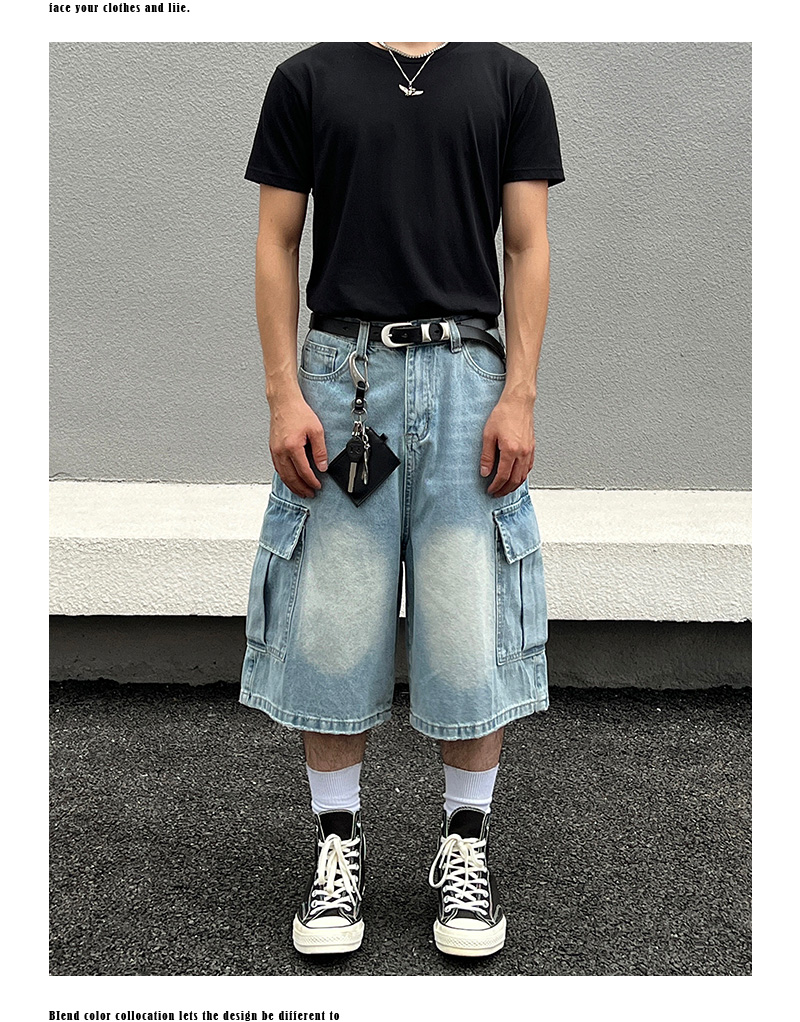 Washed Light Blue Multi-Pocket Wide Leg Denim Half Pants WN19555