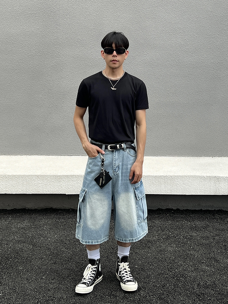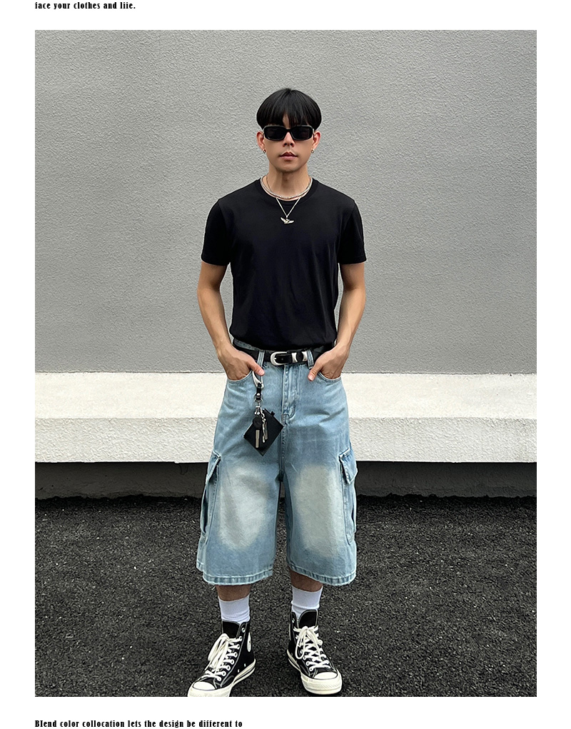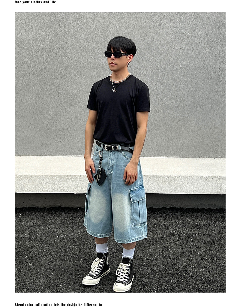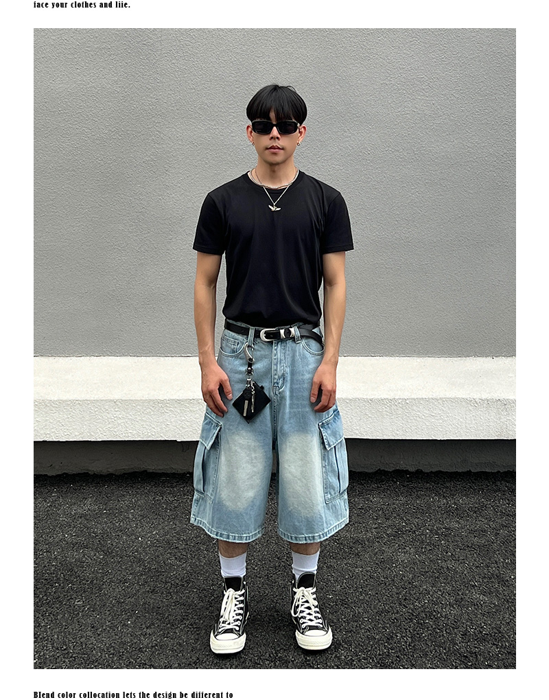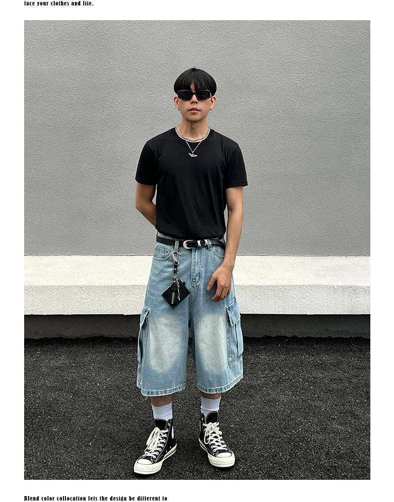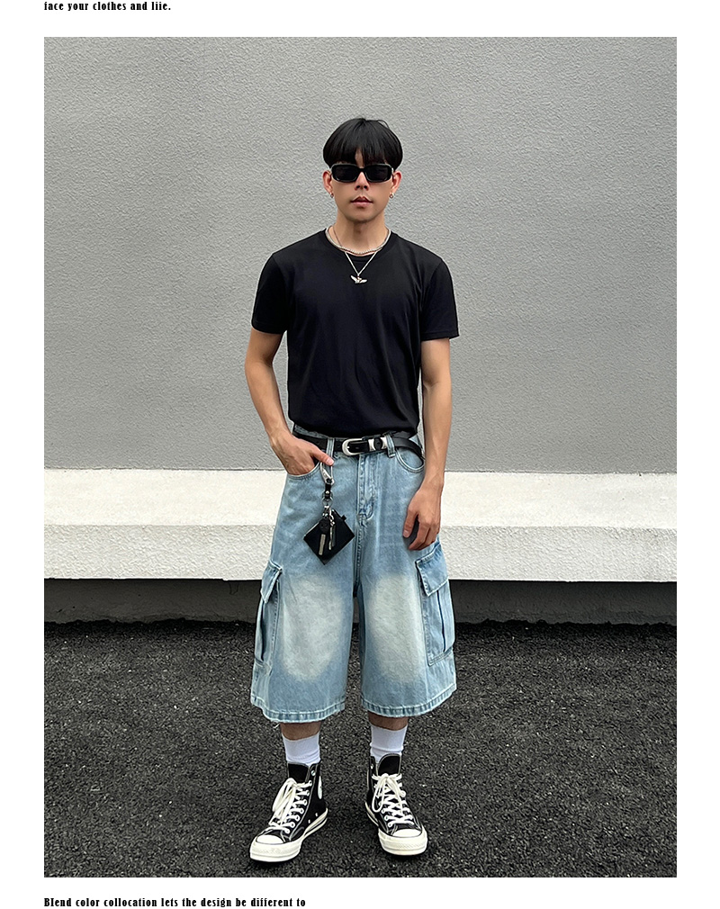 Washed Light Blue Multi-Pocket Wide Leg Denim Half Pants WN19555
