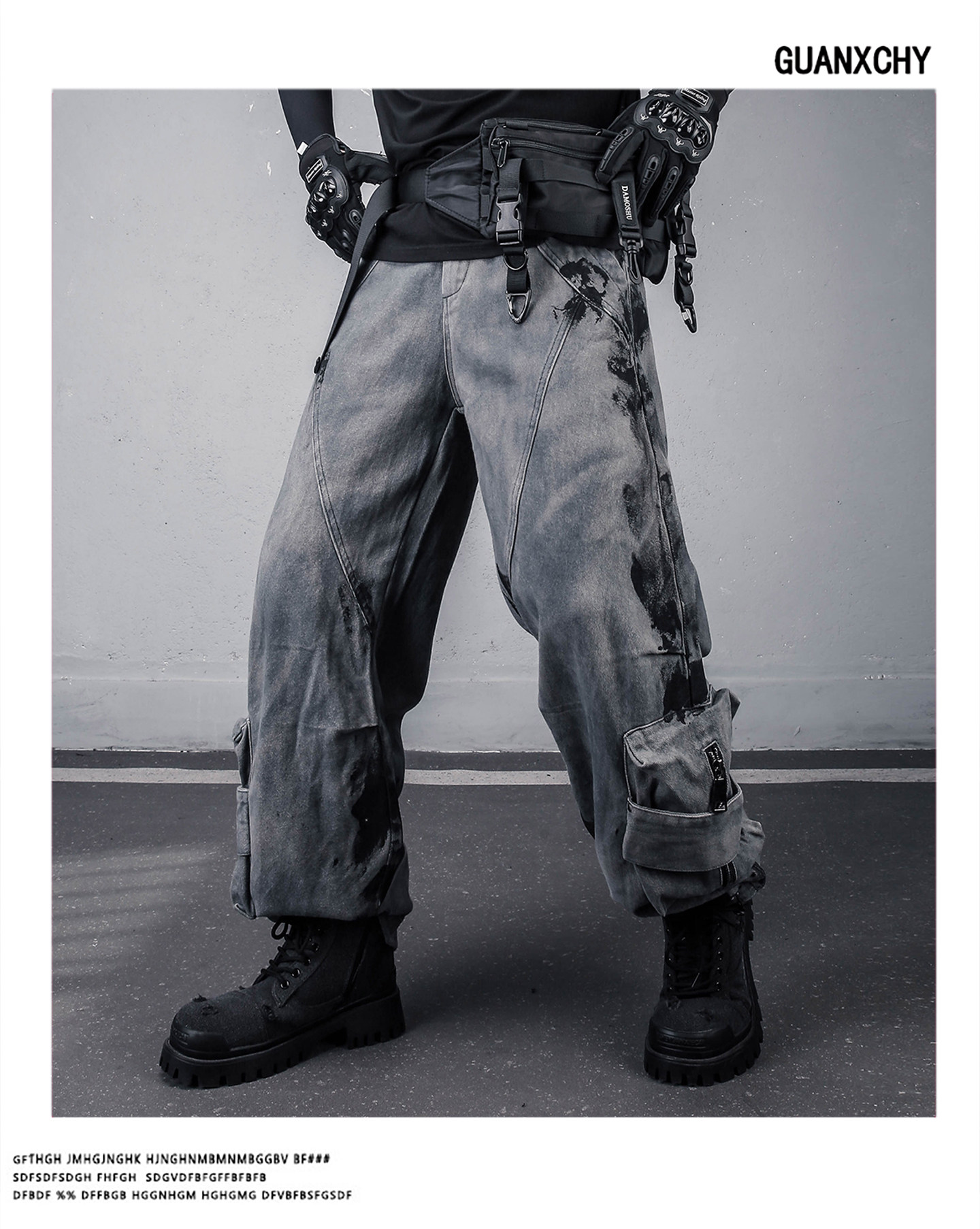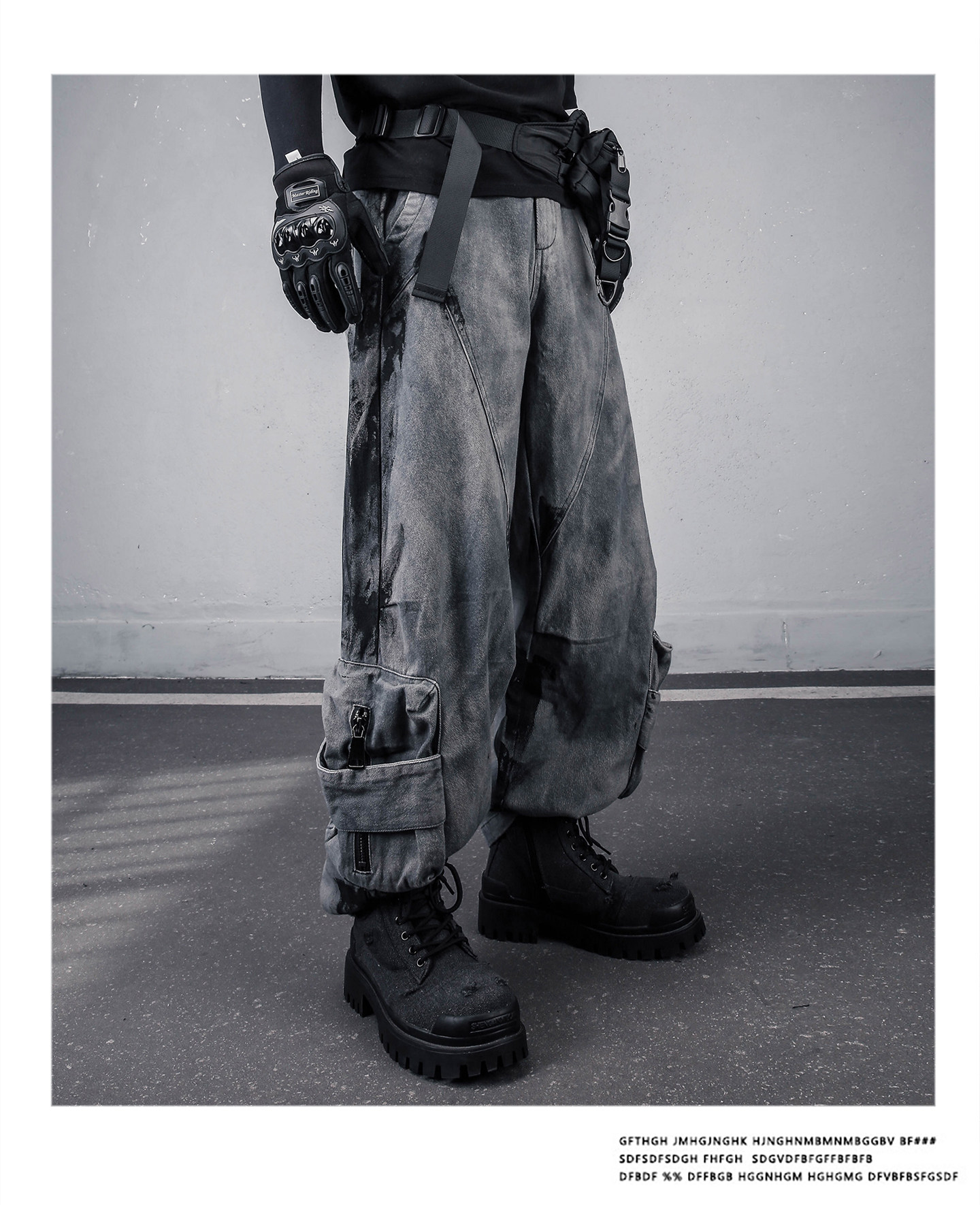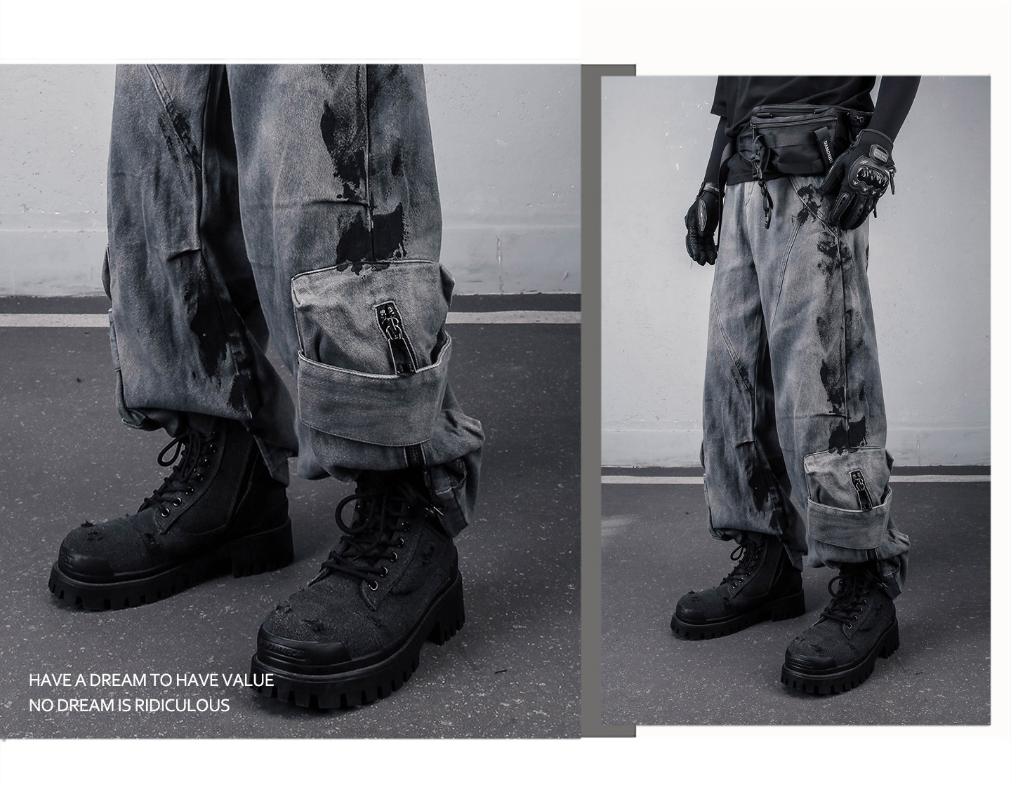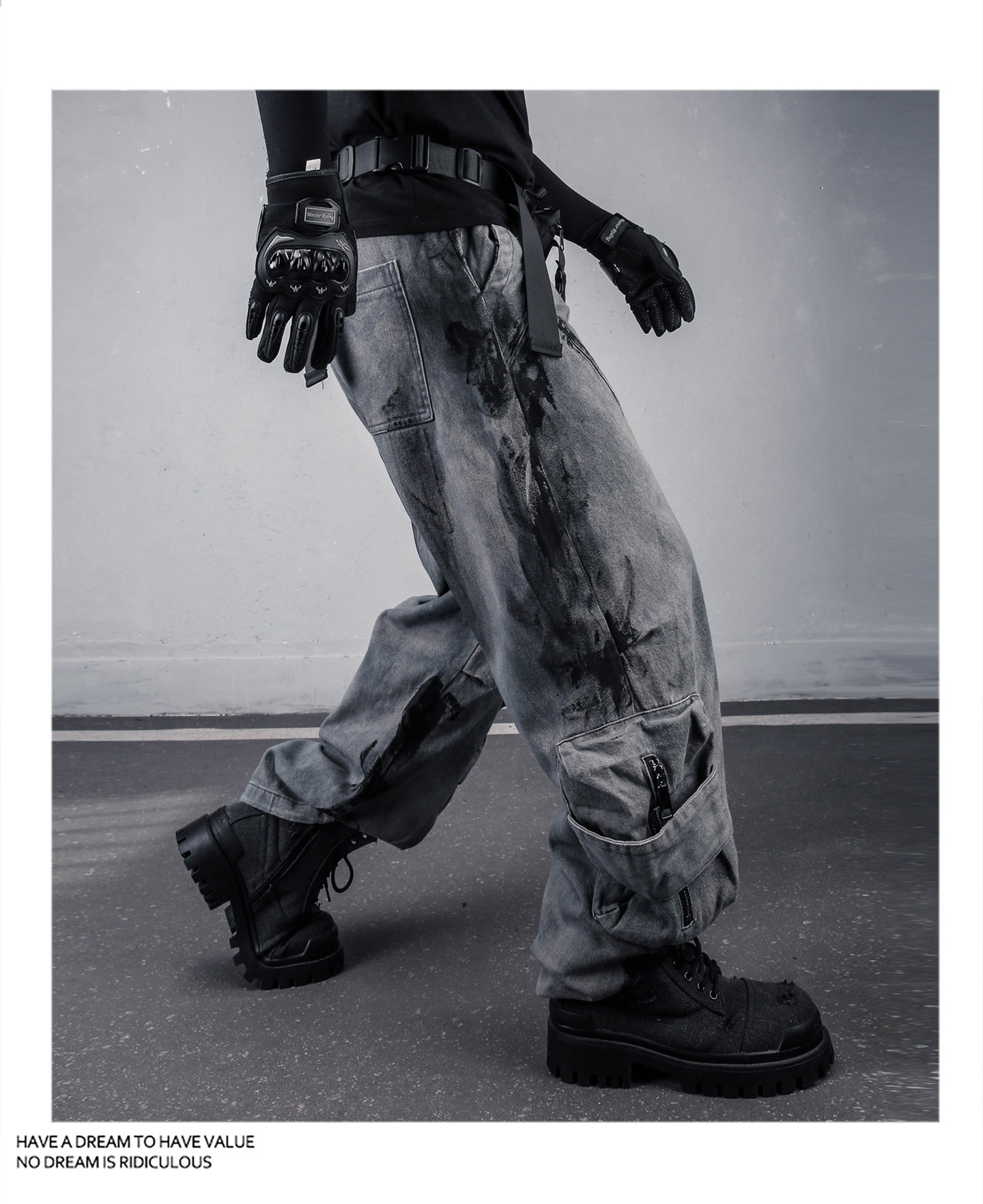 Graffiti Tie-Dye Fleece Lining Wide Leg Cargo Pants WN22463