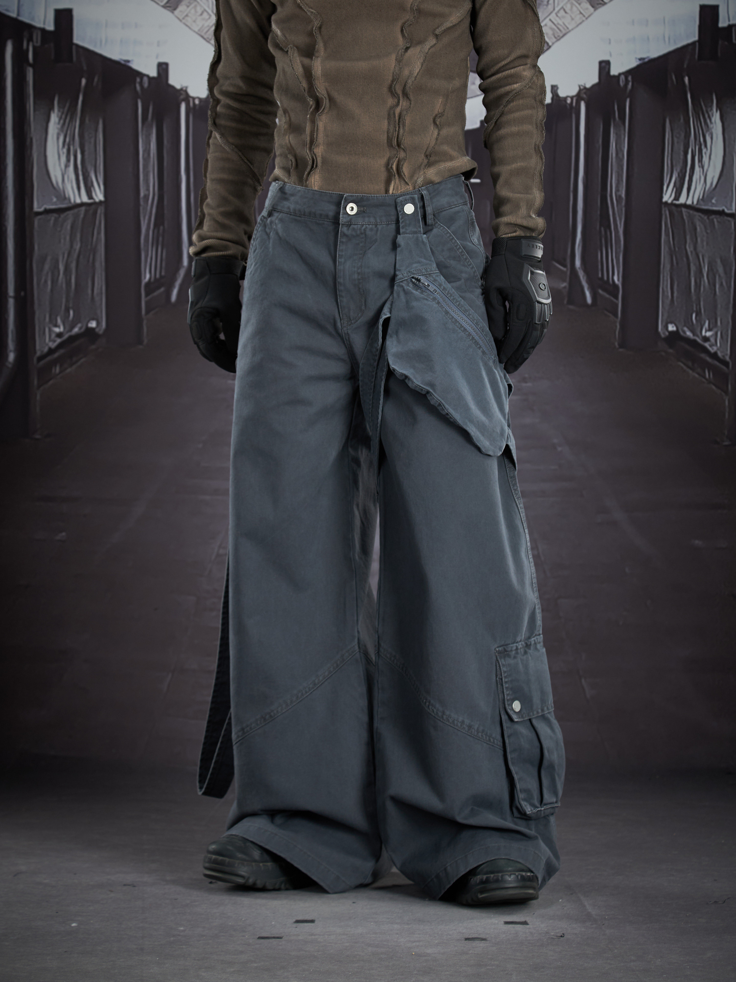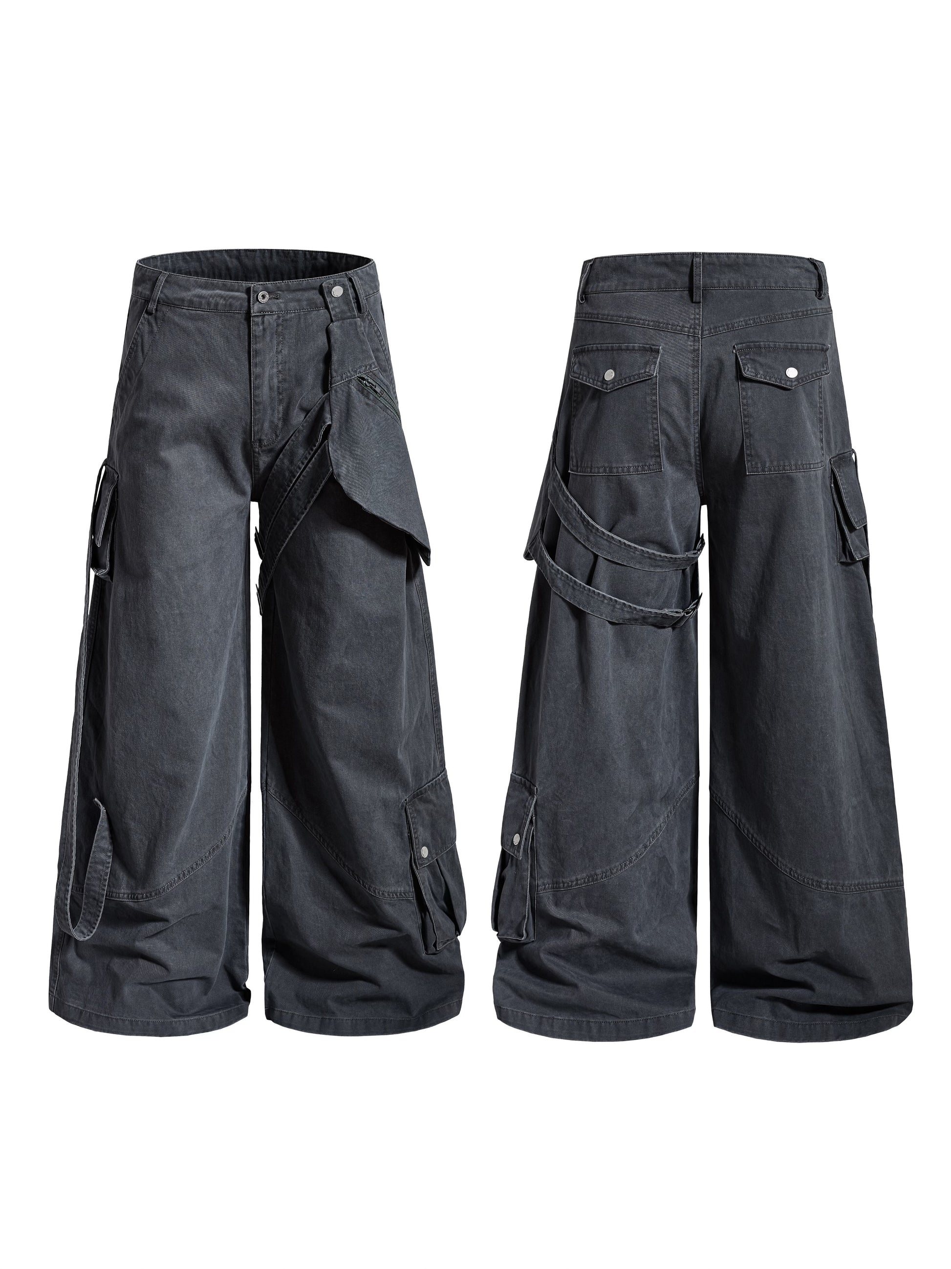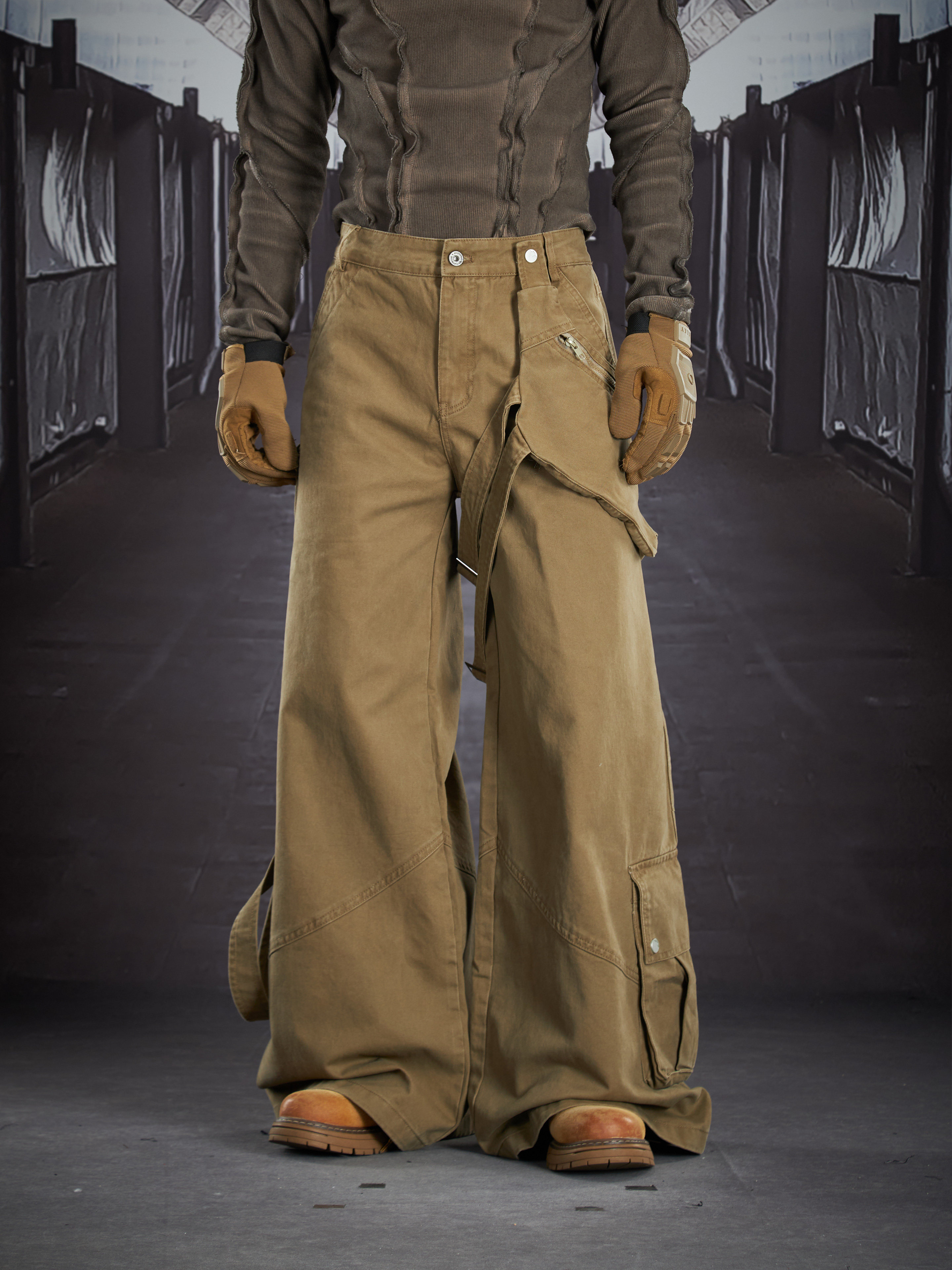 Detachable Hip Bag Ribbon Patchwork Multi Pocket Straight Cargo Pants WN22915