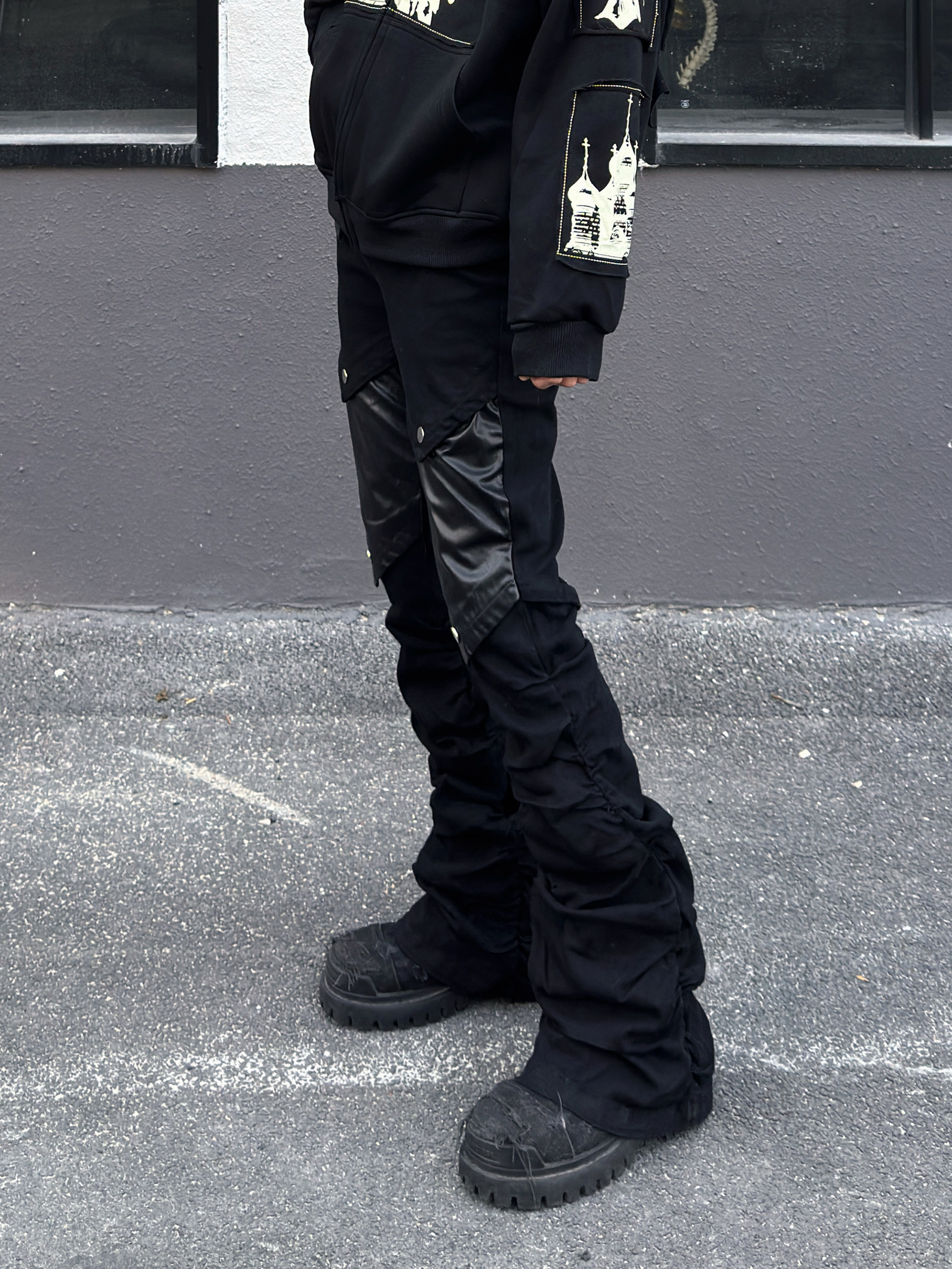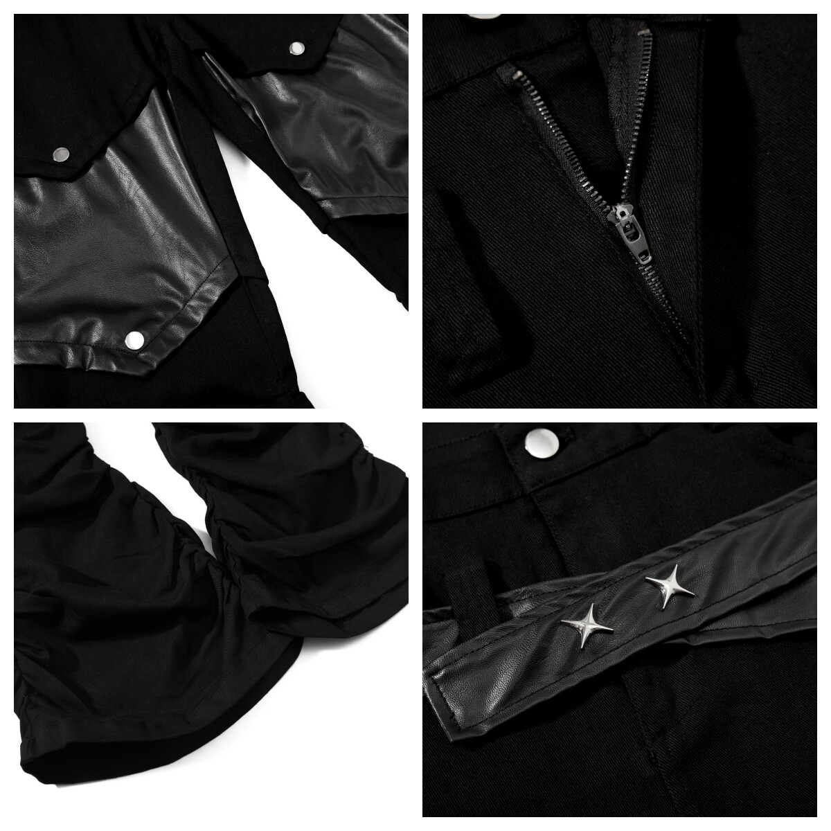PU Leather Patchwork Pleats Flare Cargo Pants WN23015