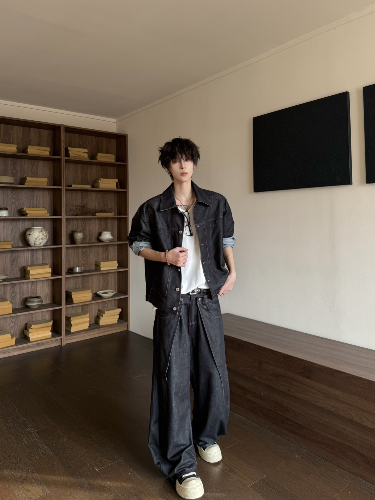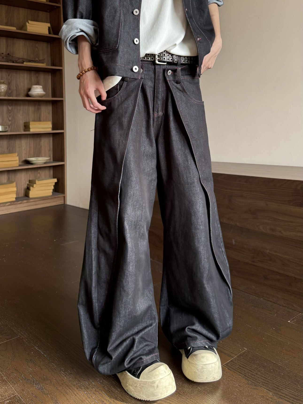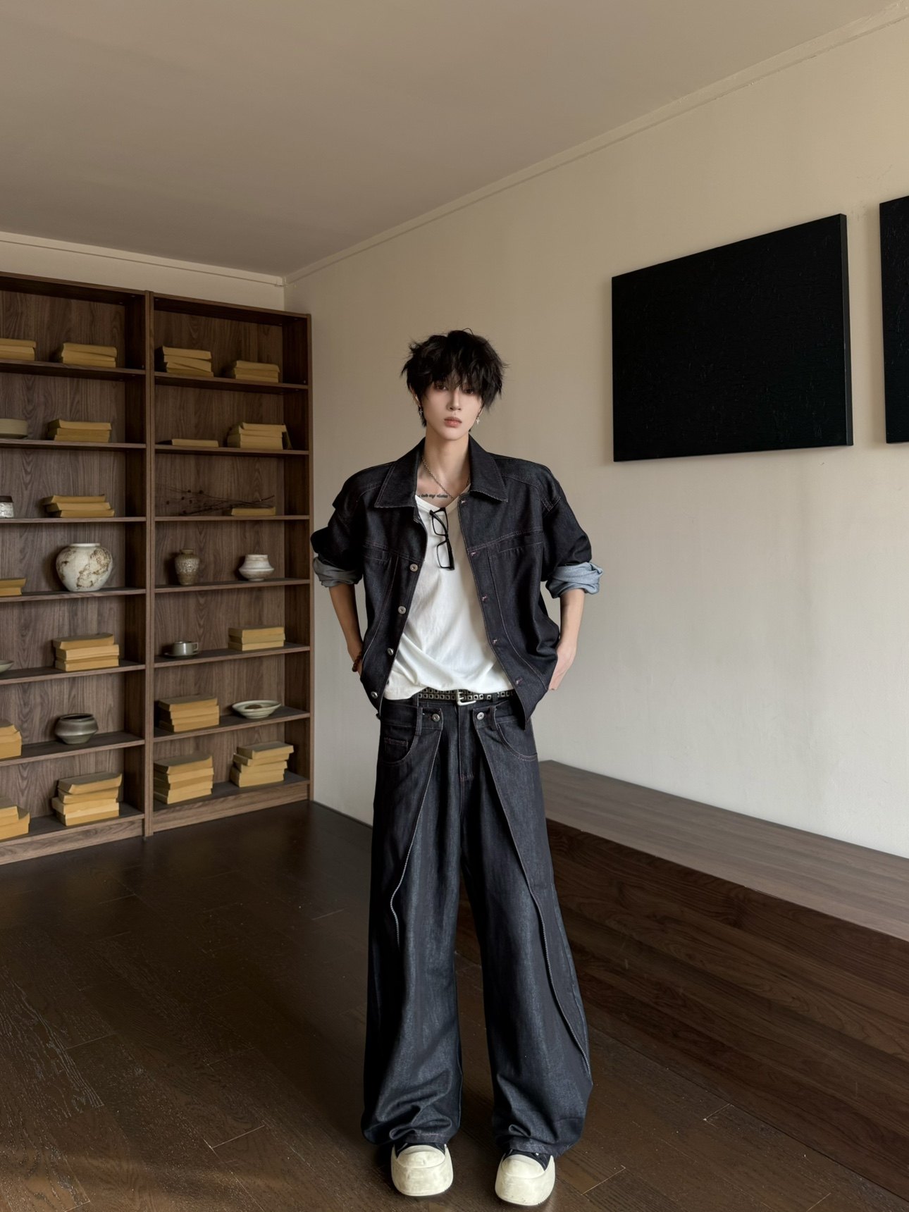 Deconstructed Shoulder-Pad Denim Jacket & Curved Denim Jeans Setup WN23171