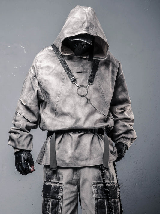 Wash Damage Raw Edge High-Neck Hooded Jacket WN22331