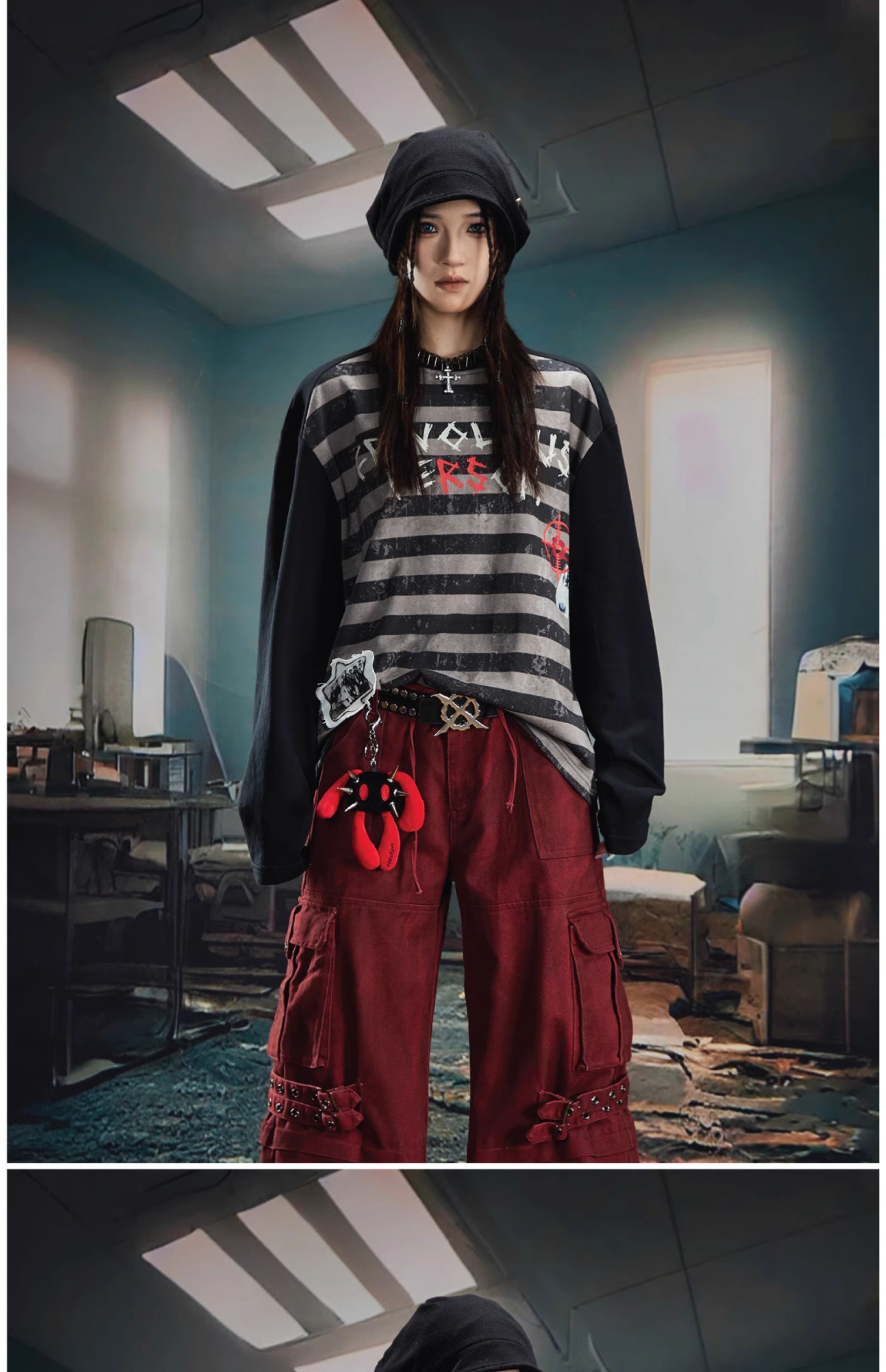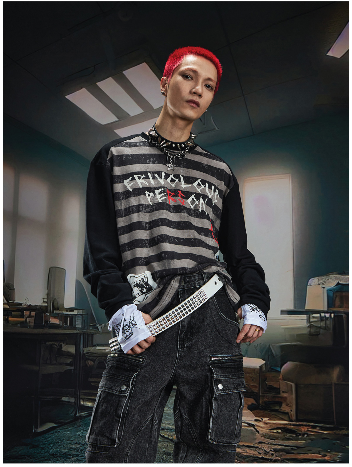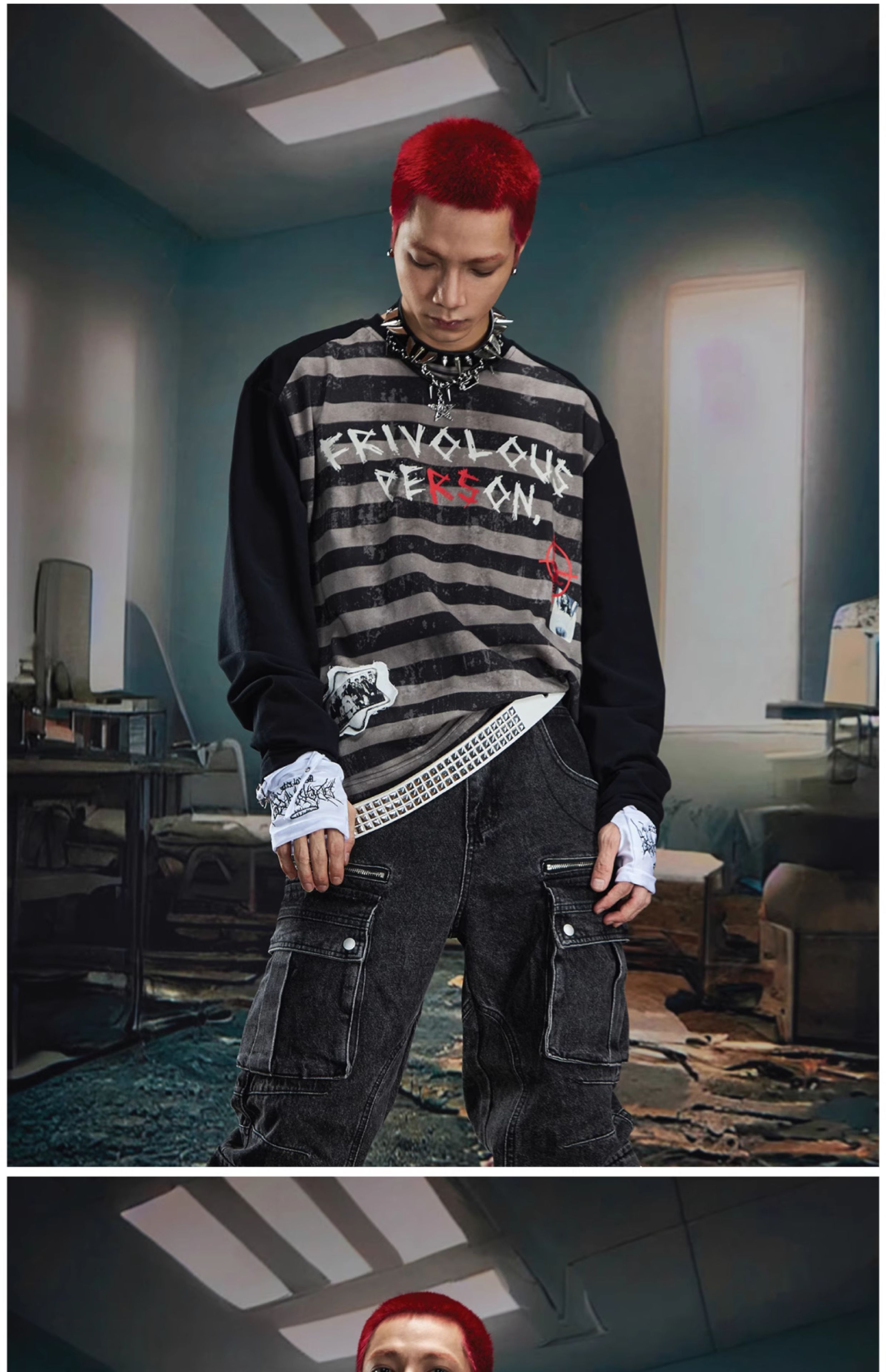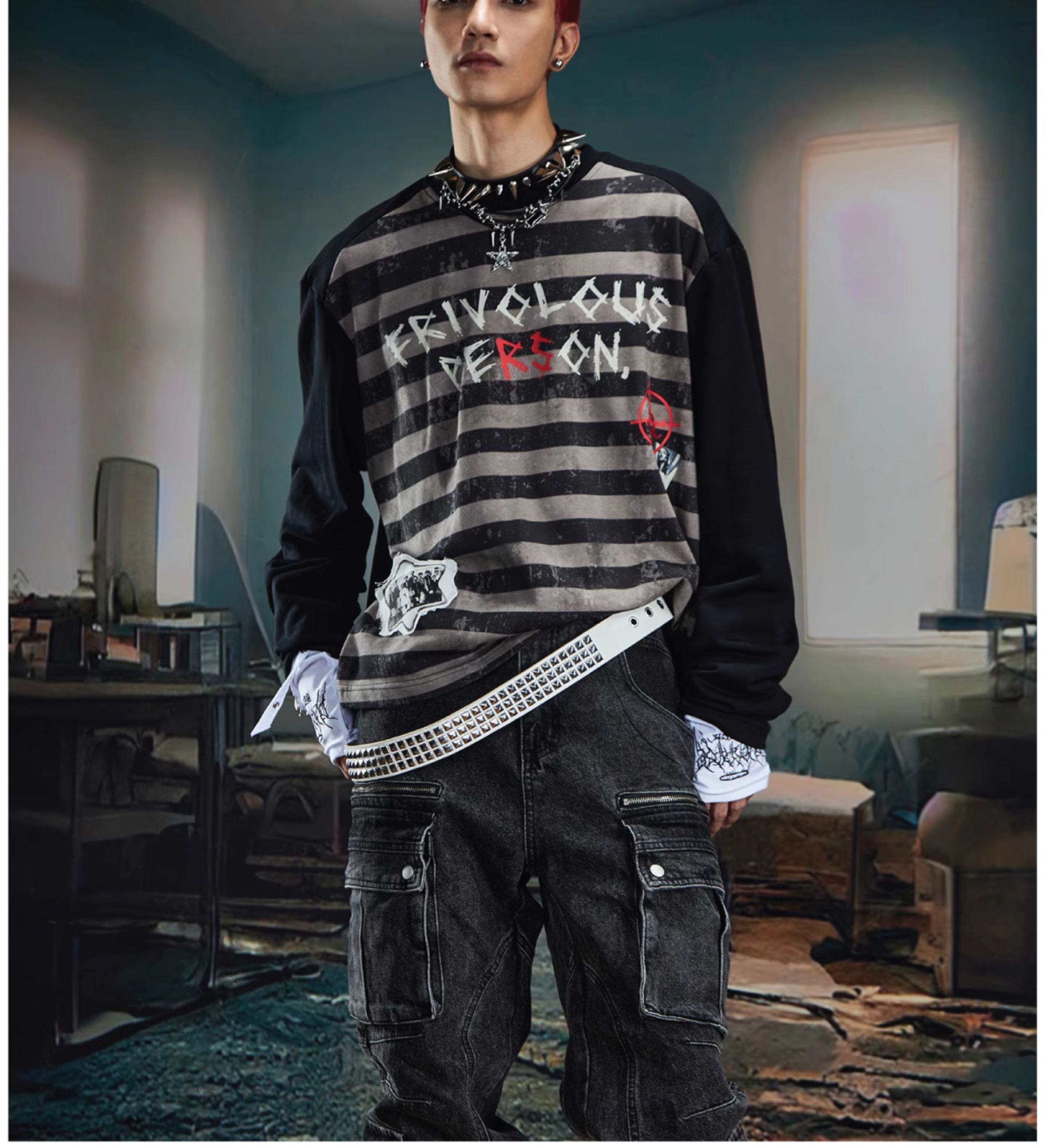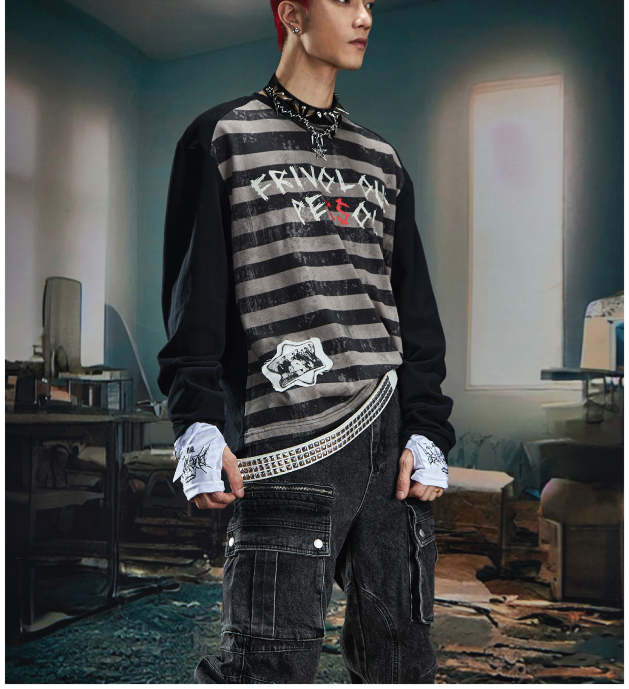 Graffiti Letter Print Stripe Long Sleeve T-Shirt WN20561