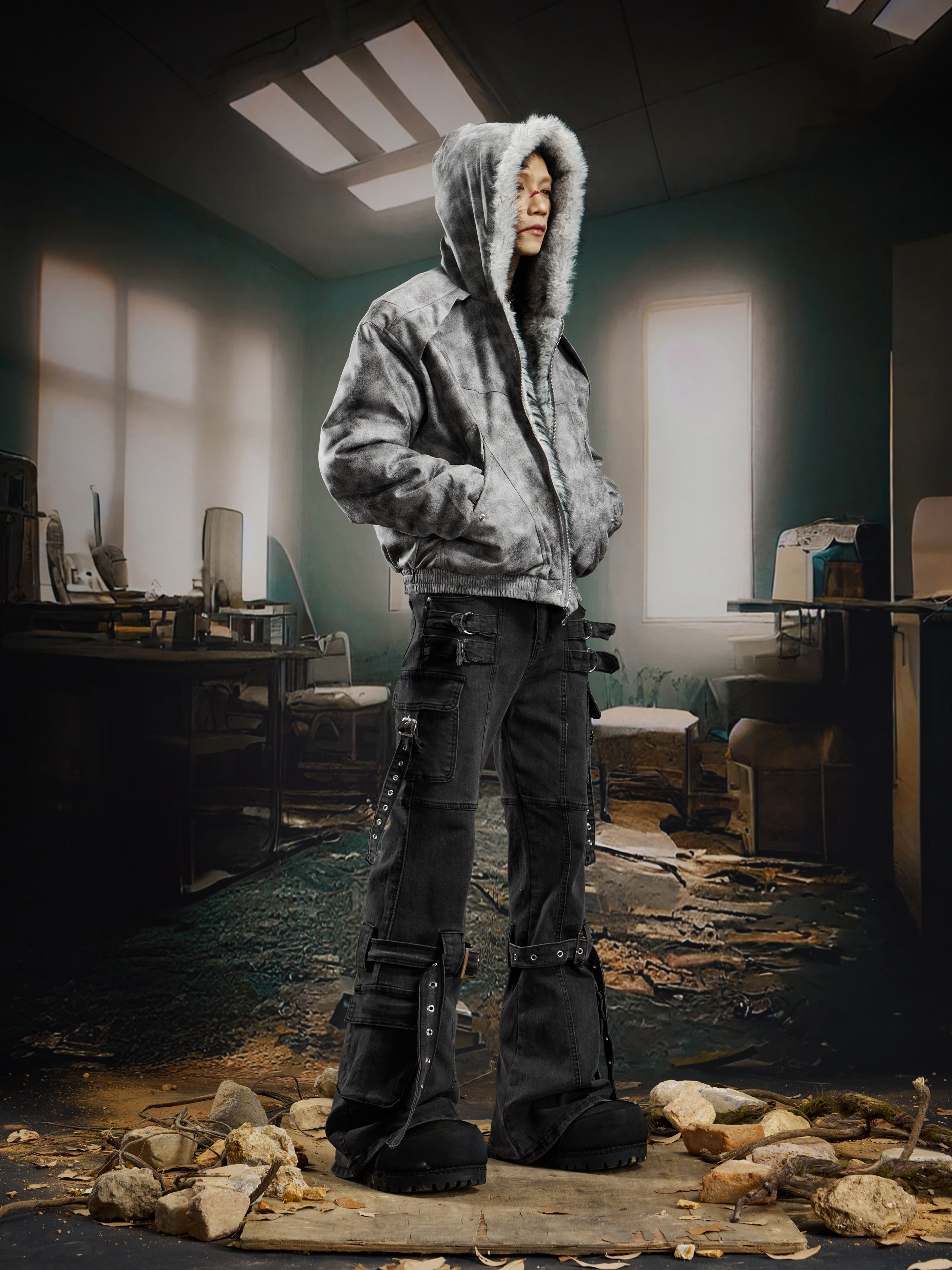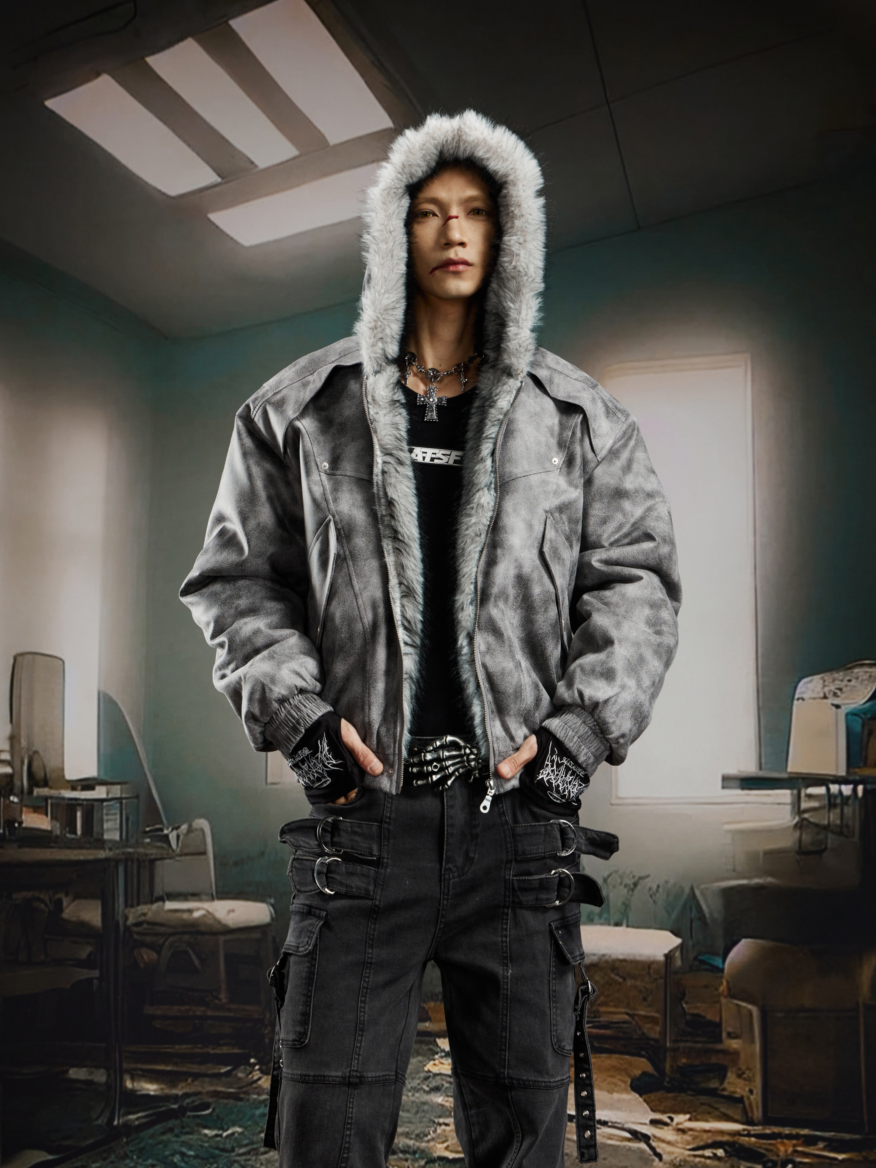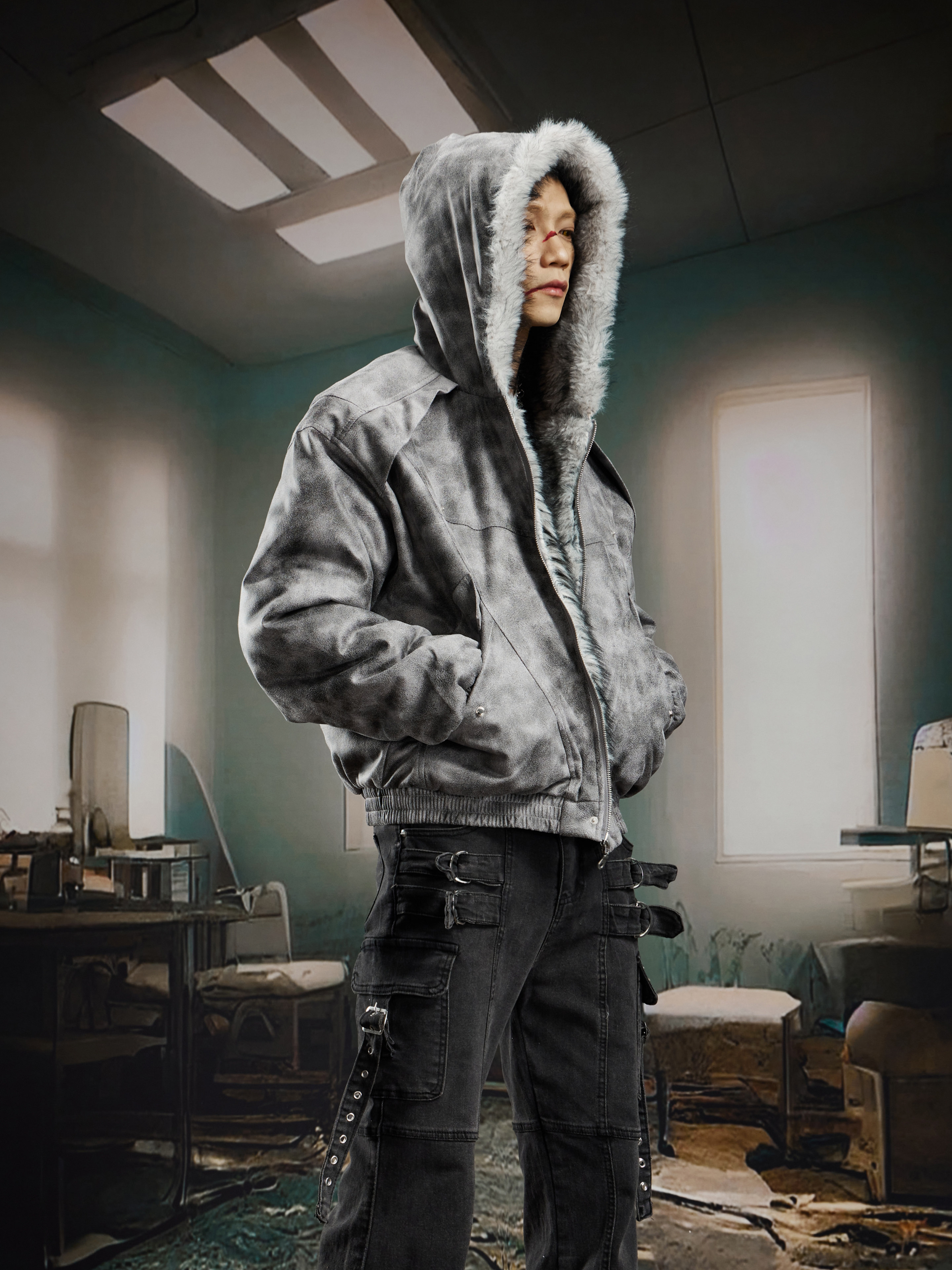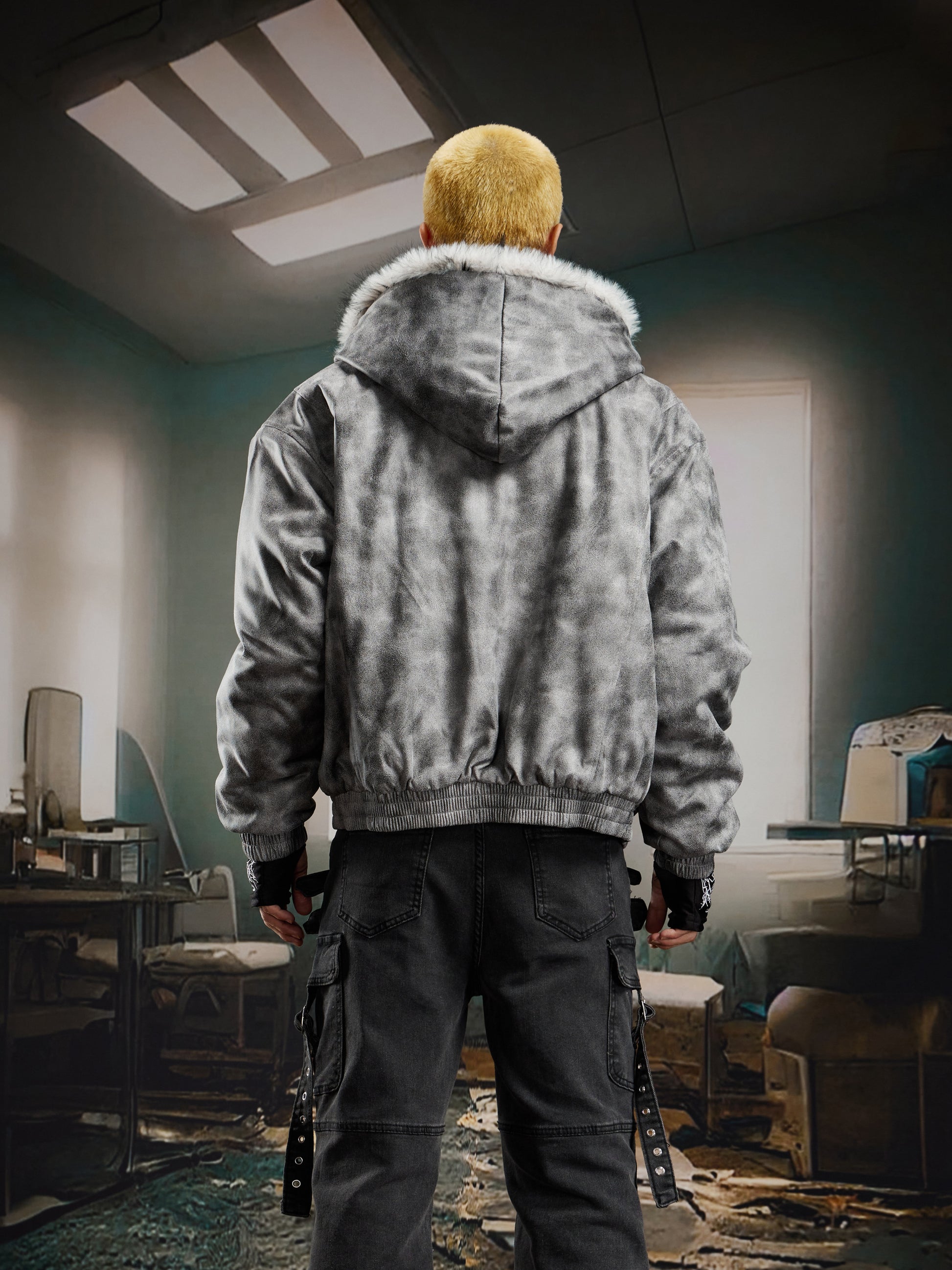 Washed Tie-Dye Suede Studded Fake Fur Hooded Puffer Jacket WN22756