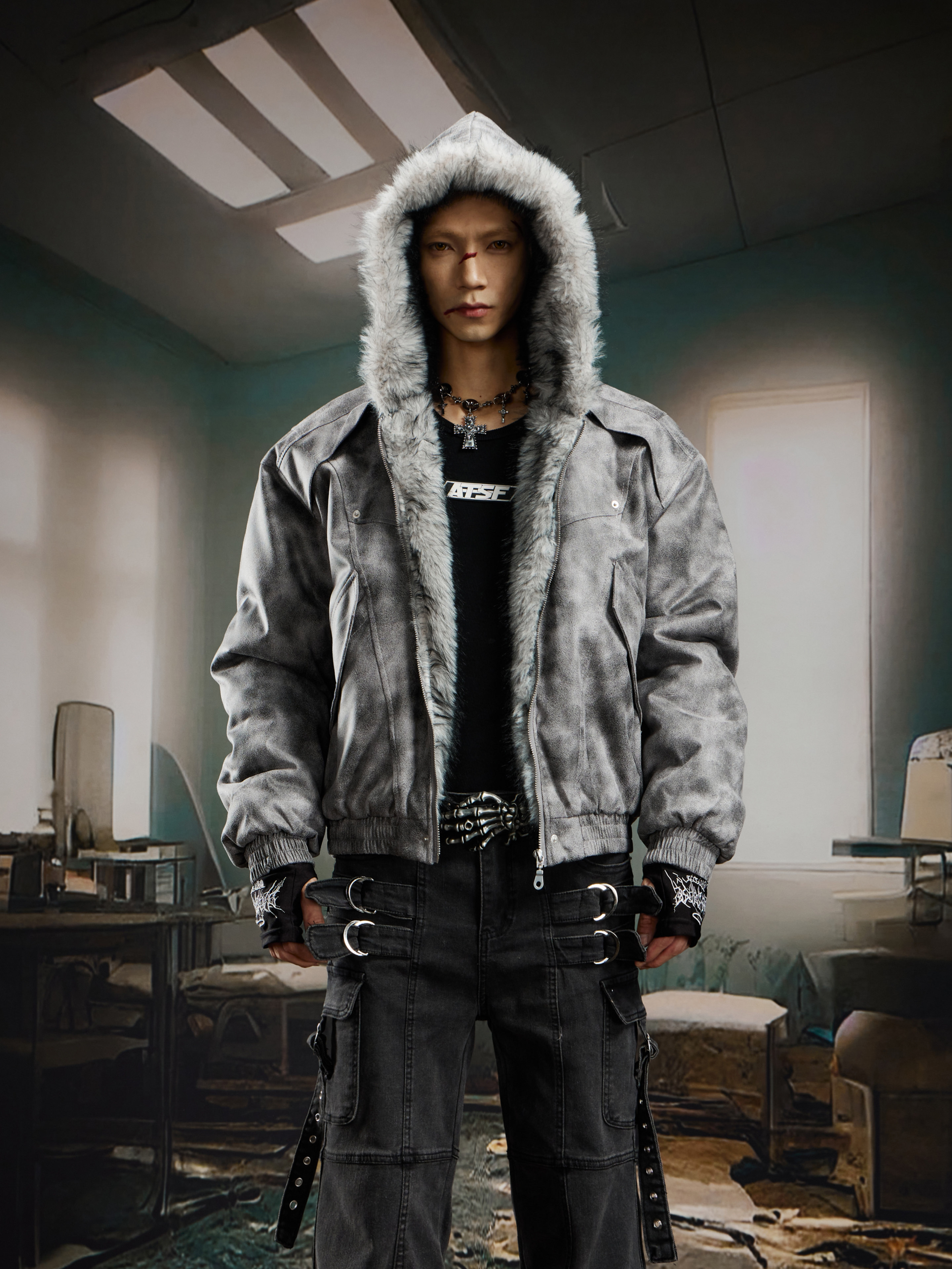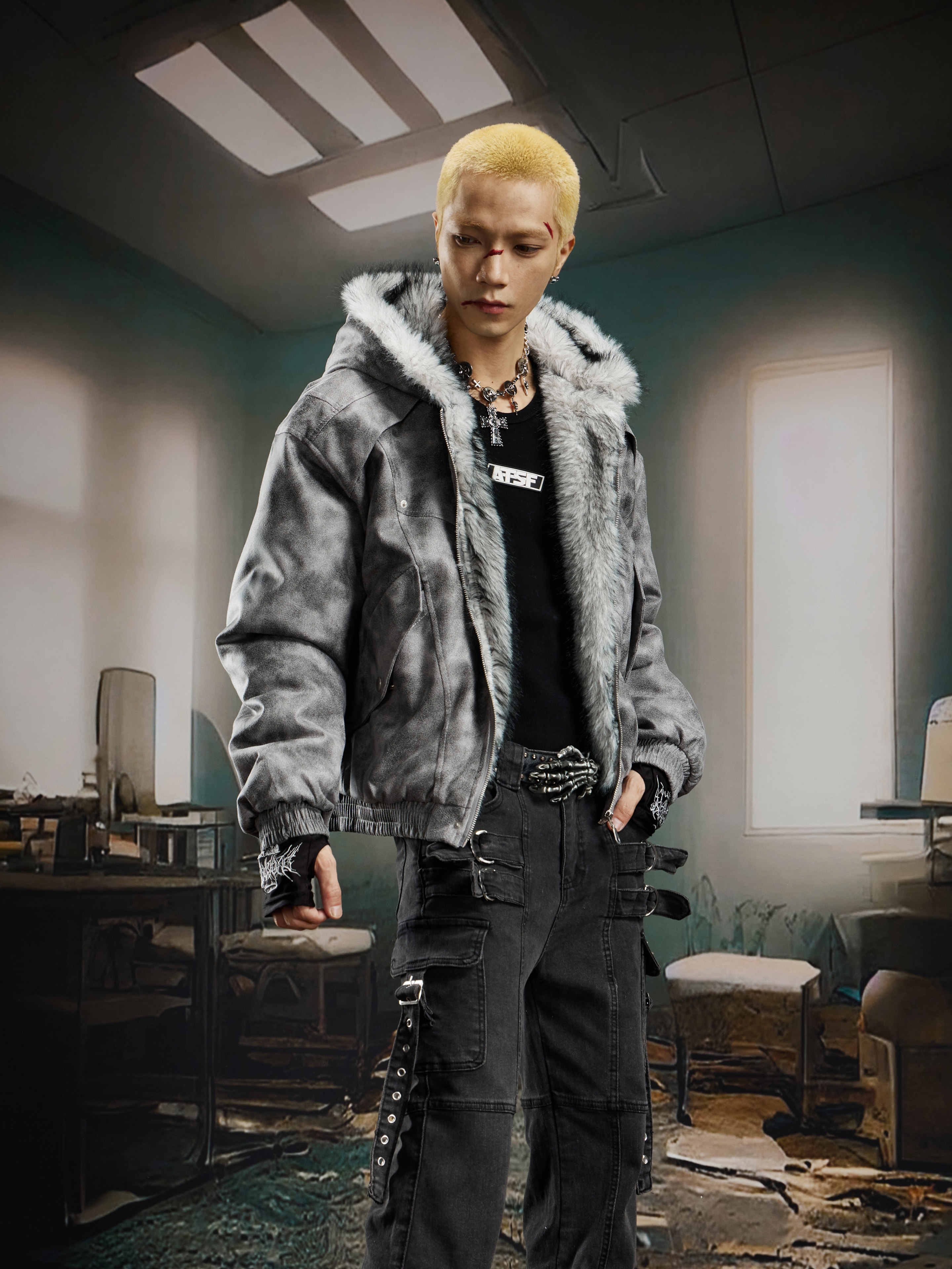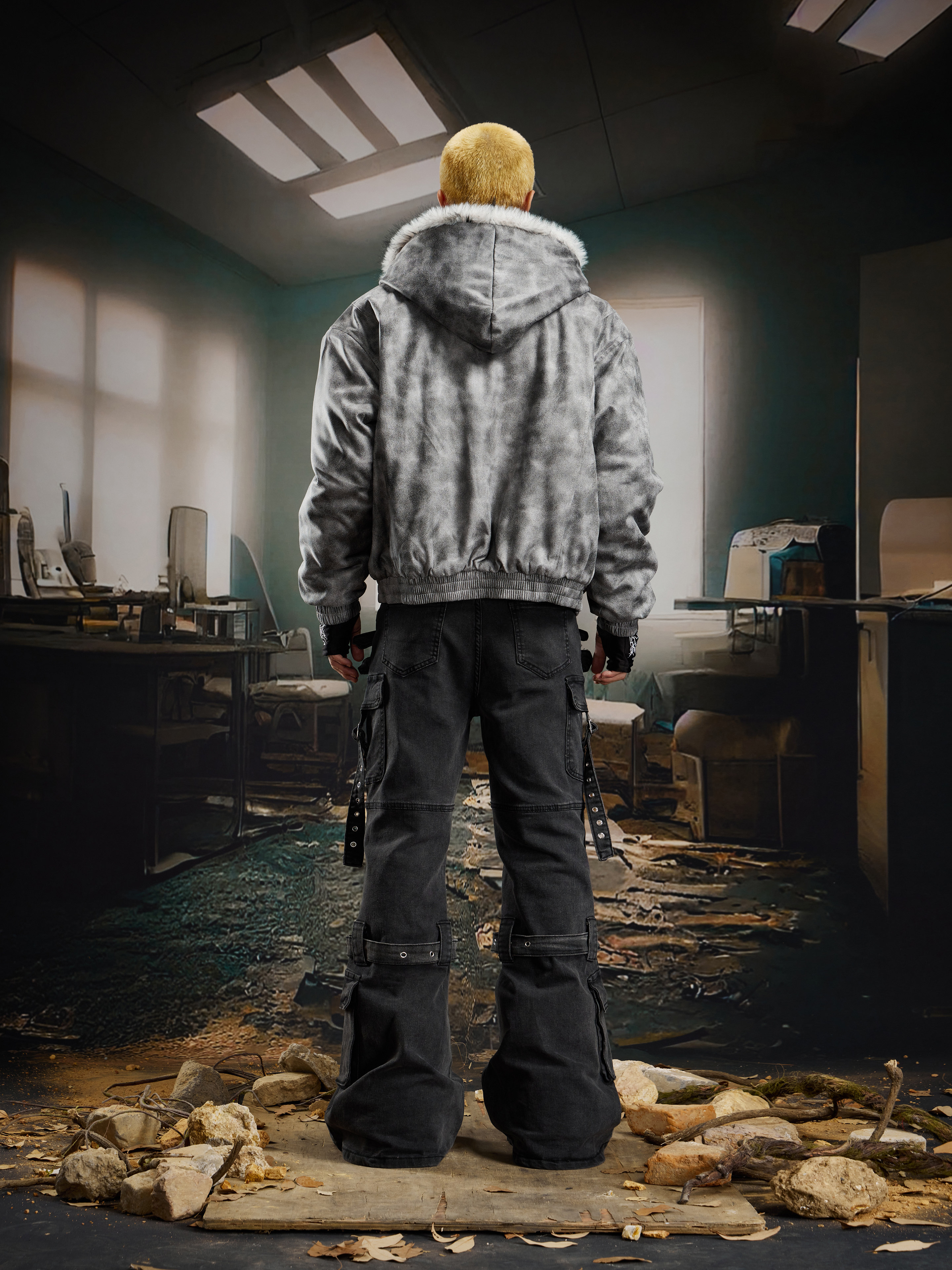 Washed Tie-Dye Suede Studded Fake Fur Hooded Puffer Jacket WN22756