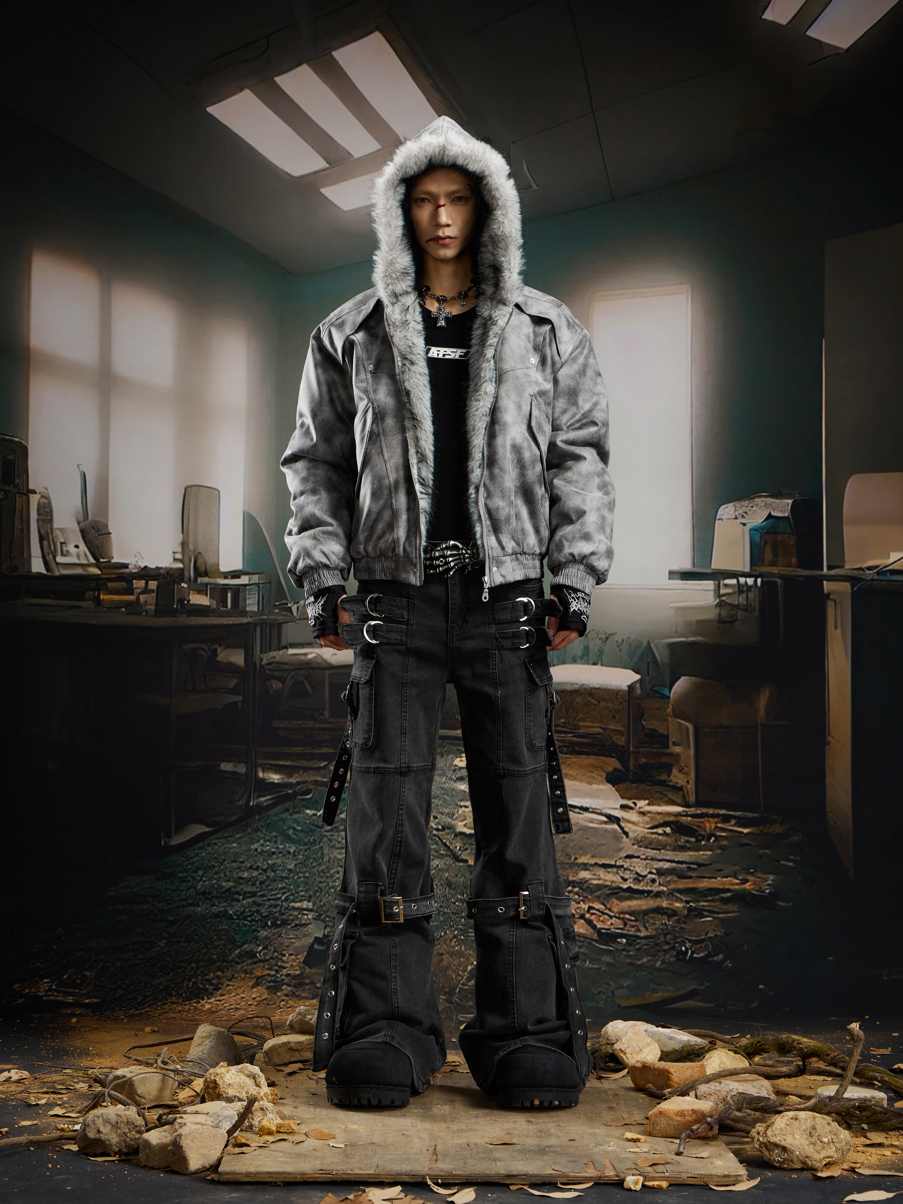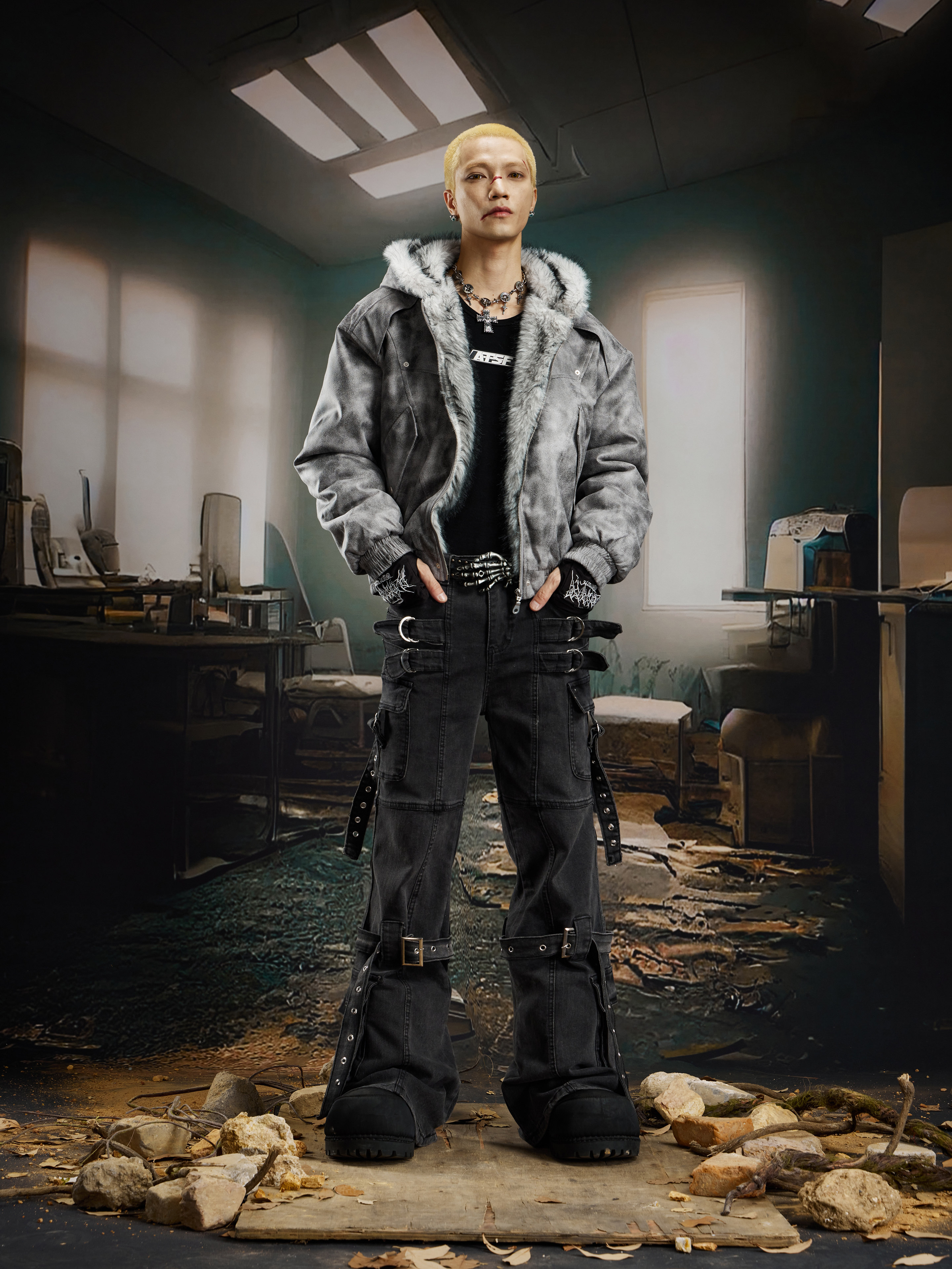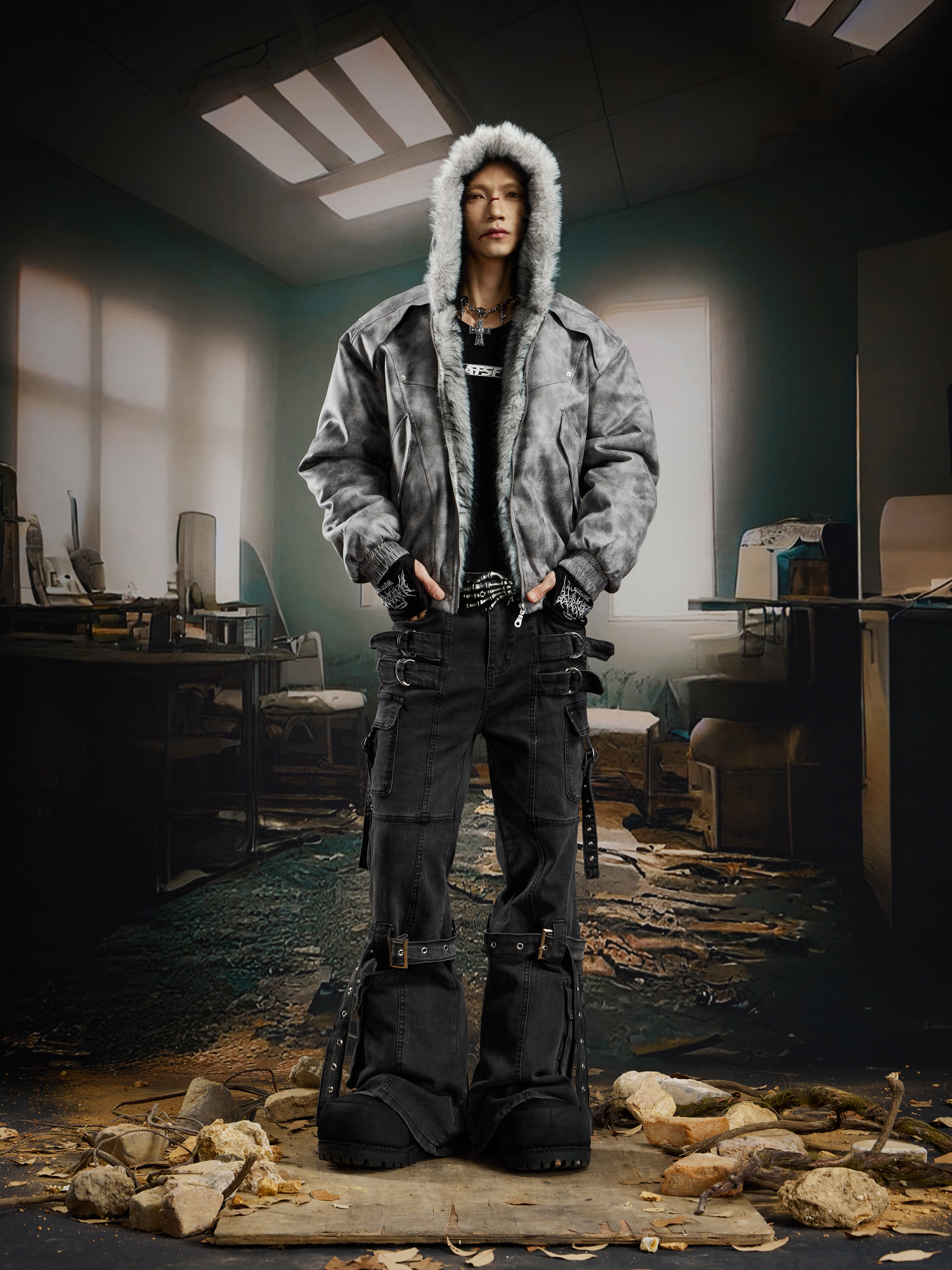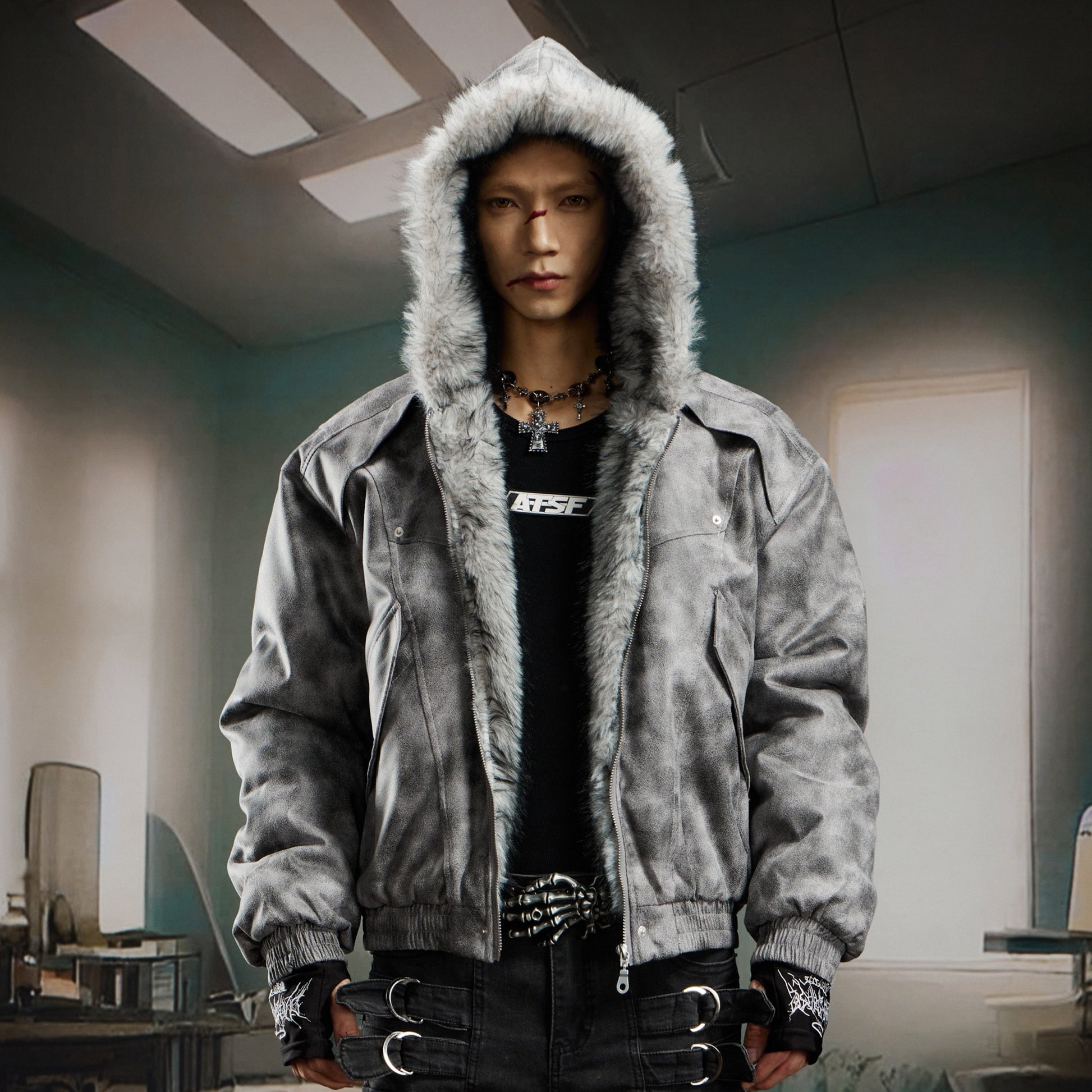 Washed Tie-Dye Suede Studded Fake Fur Hooded Puffer Jacket WN22756